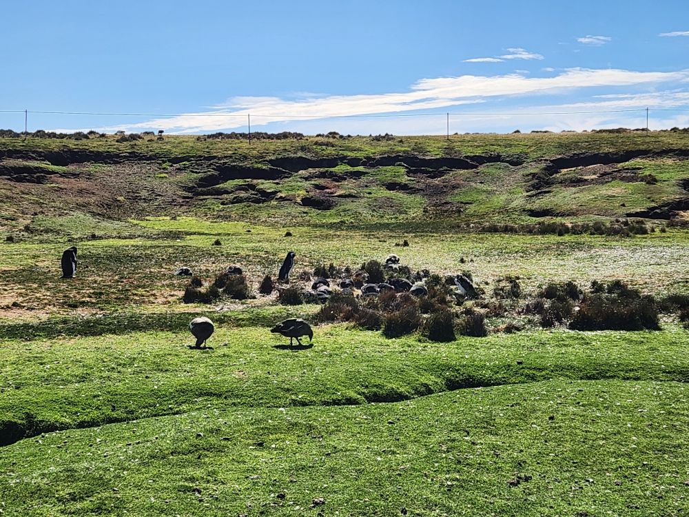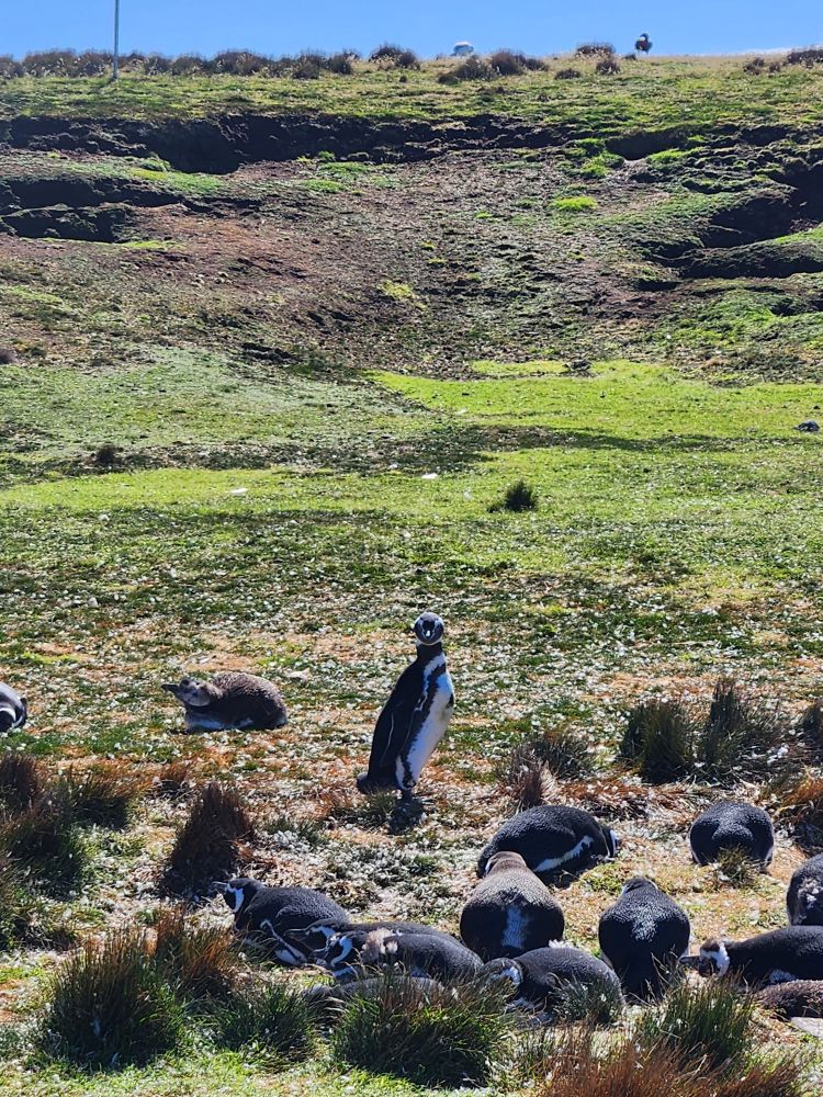 There’s this random guy who is just strolling around the perimeter of the circle in front of the group. Where he’s going, who knows? There are also these random groupings of 3 or 4 penguins, just hanging out in the grass, sunning themselves. Magical!