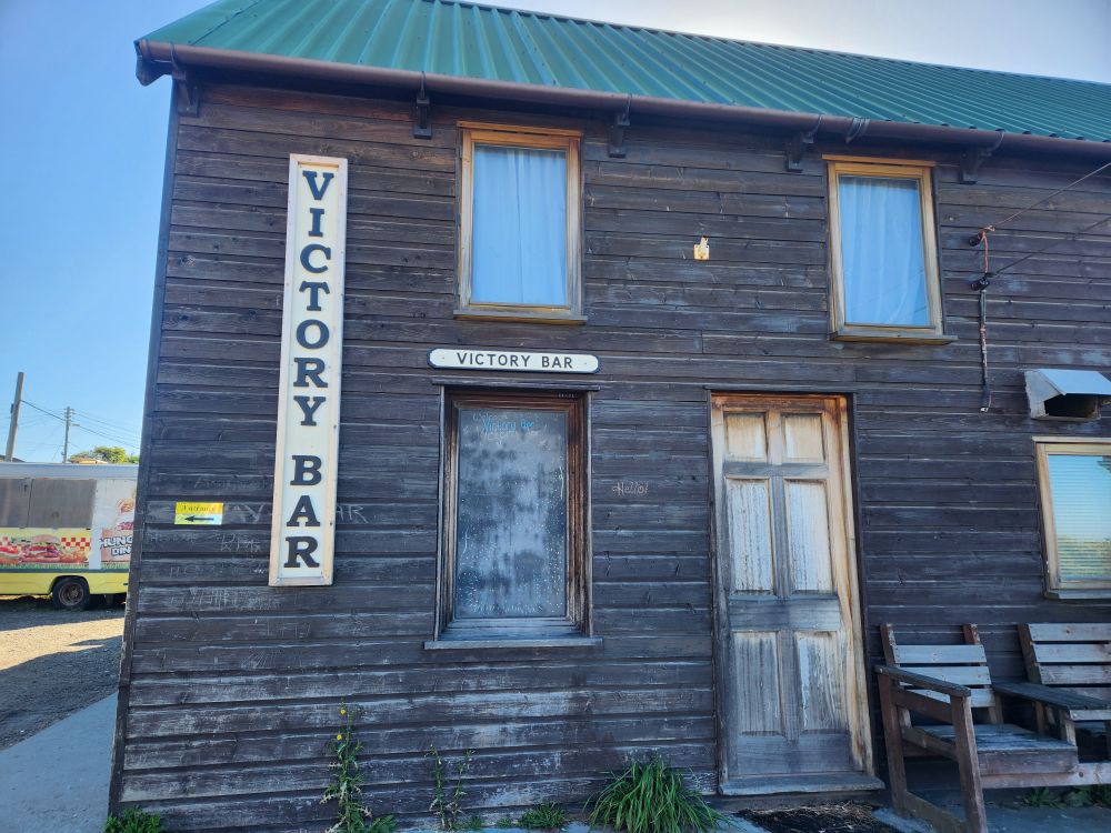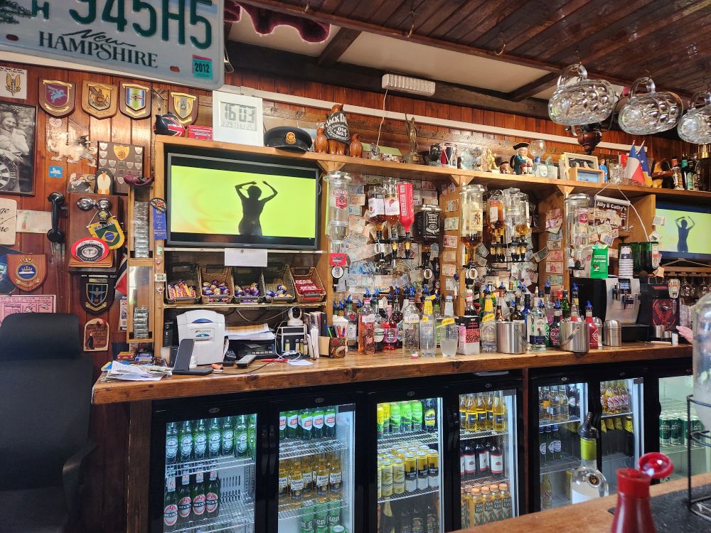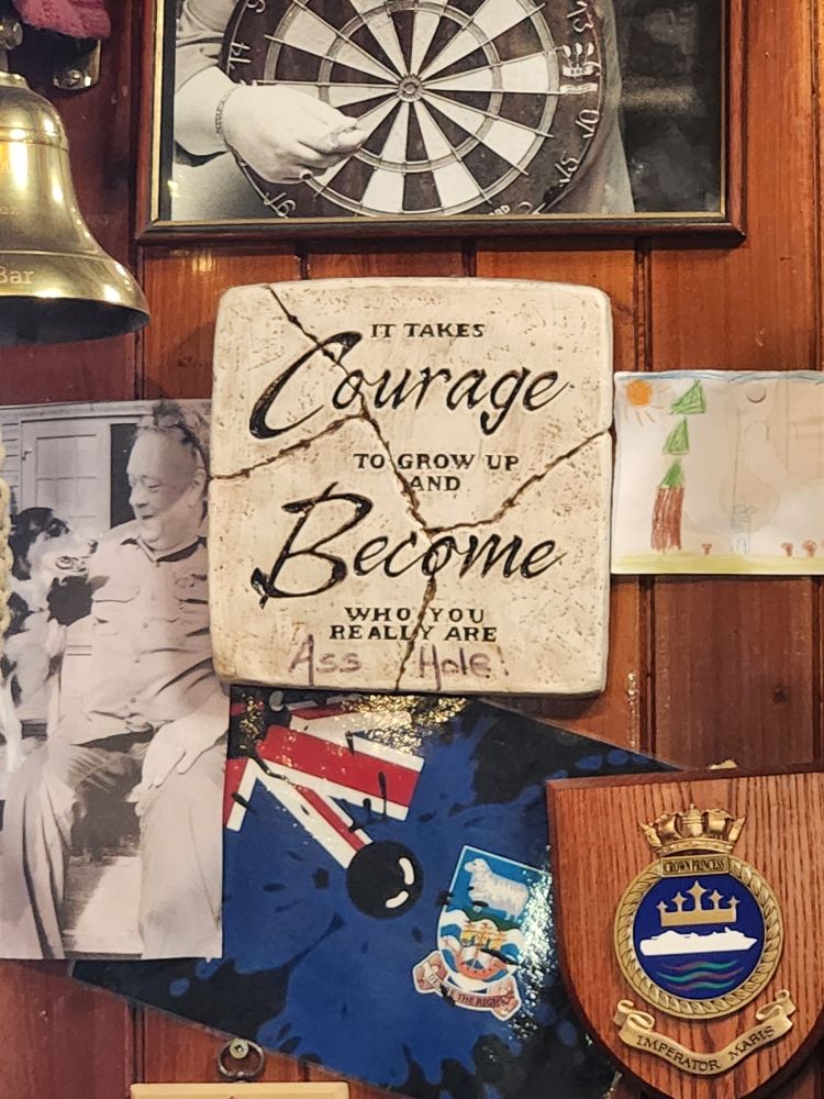 Next we mosey up the road, past the Jubilee Villas, constructed for Queen Victoria’s Golden Jubilee to look just like Victorian row houses, and onto Victoria Pub – where we had lunch 14 years ago when we last visited the island! Interesting fun fact, the owners, Cathy and Ally, were here then – and are very good friends with James, our guide today! So it was sweet to sit at the bar and chat with Cathy about him. The other interesting thing is that they are all out of local beer! And fish and chips, because they have no more flour on the island, according to Cathy. They have had so many cruise ships in this week, the tourists have totally depleted their stocks! Oh well – a beer is a beer, and the wine isn’t local – it’s the great Chilean Sauv Blanc I love, so, we don’t care! And it’s also a bargain on this little island where prices are inflated. $5 USD for both. Perfect!