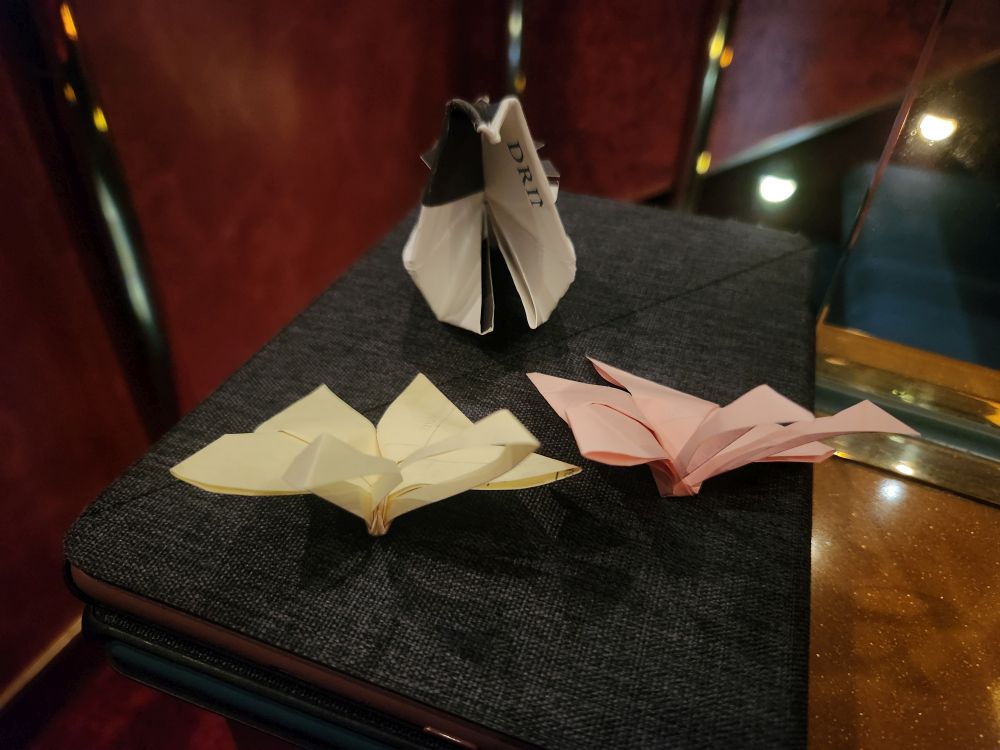 Our routine is shortened tonight because it is so late. We head right to the shower and dinner, where Dade makes us two butterflies and a bird origami. He’s appalled no one has made us any origami yet! Well now they have – and now he is on a hunt for good paper to do real origami, not the left over menus and order note pads which aren’t the right kind of paper. He is too cute!