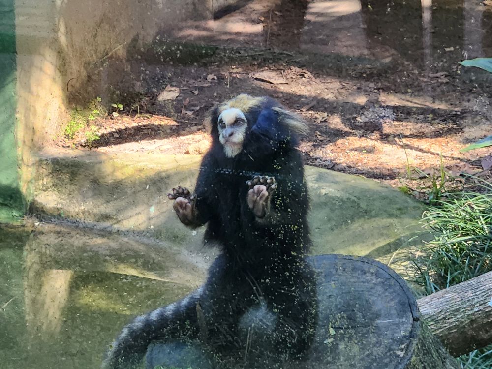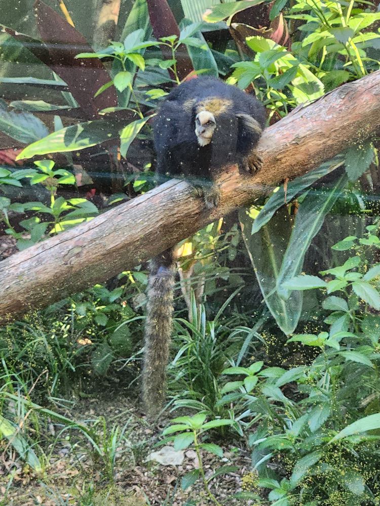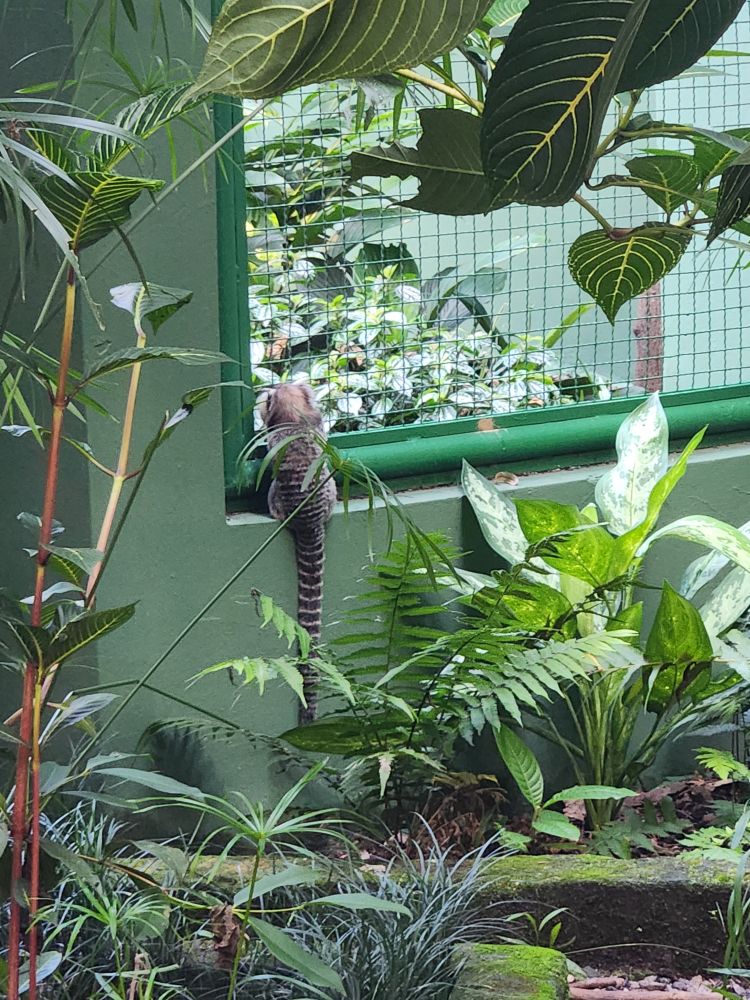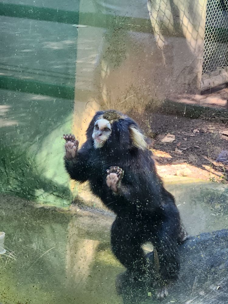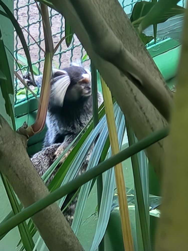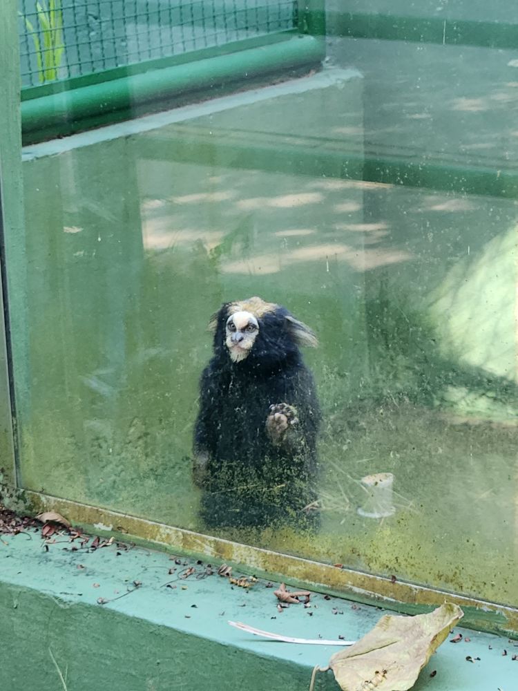 There are cuter little common marmosets in the next cage, and a sweet little “free” marmoset running around, jumping up on the cross hatched fence roofing and staring longingly in the window trying to get in to play with its mates. Sweet. And a whole heck of a lot less scary!