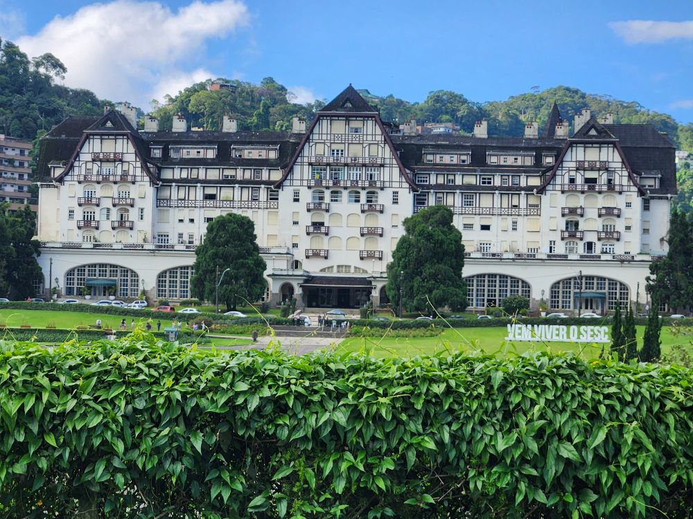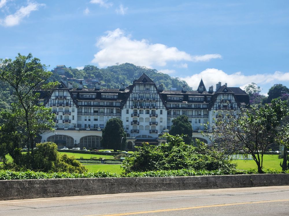 At the entrance to the city, we stop across from the grand hotel and casino, the Quitandinha palace, that was built in 1942, but then gambling was banned in 1944 – so the hotel lost its livelihood and popularity. There is a lake in front of the palace in the shape of Brazil, built to have a water source in case of fire. At one time it was the second most famous hotel in Brazil, following the Copacabana Palace. Today it is a mix of commercial and residential facilities. Its façade is beautiful, a tourist attraction in and of itself, and great for a photo stop!