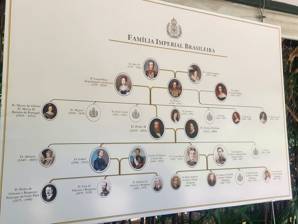 Continuing into town, we manage to park a little way up from the Imperial Palace, our first destination, and walk back through the pretty town in much more temperate weather than down below in Rio. It’s still hot, but not as oppressively humid, and there is a lovely breeze. At the palace, we walk through the courtyard, stopping at a large display that visually explains the Imperial Family tree. Lais talks us through all the 3 Emperors, Princess Isabel and the Braganca family, all who play important roles in the history of Brazil. There is also a famous photograph of the Imperial Family from 1889, right before they were forced to leave the country (explanation below).