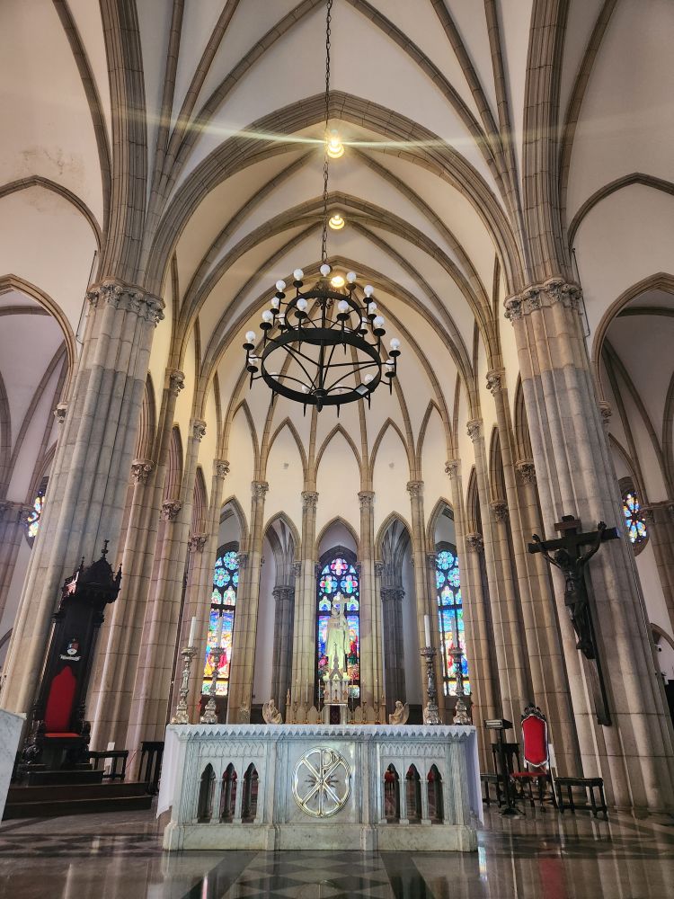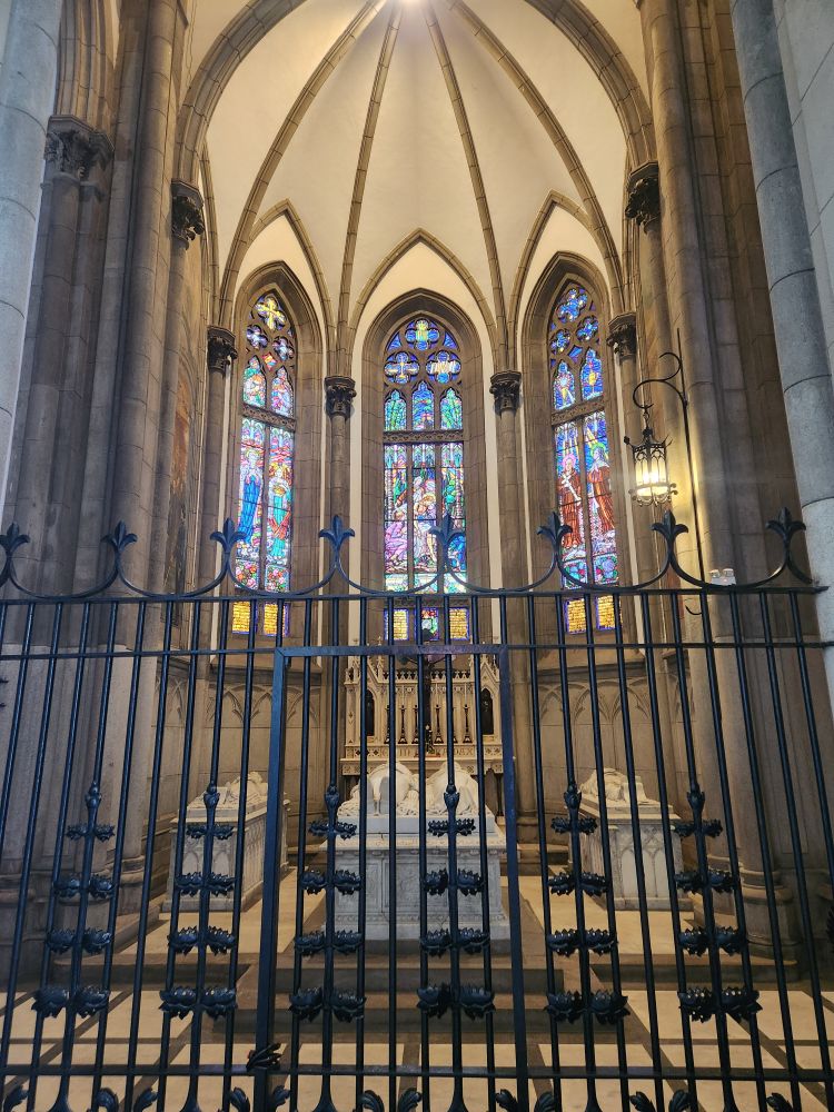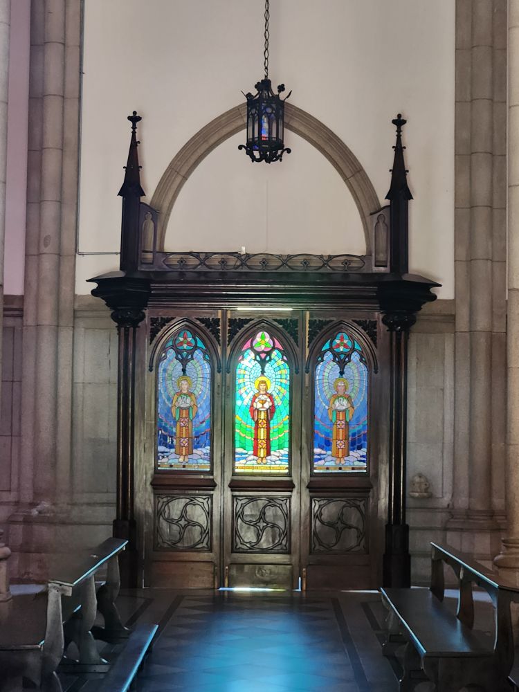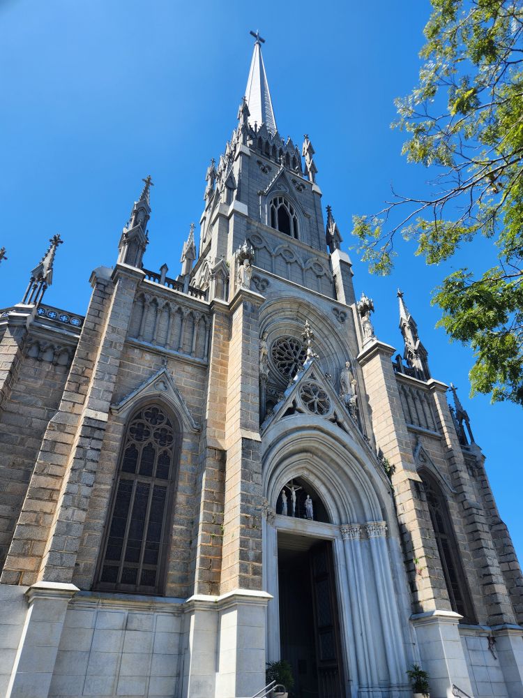 Back outside we wander through the outdoor displays with one of the first locomotives to be used on the railroad here, then make our way to the Cathedral of St. Peter of Alcantara, the Neo-Gothic Roman Catholic cathedral built over a span of 40 years and the final resting place of Dom Pedro II and his family. An incredibly beautiful building with soaring pointed arch ceilings, fabulous stained glass windows and the tombs of the Imperial family in a chapel immediately inside the front entrance.