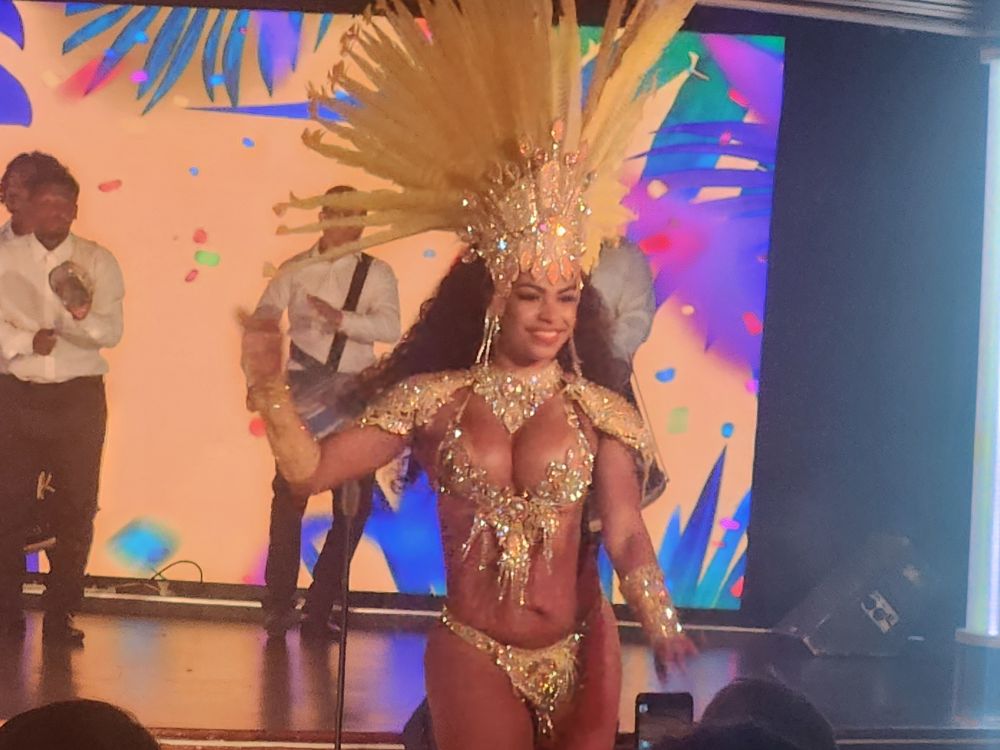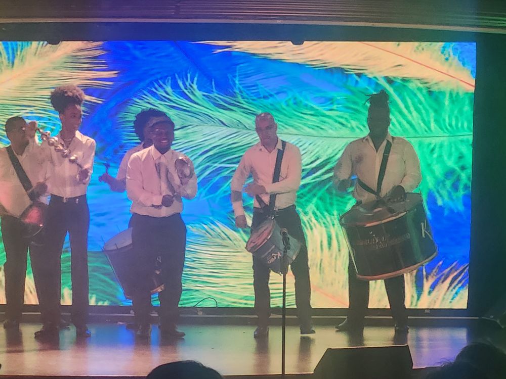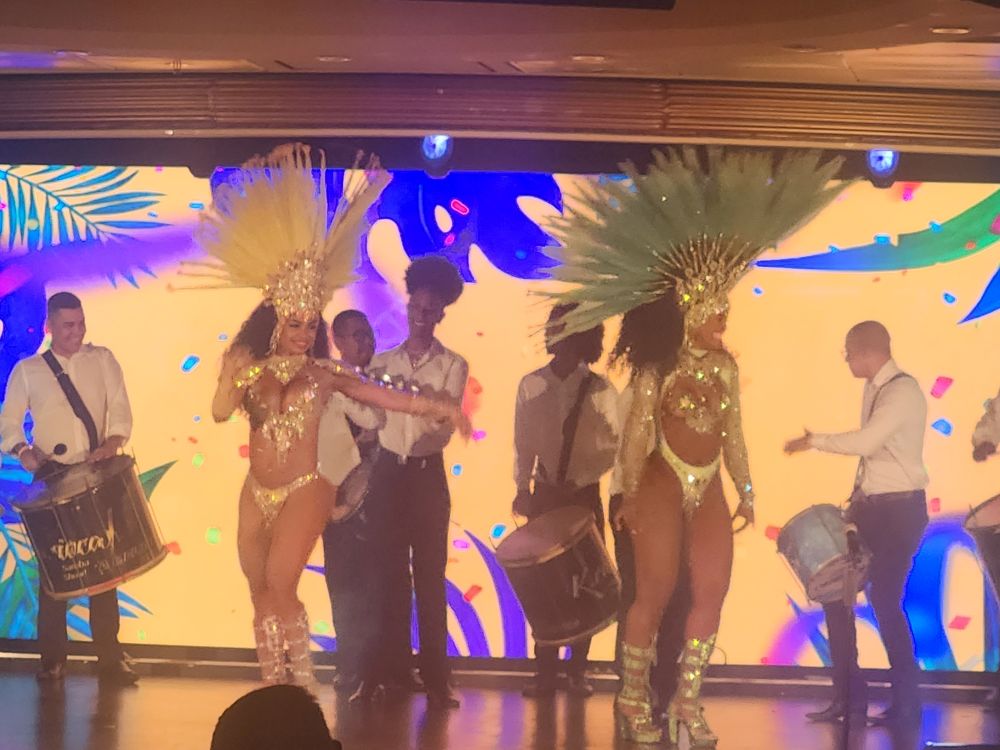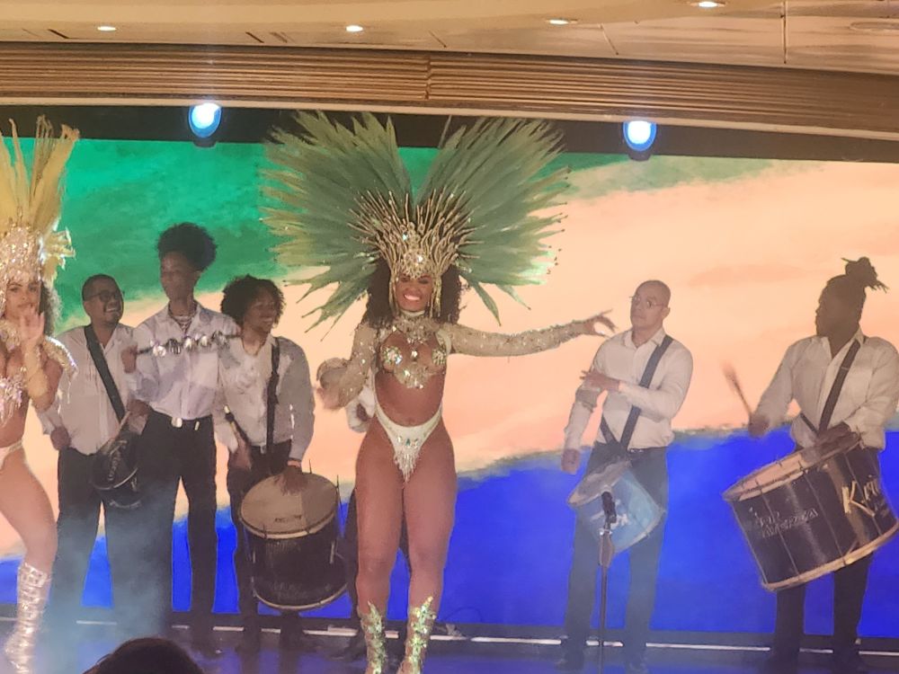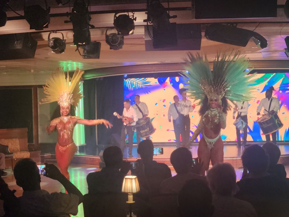 Back aboard, we have missed the B2B meeting, so after dinner we go down to GR and get our package from Marilyn, the concierge, then proceed to stand in line for the Destination Celebration, grab our traditional seats and watch the fabulous show with dancers and drummers.