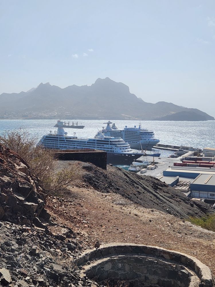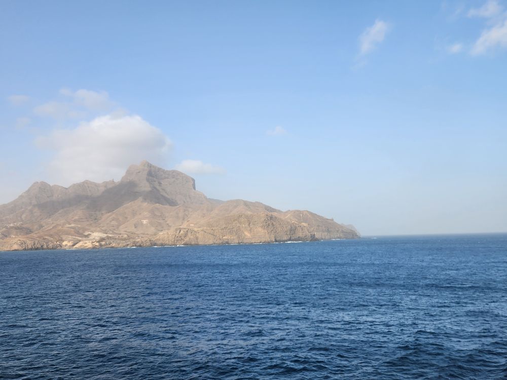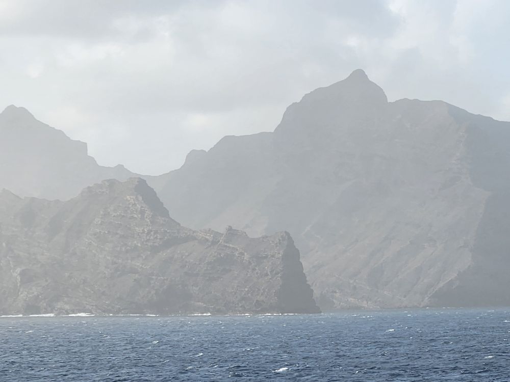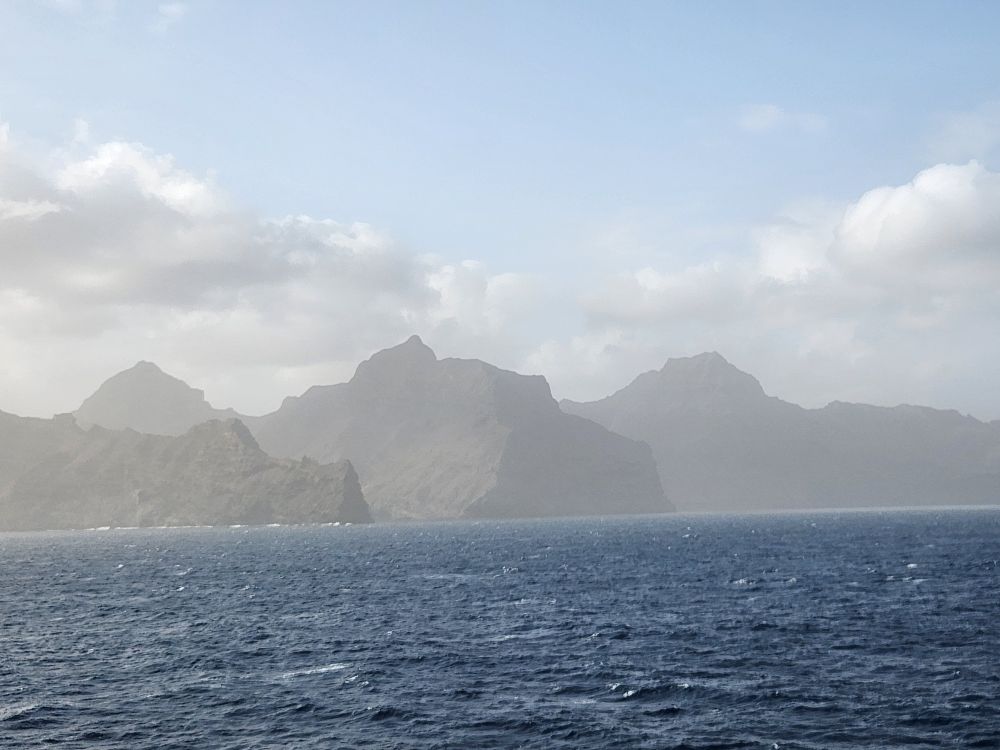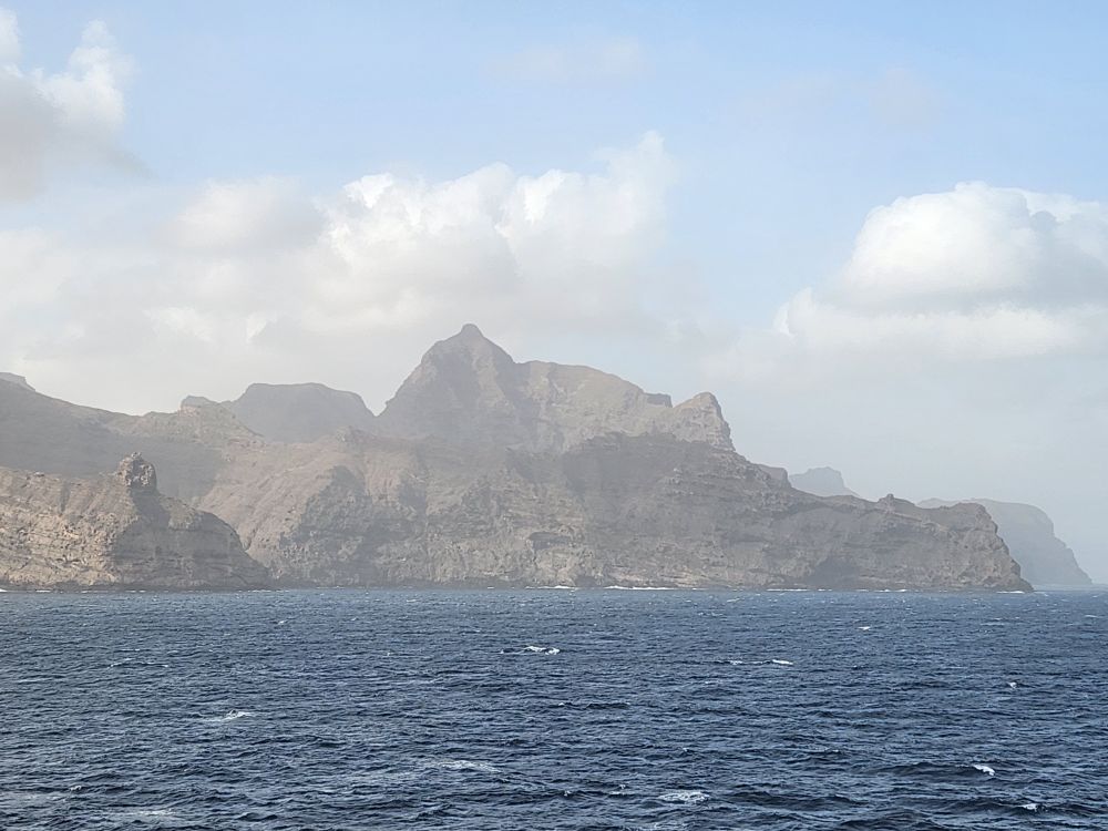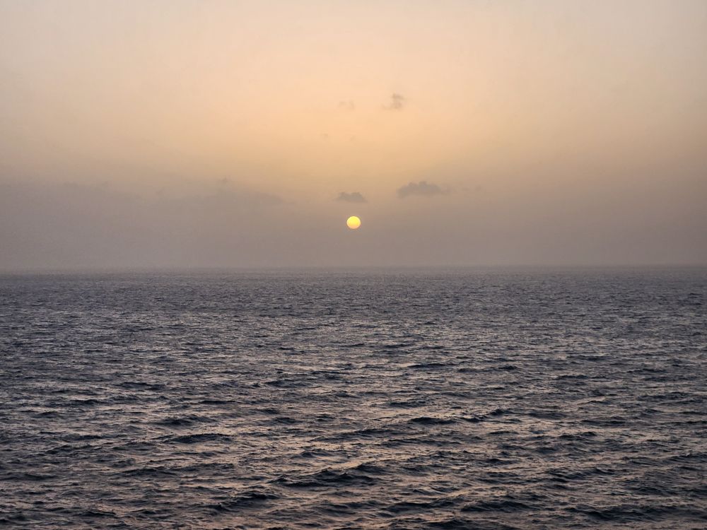 Another beautiful sunrise this morning as we walk around the upper deck track for our morning exercise. It is breezy and chilly too, with beautiful views as the Cape Verde islands emerge from the fog as we sail into the harbor. Lovely!