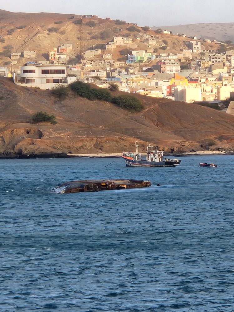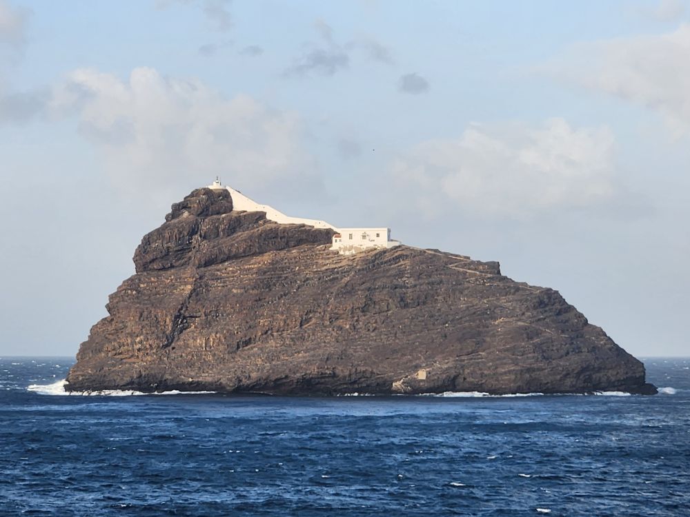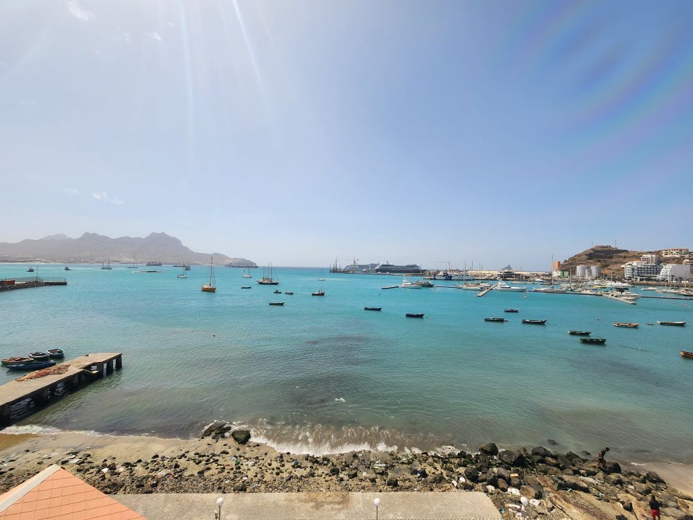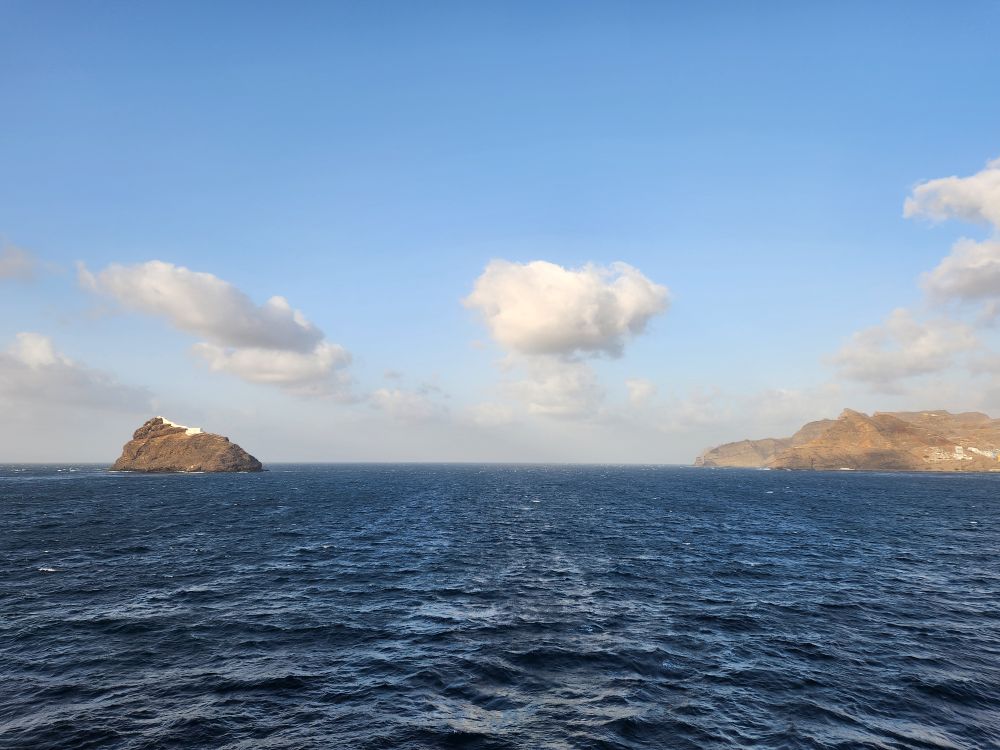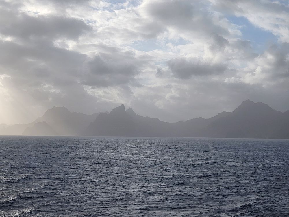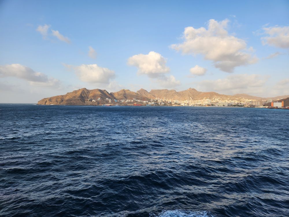 Another beautiful sunrise this morning as we walk around the upper deck track for our morning exercise. It is breezy and chilly too, with beautiful views as the Cape Verde islands emerge from the fog as we sail into the harbor. Lovely!