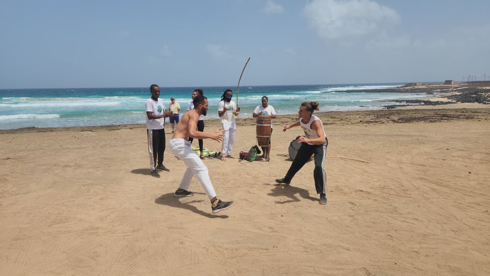 Our next stop is Praia Grande for a Capoeira dancing demonstration. A combination martial arts and dance, accompanied by music, we are treated to a wonderful performance out on the beach. The dance troupe is great, performing a number of different dances from the martial arts type to traditional island dancing while we watch from a safe distance, sipping on the local Cape Verde drink – Grogue, a mix of dark rum and cane sugar. Ed enjoyed both his and mine!
