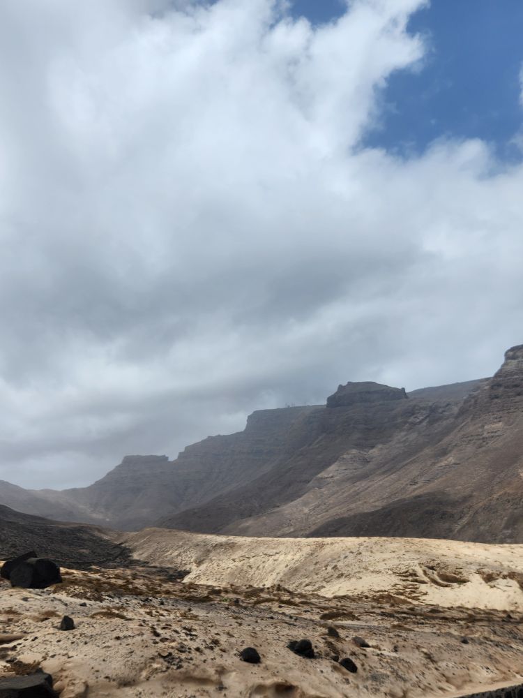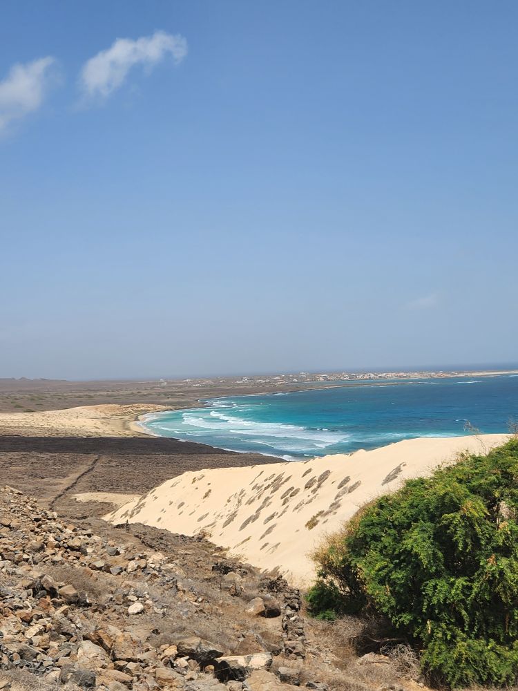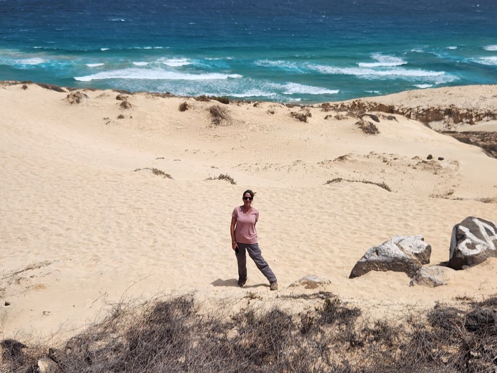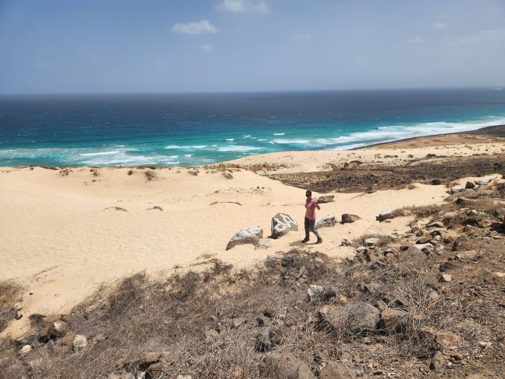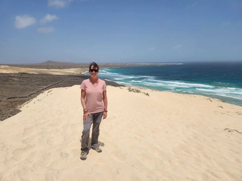 We are now circumnavigating the island, heading back to Mindelo, with a stop at a view point looking out over the wide sand that arrived here from the Sahara in a huge storm decades ago. Incredible, we know we are right off the coast of Africa – but it’s not all that close! To imagine all the sand coming from the Sahara is just mindboggling. And beautiful.