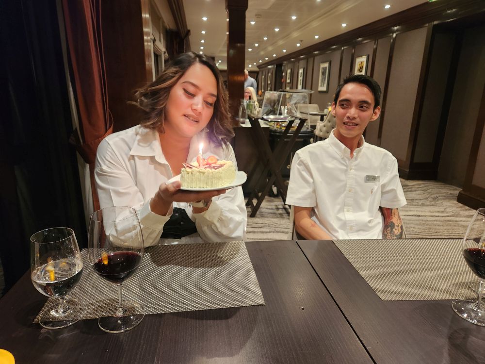 The evening turns out wonderfully – the seas cooperate and are not all that bad, Gayle is in her glory, Mark finally has his steak, Dofri comes up for photos and we spend the evening chatting, gossiping, looking at pictures and have a thoroughly wonderful time. We end the soirée with a birthday cake and song. Oh, and goofy selfies in the elevator on our way out.