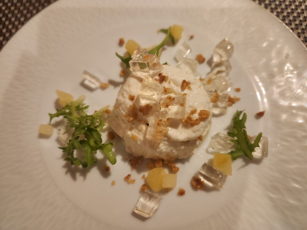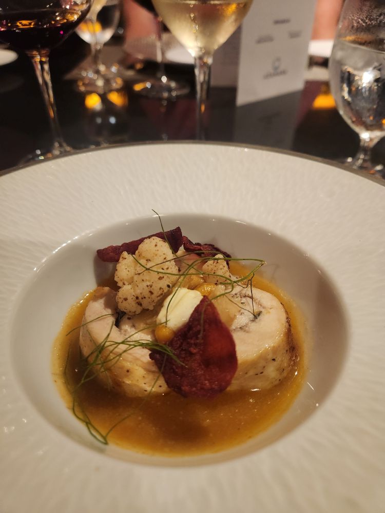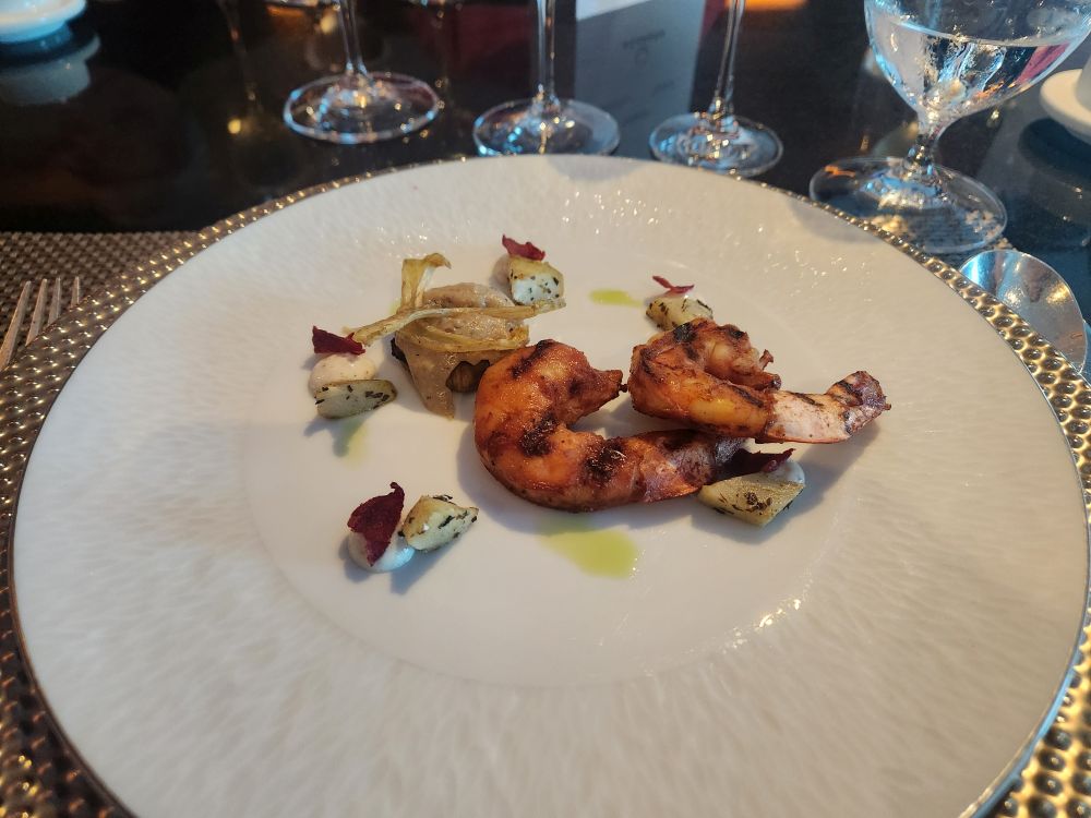Our first course is Emirati Grilled Prawns, followed by Shorabit Jarjir Squah and Red lentil soup (that was awesome, butternut squash with a red lentil cake in the middle – seriously good from the non-soup lover), next is chicken tangine and cauliflower shawarma and fried beet chips (oh, I just want a whole bowl of those, please), then the pineapple-saffron sorbet as a palate cleanser, followed by the main course of pan-fried Tuna for me and Lamb Shish kebab for Ed (both incredibly well prepared and totally excellent). By now we are all totally stuffed and we still have 2 courses left! The cheese course which is Goat cheese parfait with basil oil and wine jelly (very creative and very yummy) with our final dish being dessert of muscat soaked apricots served with vanilla honey yogurt mousse and pistachio gelato (which also included marshmallow and cacao meringue as well as little stars of meringue and fried sugar rounds – disgustingly good!). We will all be lucky if we can get ourselves out of the chairs!
