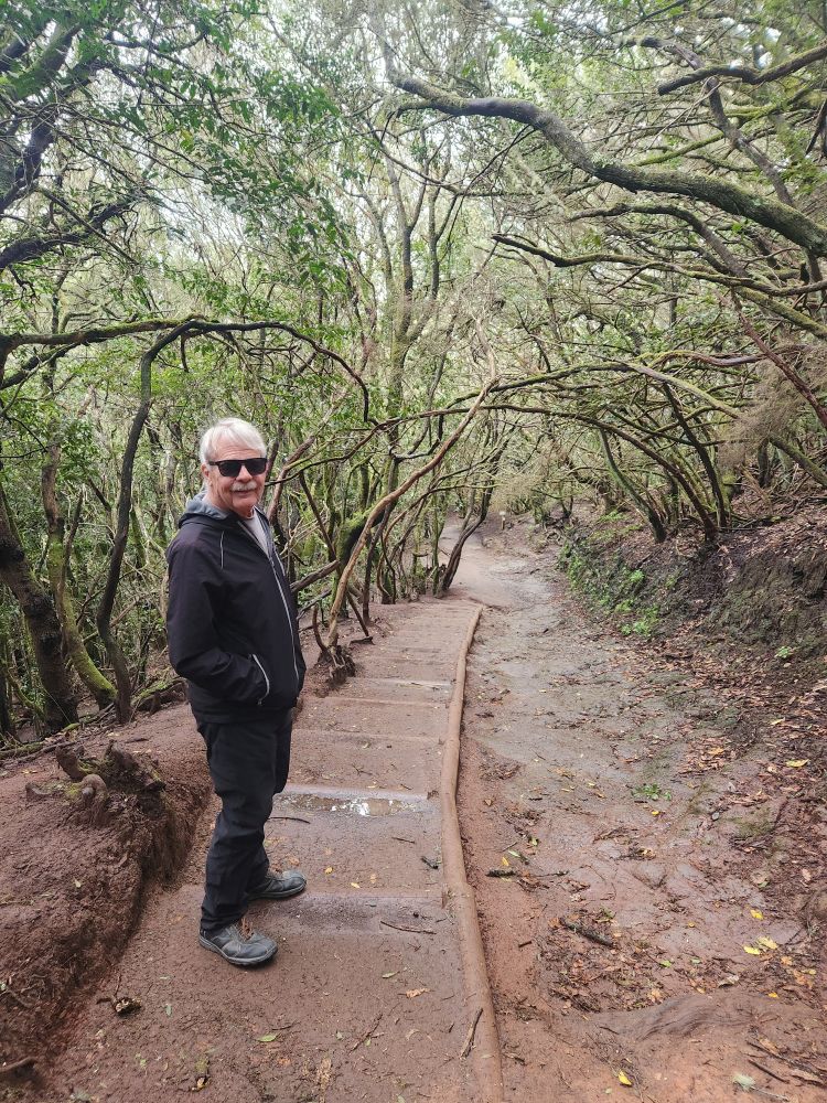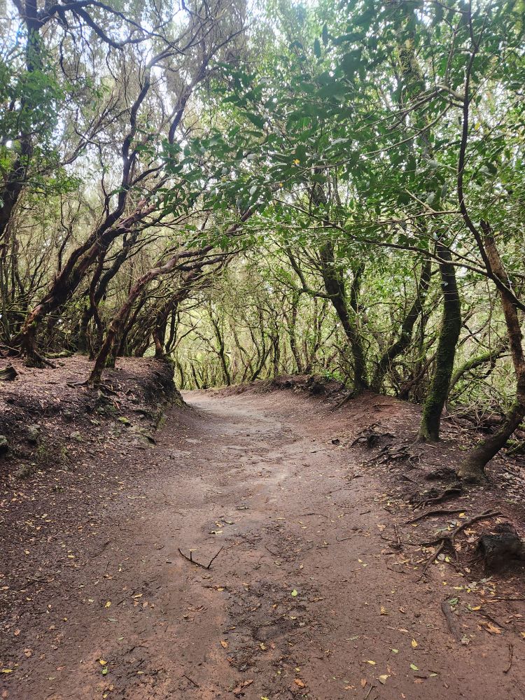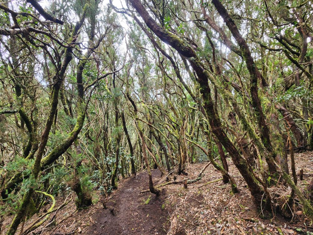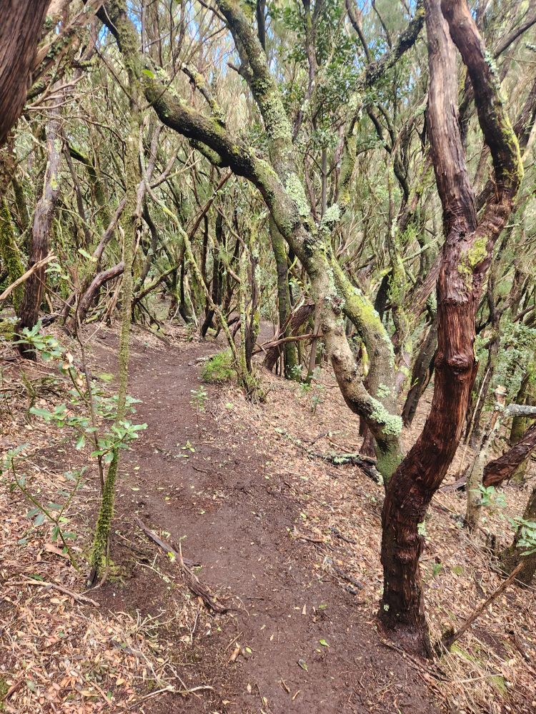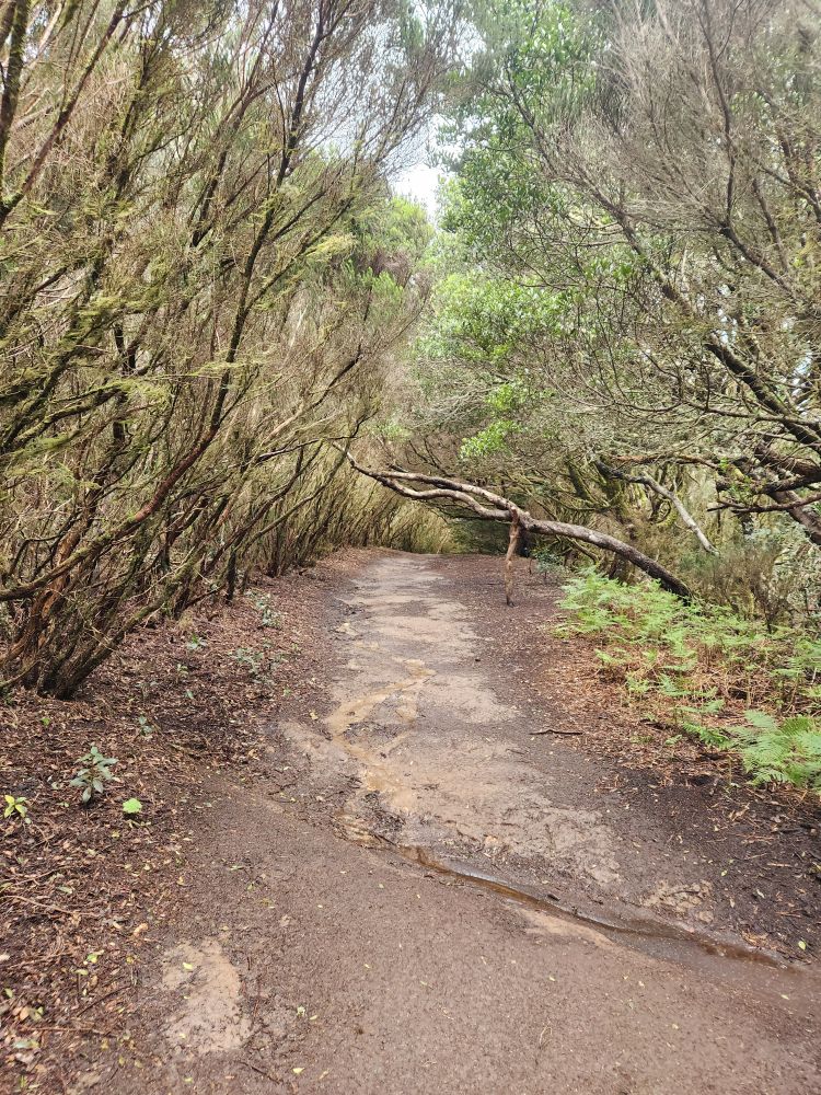 We finally reach El Bosque – or at least we think we do. There is a little pull out on the side of the road, enough for a few cars to park, with stairs leading down into the forest. We figure what the heck? It’s a trail. There is parking. We’re game. So off into the forest we go. This hike is much more natural and the trail is not as managed as the others we hiked earlier. There are spots where we have to watch carefully to stay on the trail. Still, it is really fun to walk through these woods – Encantado – which means “charmed” in English – they are! I’d go with the less literal translation of enchanted. The trees, mostly Laurisilva – a laurel forest – are all moss covered and twisted together to form strange shapes and natural arbors. At one point there is a little braided doll figurine perched in the crook of a tree stump – a good way point to follow to keep on the trail – and know we are correctly making our way out!