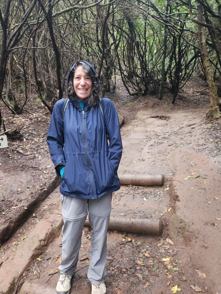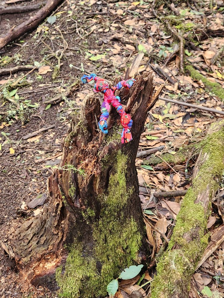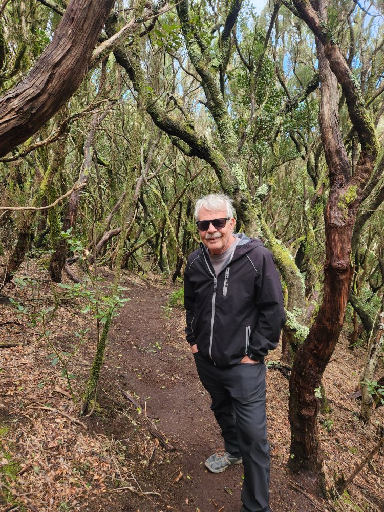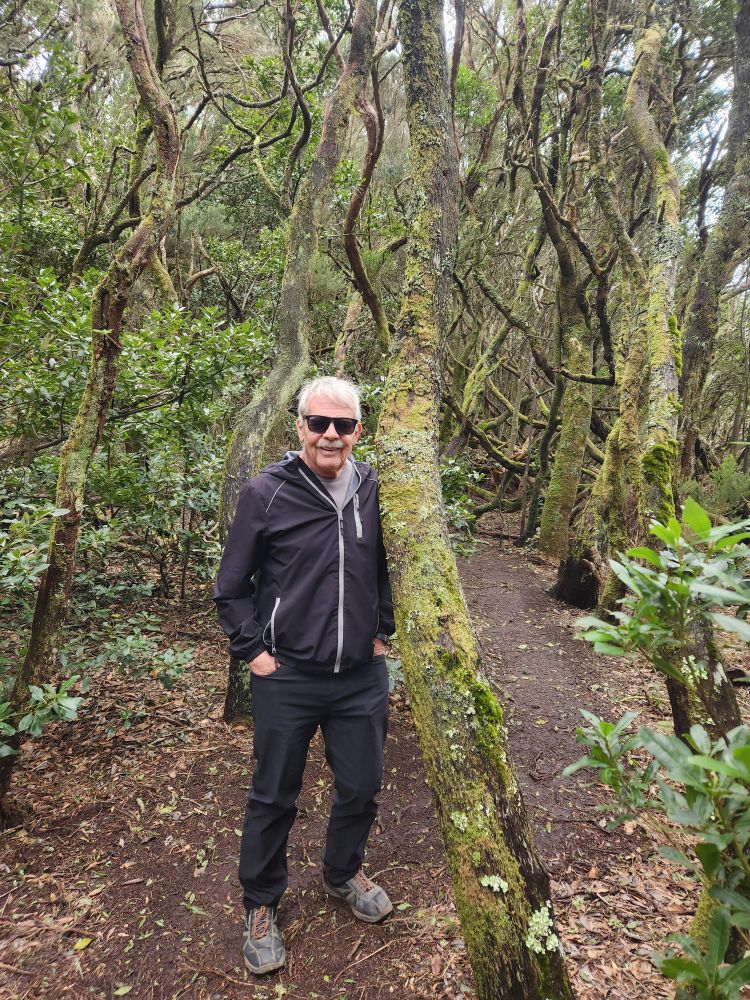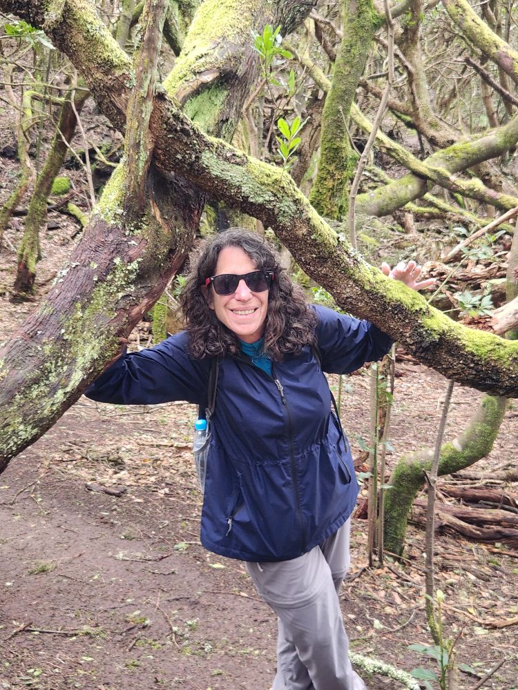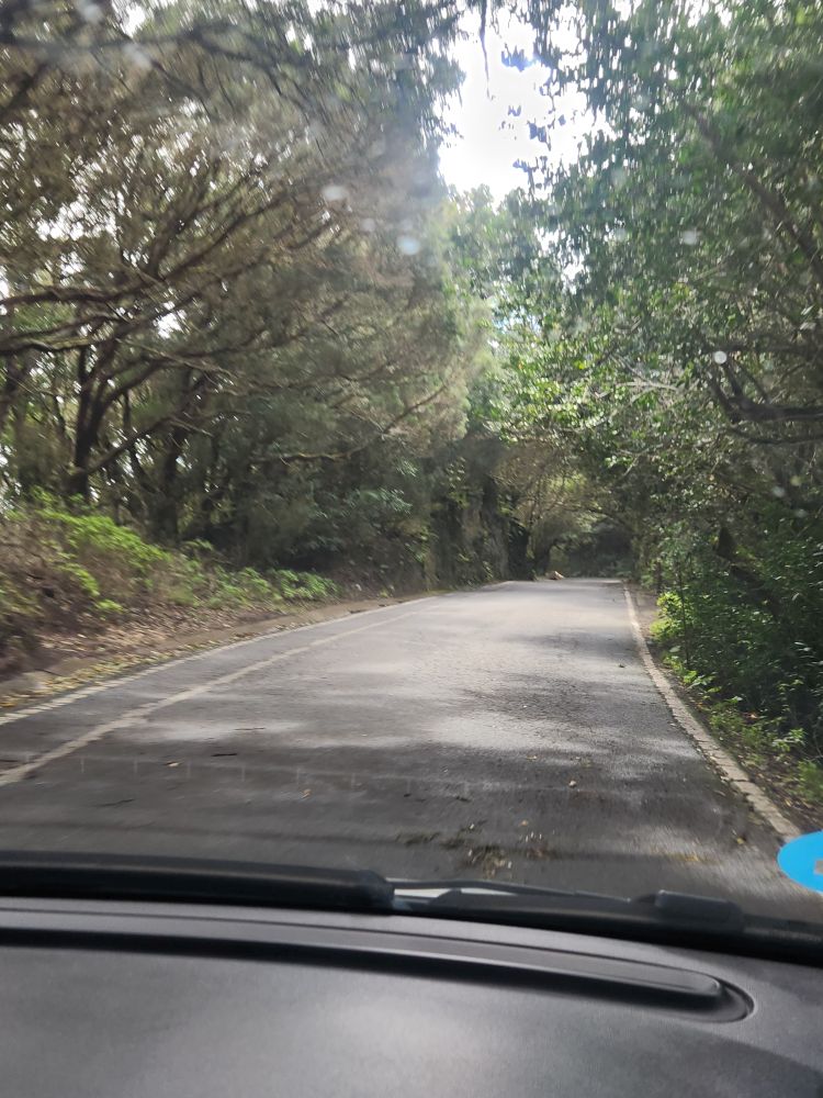 We finally reach El Bosque – or at least we think we do. There is a little pull out on the side of the road, enough for a few cars to park, with stairs leading down into the forest. We figure what the heck? It’s a trail. There is parking. We’re game. So off into the forest we go. This hike is much more natural and the trail is not as managed as the others we hiked earlier. There are spots where we have to watch carefully to stay on the trail. Still, it is really fun to walk through these woods – Encantado – which means “charmed” in English – they are! I’d go with the less literal translation of enchanted. The trees, mostly Laurisilva – a laurel forest – are all moss covered and twisted together to form strange shapes and natural arbors. At one point there is a little braided doll figurine perched in the crook of a tree stump – a good way point to follow to keep on the trail – and know we are correctly making our way out!