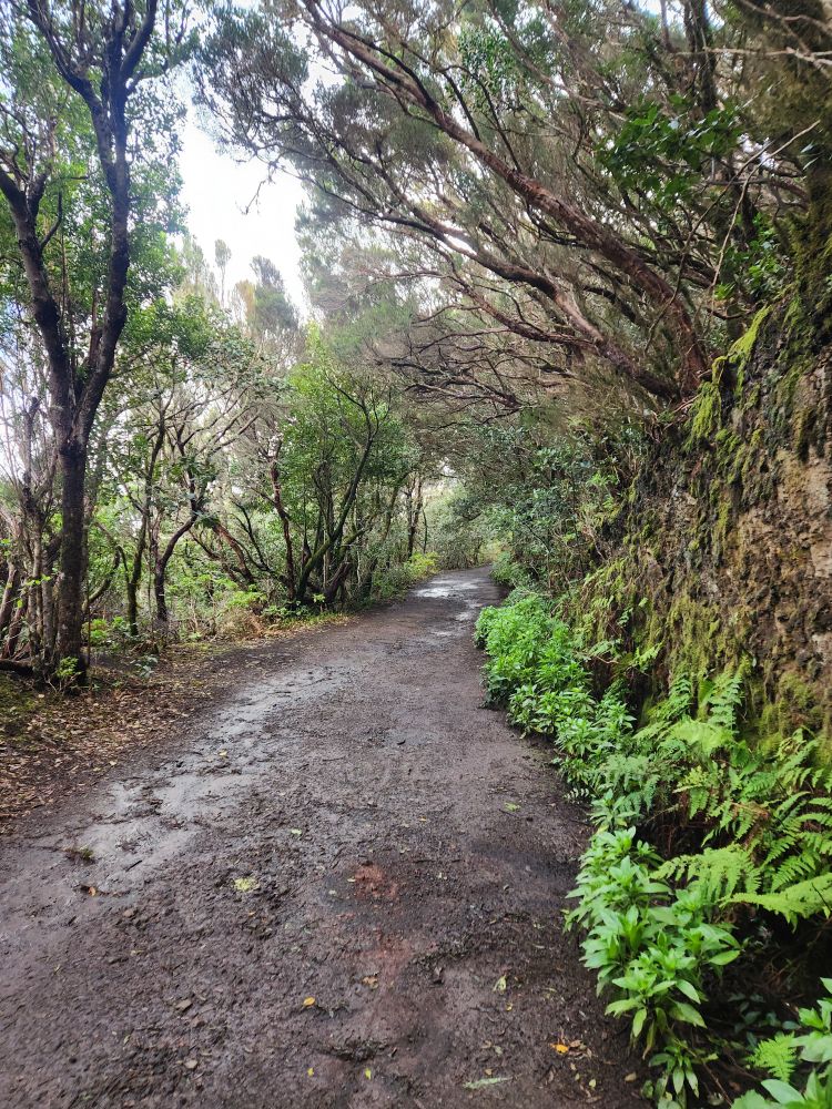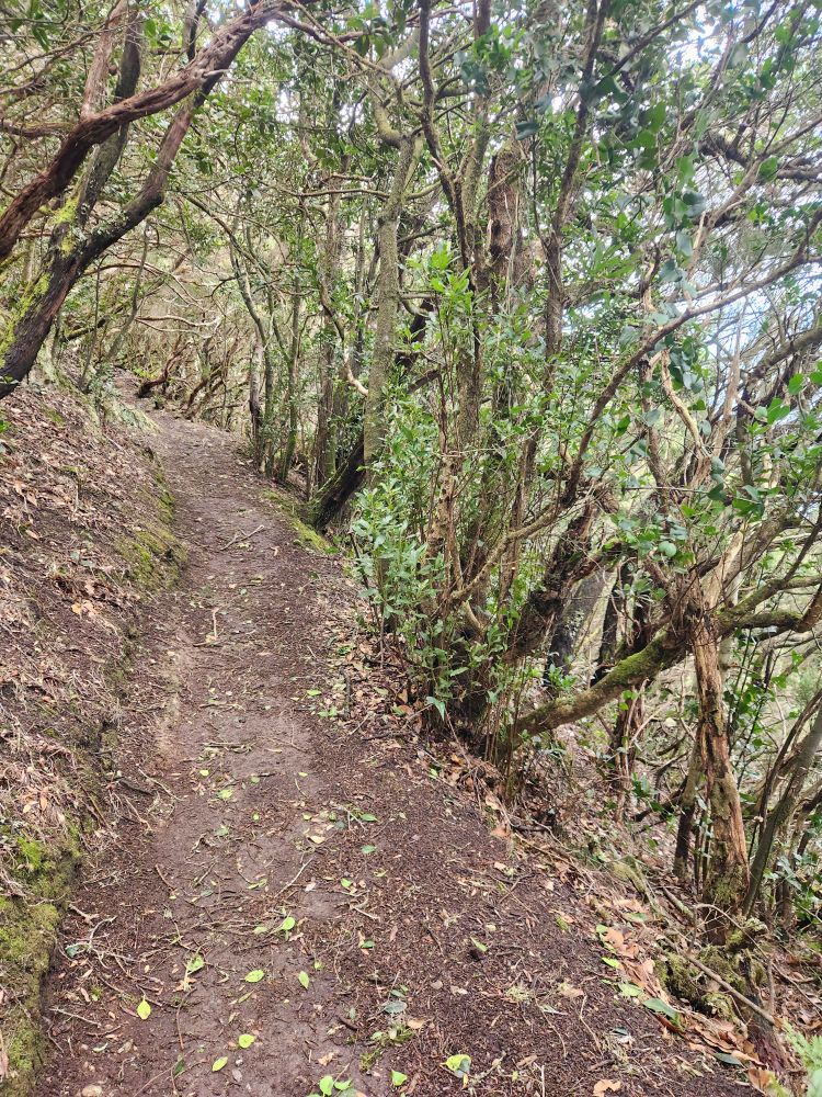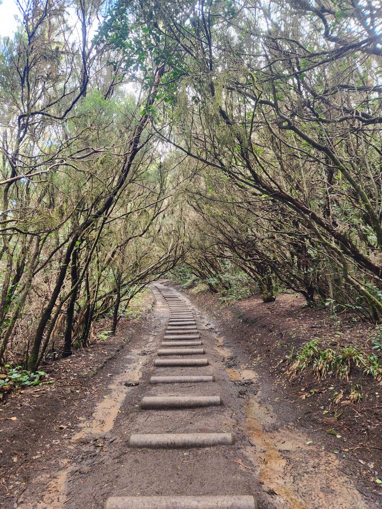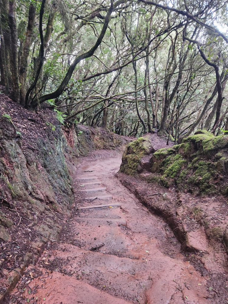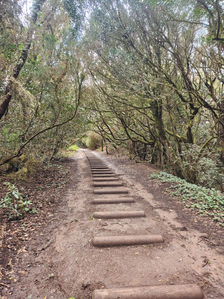 From here we hit the trail – which may be accessible, but not to all! That’s for sure. After a quick little flat part, the trail heads down into the forest on hard packed clay with stairs cut in to make the slope a little easier to navigate. It is totally fun and gorgeous and we are basically all alone in the forest, but it wouldn’t be called an easy trail. And one of the reviews we read said it was the easiest of all routes in Anaga – if that is the case, then those other trails must be brutal! We cover Path of the Senses 1 and Path of the Senses 2 and part of 3 before turning back uphill to reconnoiter and figure out our plans.