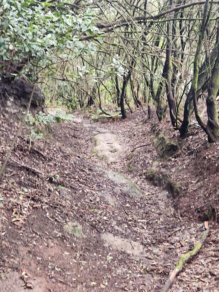 Right across the street, past the cute little chapel that somehow we didn’t take any pictures of, is another trail system, the Bosque de Los Enigmas loop trail. This total trail is almost 5K and should take about 2 hours according to all our info – so we figured might as well. Once again, we start off on hard packed clay with stairs dug in for easier access – and as with the Path of the Senses, straight down! We’re getting our calf and thigh work out today! Here again, we are all alone in the middle of the woods, just enjoying the peacefulness of nature!
