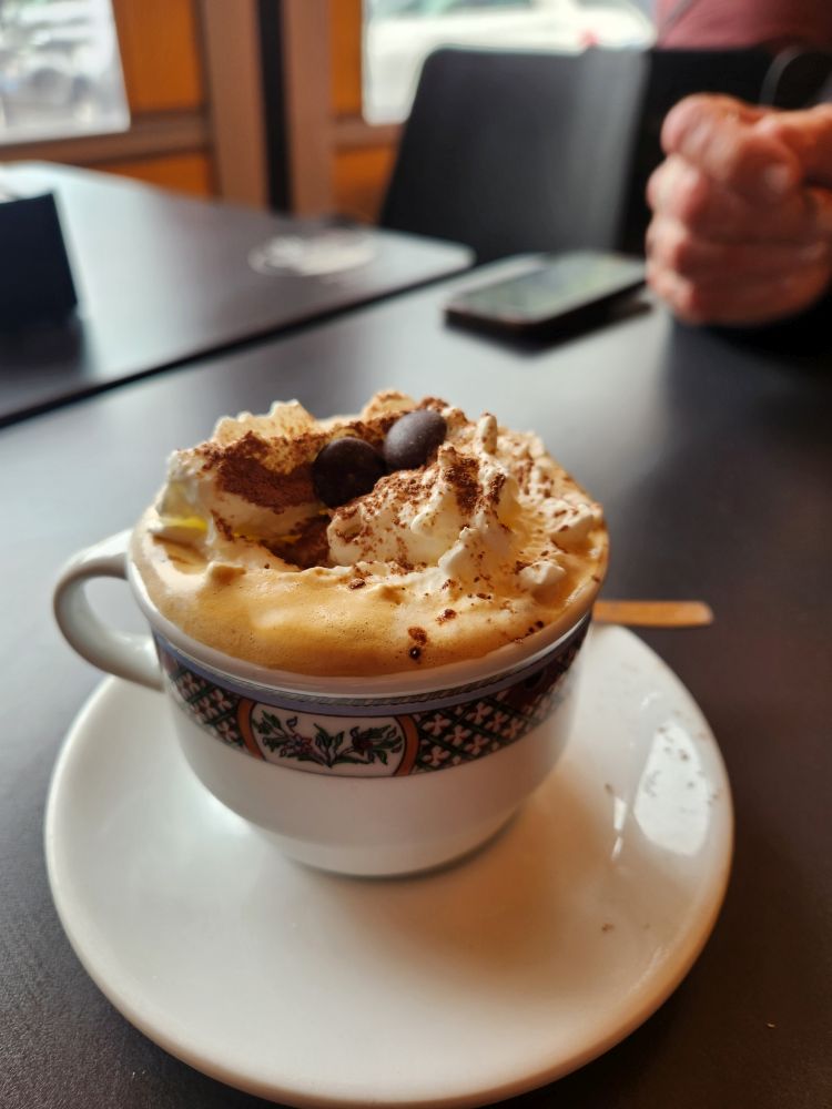 As we make our way up the trail to Cruz del Carmen we start to encounter more people coming down the trail. We had been wondering if it would be crazy out here because it is the Good Friday holiday, but so far, it hasn’t been bad. Oh – did we underestimate! Once back at the beginning of the trail and the café, you would not believe the crowds on the road. The parking lot across the street is full to capacity – with cars parked virtually everywhere. There are so many people and cars – you can’t get in or out of there! We were so lucky to start early and have the place to ourselves! We reward ourselves with an awesome cappuccino at the café – those are chocolate chips on the top! – while we reconnoiter the rest of our day.