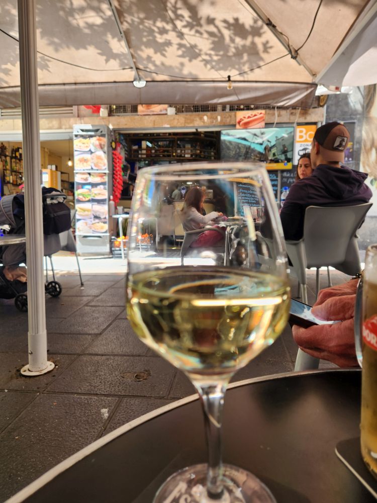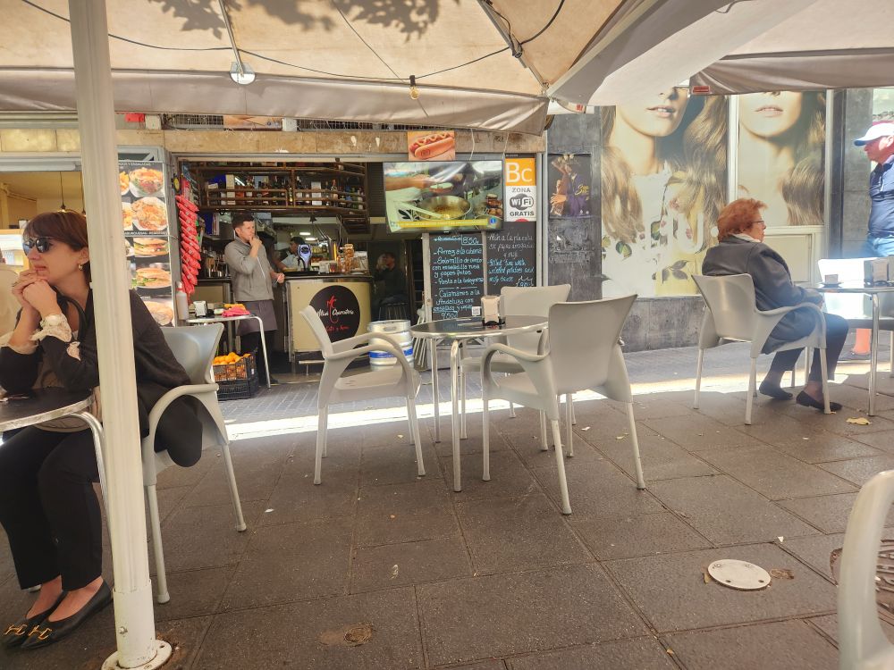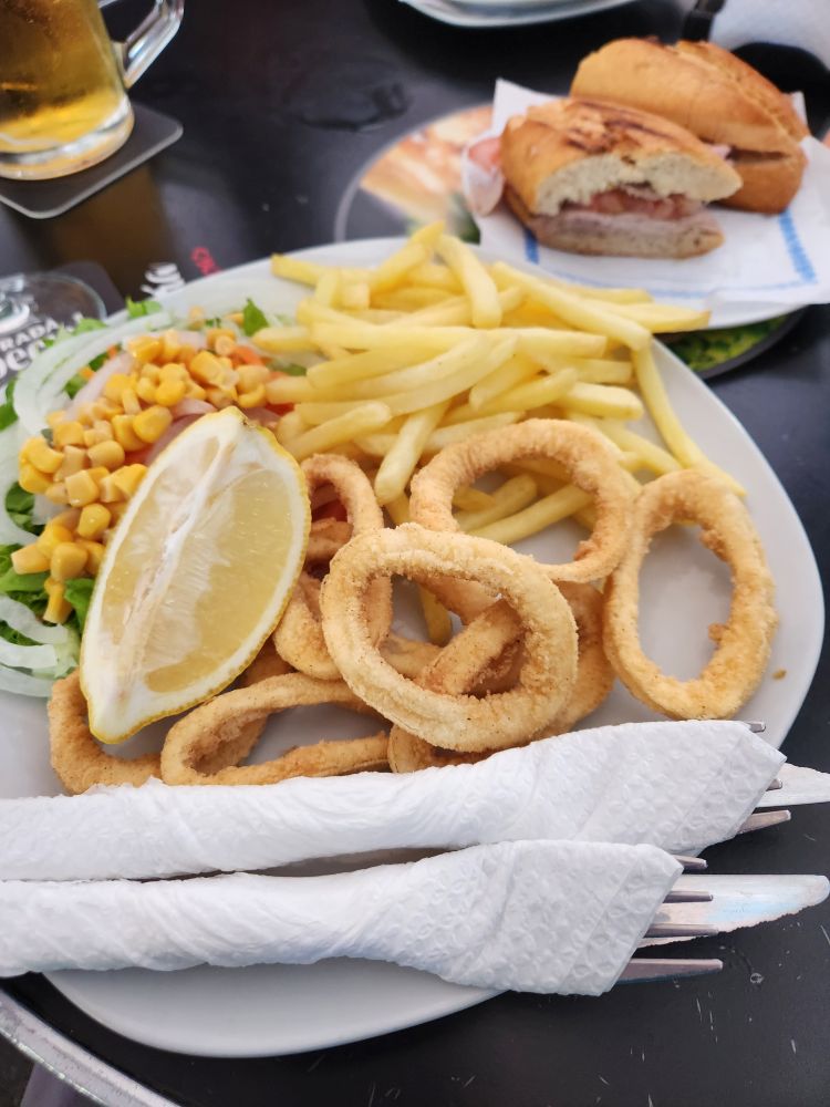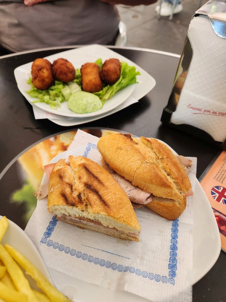 After the procession passes, we wander through the streets of Santa Cruz, looking for a place to eat. There are plenty to choose from, and we know we have to choose something quick before the hordes of procession watchers descend. We settle on Mini Charcutería Café y Tapas – on a side street in the middle of town. Scoring a table outside under the broad tarp, we settle down to order the daily special – Calamares ala Andaluza con ensalada y papas as well as croquetas pollo and Pluga pata canaria, a montadillo (small sandwich) filled with Canarian pork. Yum.