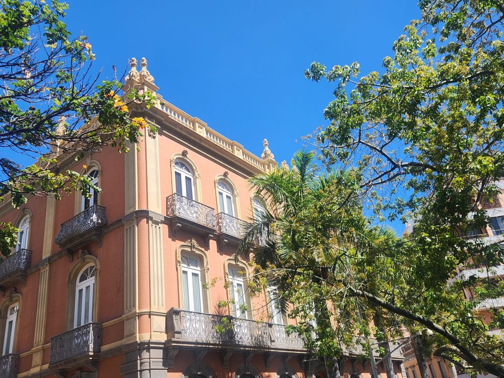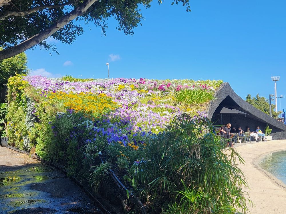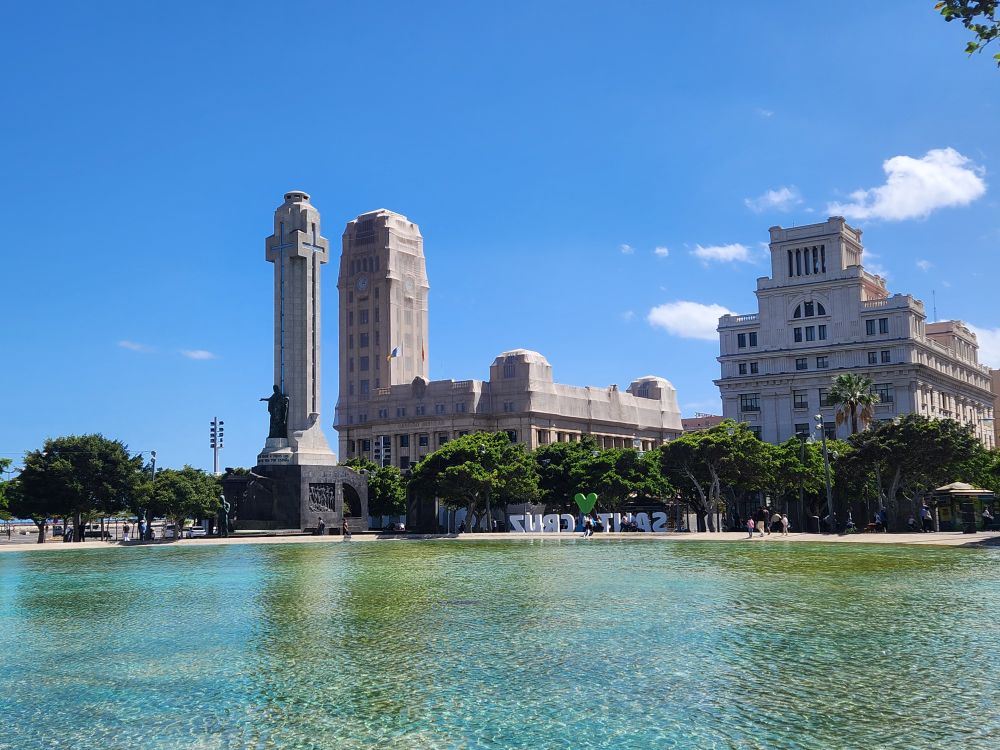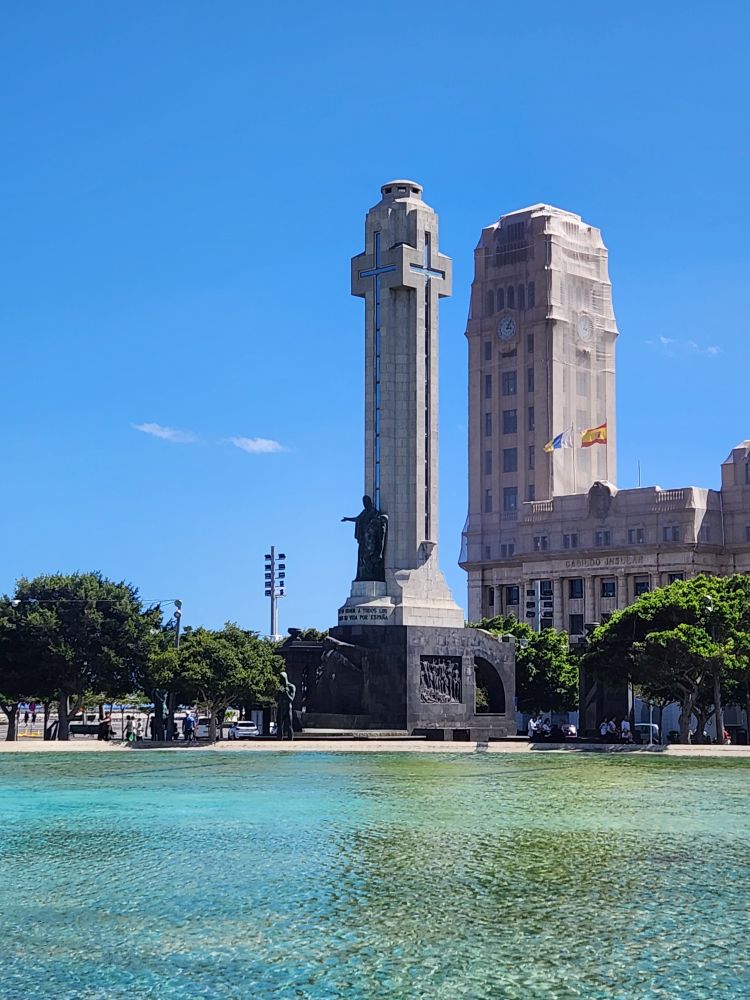 Walking off our nice light little lunch, we meander through the old town, snapping pictures of different architecture that strikes our fancy and finally stopping at a corner café for an afternoon beverage. Then it is back to the ship, past the Plaza España with the reflecting pond, huge memorial statue and the cool living roof of all flowers and green plants on the top of Restaurante Manglar.