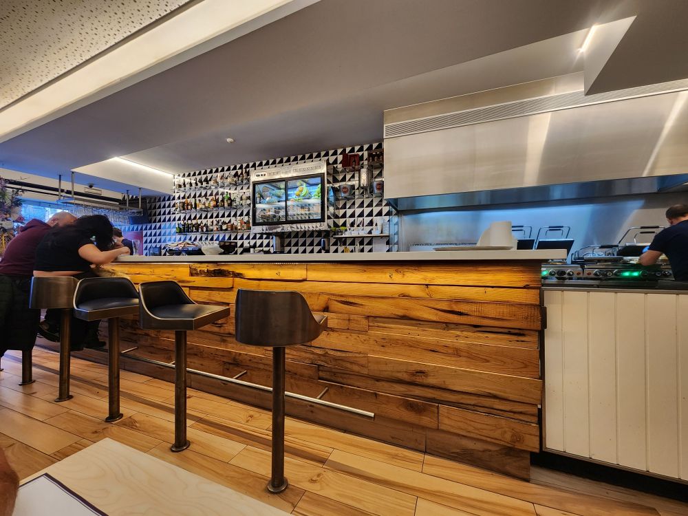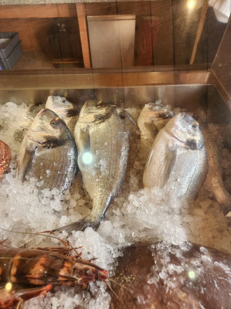 This place is situated right on the very edge of a rocky outcropping with a view of the surfers on one side near the jetty and the long southern facing coast on the other. Perfect. The set up is a little confusing, but fortunately everyone speaks impeccable English. Basically, you enter into a fresh fish shop where there is a guy (we are guessing the owner) showing you whole fresh fish and telling you which is the best for you to order. There is another guy shucking oysters and yet another chef grilling the fish you order. Couldn’t be any fresher. We just want small plates – but that is obviously not happening here. So we end up ordering one Sea Bream (49E per kilo!!!) to share – then the guy tells us the appetizers come to the table. Oh, ok, got it!