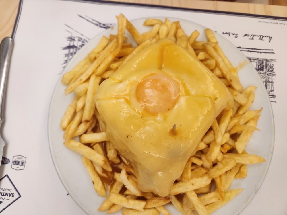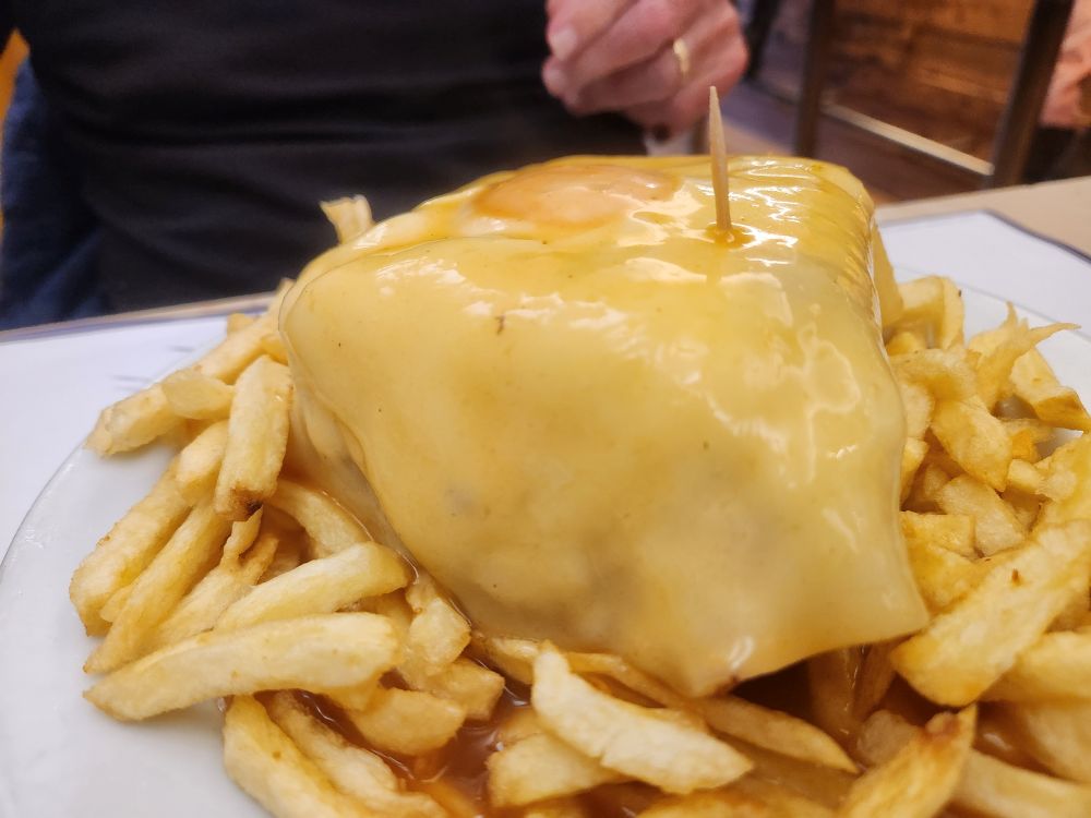 Back toward the apartment, we start to peruse all our food options. Everybody has these things called Francesinha – which we look up and turns out it is sort of like a grilled sandwich with tons of different meat inside then smothered with a cheese sauce and an egg on top. Oh – we are so in for that! And there is actually a place called Santa Francesinha, and right next door Francesinha Santiago, which Dalila says has the best Francesinha – good enough for us!