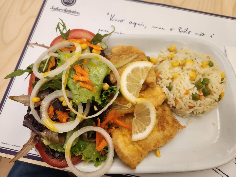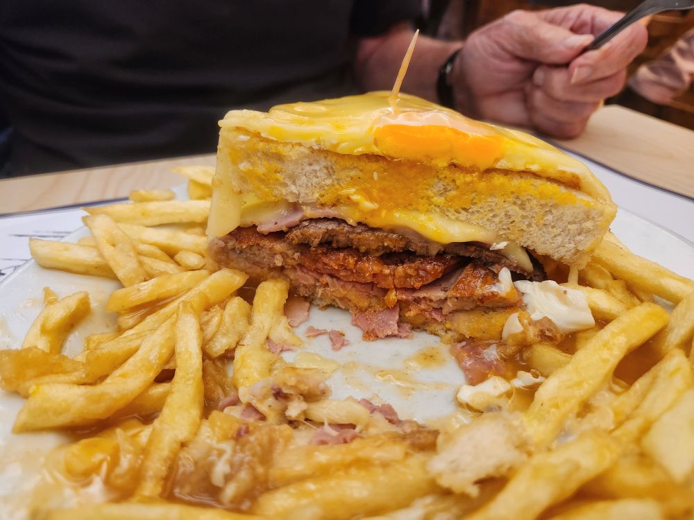 We get a table on the first floor – order one Francesinha and one filet of fish to share and sit back and watch the stream of people – with tons of kids – parade past, all going upstairs (there are a couple of floors above us) and the other tables around us attack their huge meals. Oh jeez – the portions are monstrous! Our Francesinha Santiago arrives as large as all the others and we dig into an artery hardening feast! Loaded with ham, sausage, what they call bologna and beefsteak and definitely smothered in sauce – it is great – but definitely coma-inducing. The fish is equally good – but far lighter – thankfully! We only wish we had further to walk to get back to the apartment!