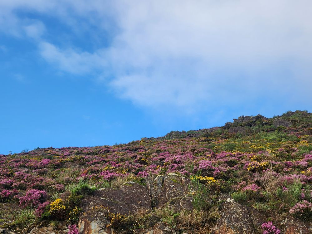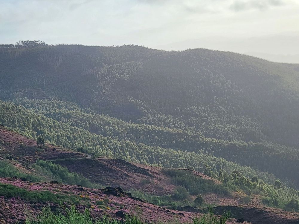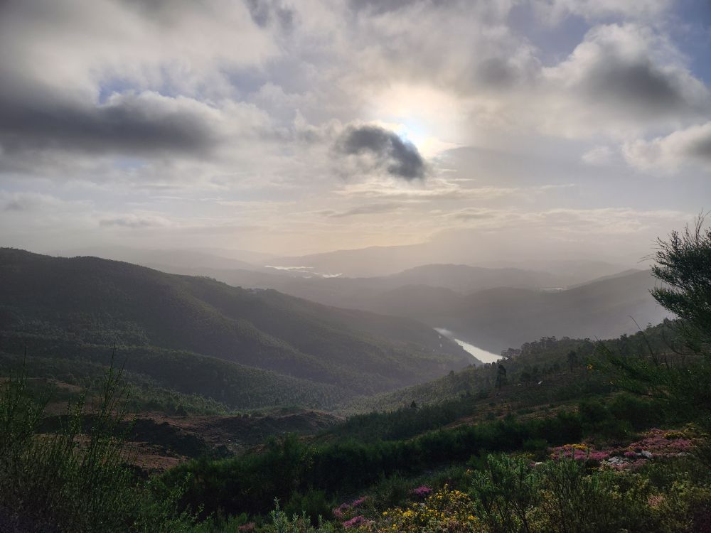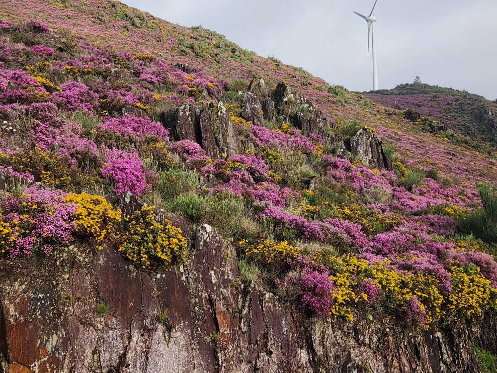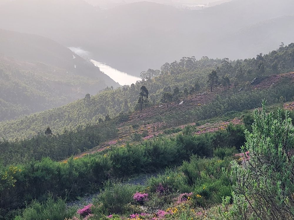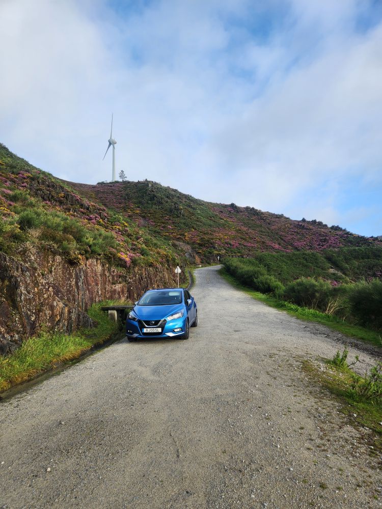 Reaching a gate on the road, we stop the car and get out to explore. The surrounding countryside is gorgeous, dark green pines on the hillsides and fields of yellow and purple flowering bushes on the lower slopes, all framing the Douro far down below us. It’s beautiful, but there is no “Balcony” overlook in sight, and no signs directing us either. Just the huge windmills to which we don’t really want to get any closer.