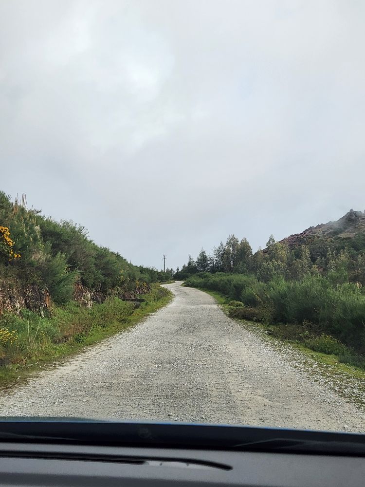 Ok – abort! We reverse and head back down the gravel road, fortunately not encountering any other traffic which would have been brutal considering there is no where to turn around and precious few places – if any – where you can pull off to the side to let anyone pass. Back on the main road we try to look for a café but decide to just bag it and head onto our next stop: the Castro Monte Mozinho ruins site. As we drive a few blocks down the road, we actually see a sign for the stupid Baloico Boneco. Really? Stupid Google GPS! Had us in the absolute wrong location. We could have driven up this street, parked and hiked to the correct location – which we can now see from the road and that has a perfect view of the river, and a swing! Honestly.