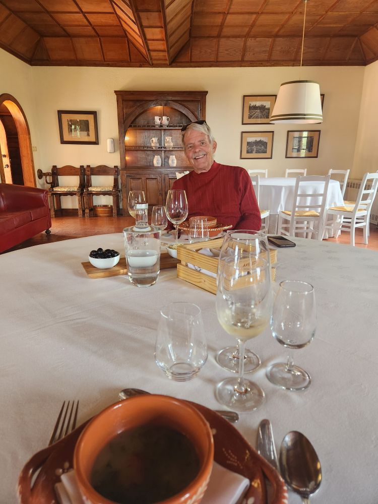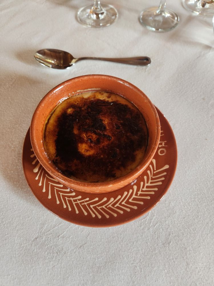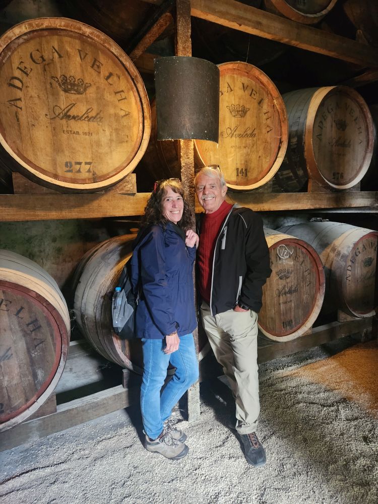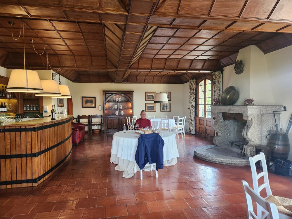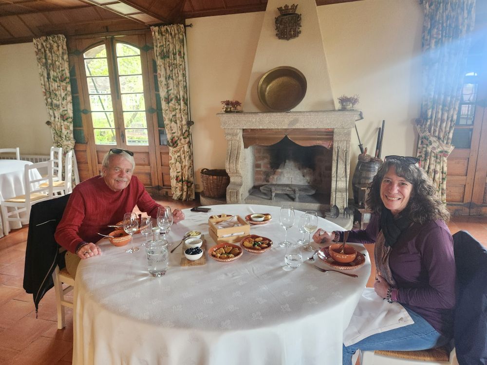 Then it is on to lunch! And what a lunch – a private seating for just the 2 of us – in an enormous events room. It is such fun! We start with a vegetable soup, then have “snacks” which are far more appetizers than we could ever consume – a cheese and meat platter, mini fried “delicacies” – essentially croquettas of different varieties – smoked meat puff with honey and mustard and these delicious cod cakes called Pataniscas. Ay yi yi – and we sill have the main course to come! Which is an excellent pork dish call mini Rojoes a Minhota – a local specialty. And of course, it all comes with wine pairings! We are stuffed – but we have to save from for the Portuguese Crème Brulée! Thankfully our sweet waiter lets us wrap up the cheese and sausage to take with us, because we’d never be able to finish it all. Snacks for later! Or dinner the way we are feeling right now.