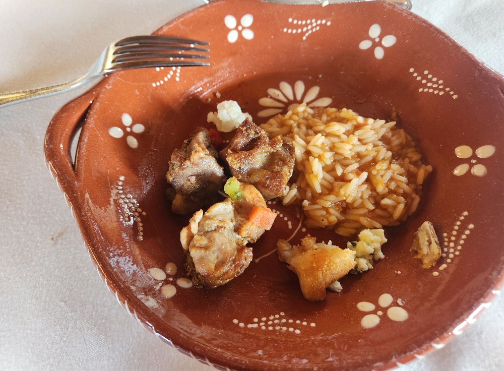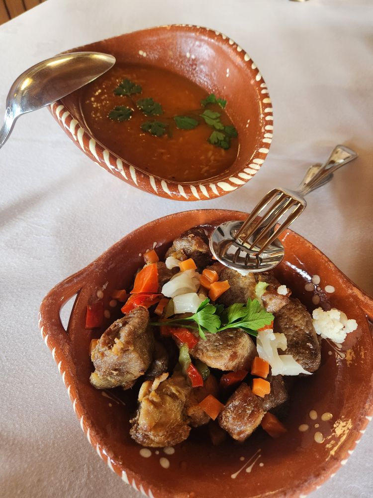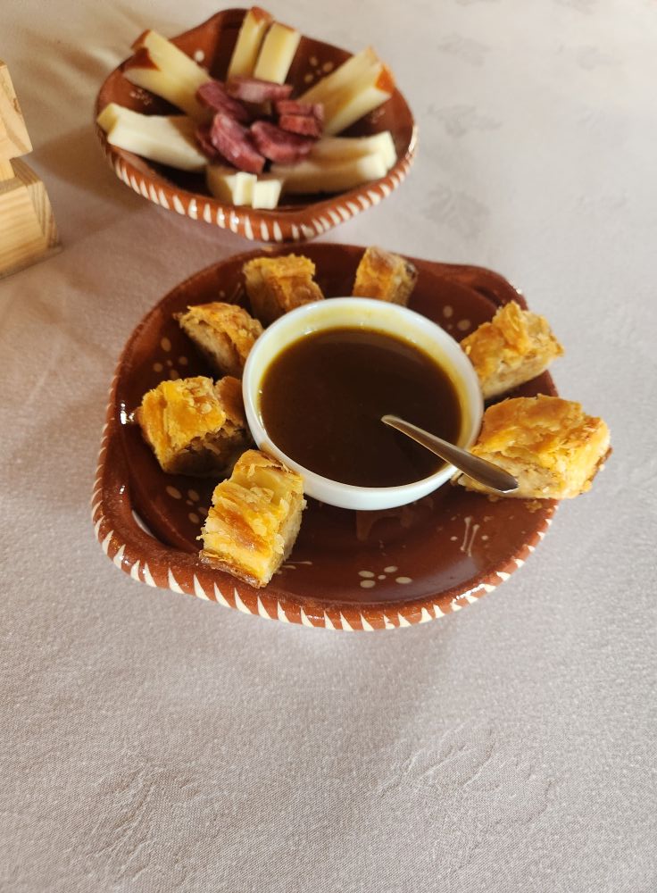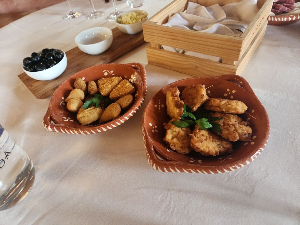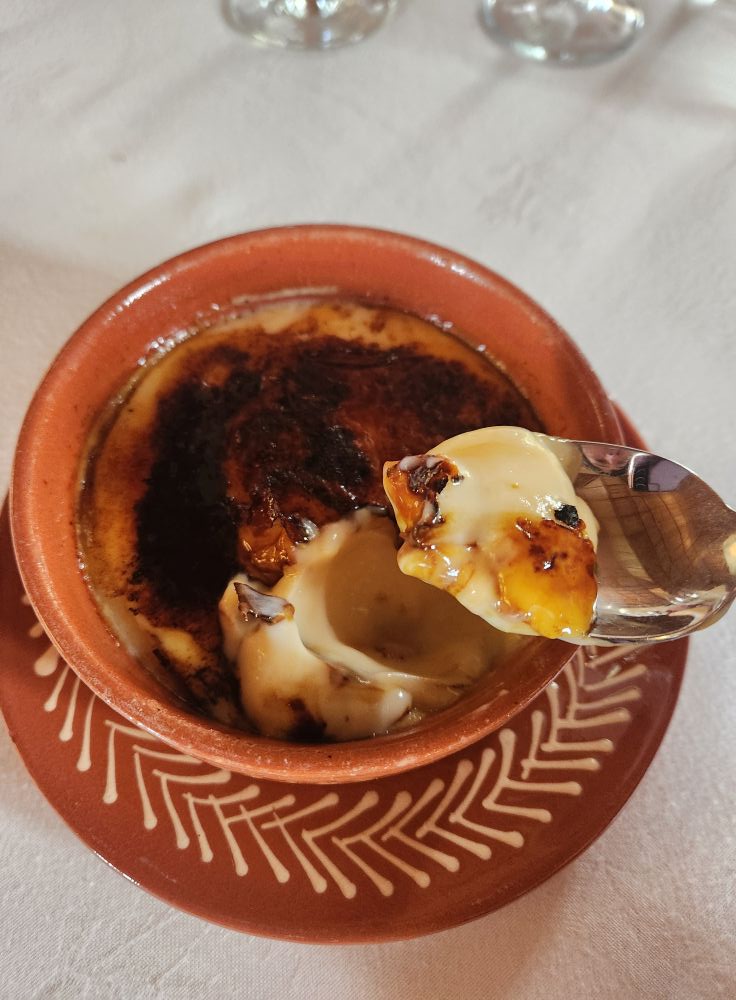 Then it is on to lunch! And what a lunch – a private seating for just the 2 of us – in an enormous events room. It is such fun! We start with a vegetable soup, then have “snacks” which are far more appetizers than we could ever consume – a cheese and meat platter, mini fried “delicacies” – essentially croquettas of different varieties – smoked meat puff with honey and mustard and these delicious cod cakes called Pataniscas. Ay yi yi – and we sill have the main course to come! Which is an excellent pork dish call mini Rojoes a Minhota – a local specialty. And of course, it all comes with wine pairings! We are stuffed – but we have to save from for the Portuguese Crème Brulée! Thankfully our sweet waiter lets us wrap up the cheese and sausage to take with us, because we’d never be able to finish it all. Snacks for later! Or dinner the way we are feeling right now.