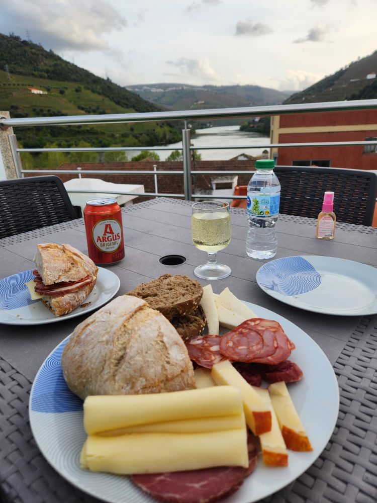After retrieving all our bags from the car, we set off to familiarize ourselves with the little one street town, walking down by the Douro, loving the quiet and peacefulness of the late afternoon. Since we have so much leftover food (including today’s haul from lunch), we decide to just picnic on the rooftop, stopping at a little bakery at the end of town for some rolls and croissants for the morning. Then it is up to the wonderful rooftop for a lovely evening overlooking the Douro.