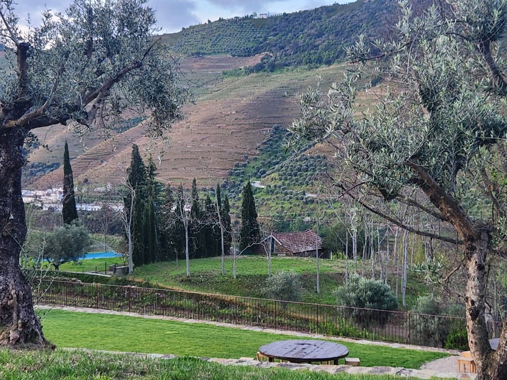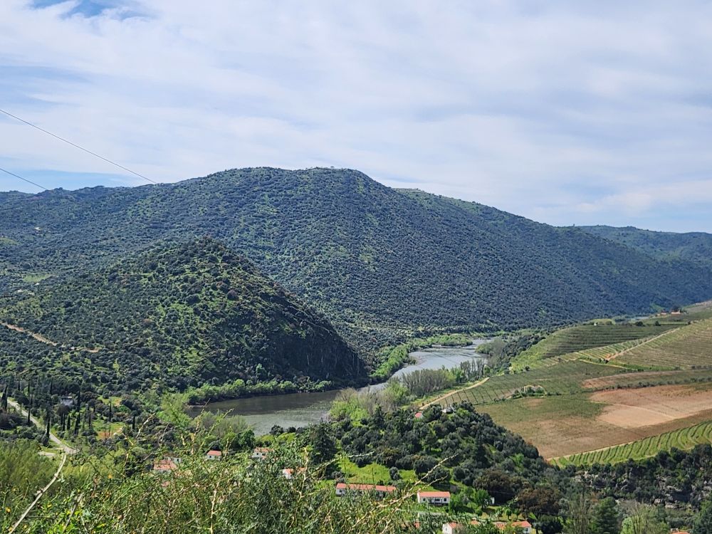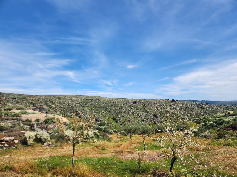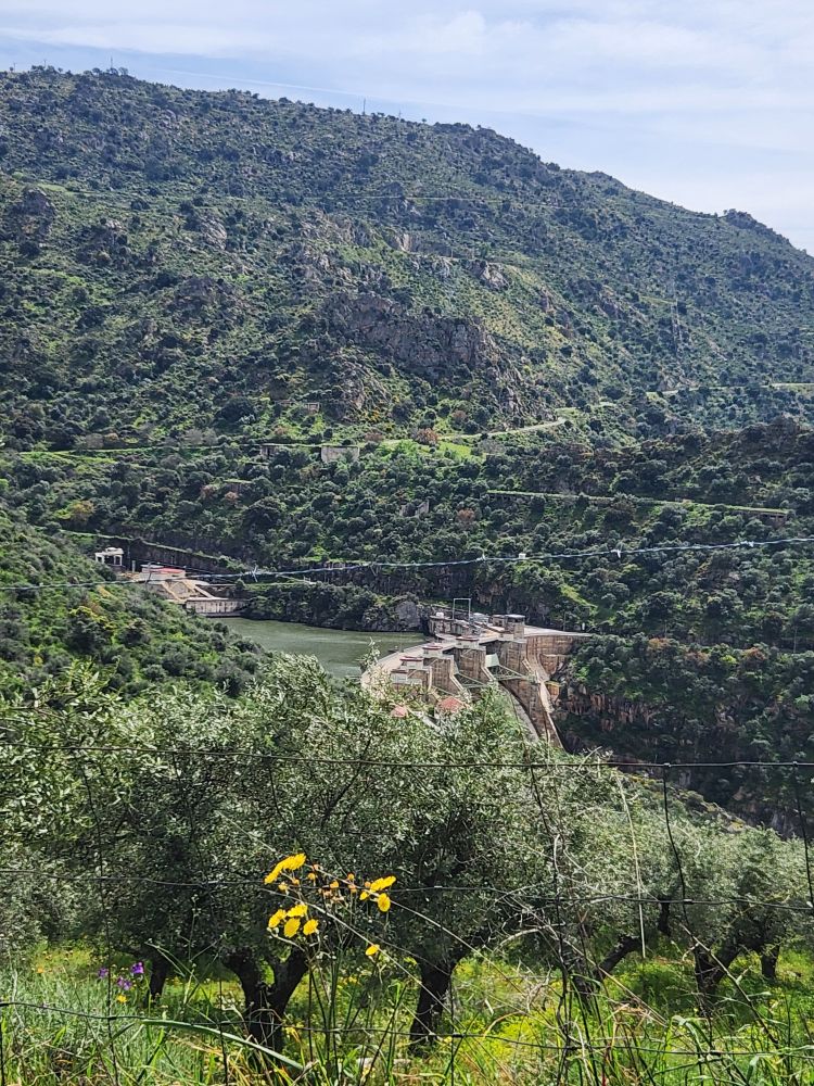 The more inland we go, the more the scenery changes. We go from 100% vineyards to occasional vines mixed in with tons of olive tree groves, lots of scrub and lots of rocks. And along the way, somewhere – who knows where – we’ve switched to following the Sabor river. Albeit high above the banks on the winding mountain road.