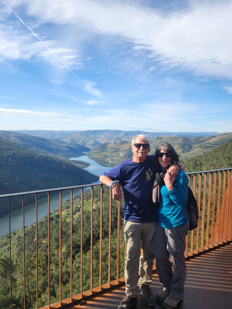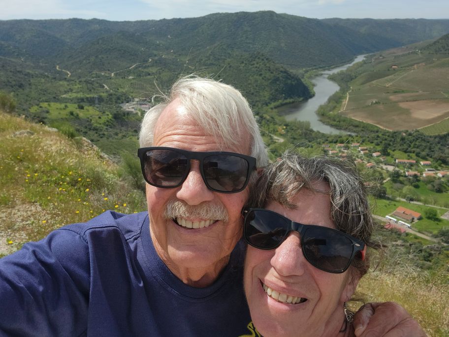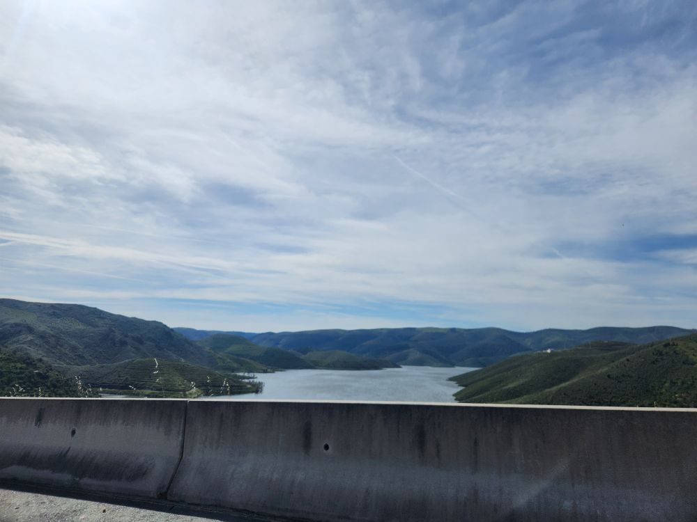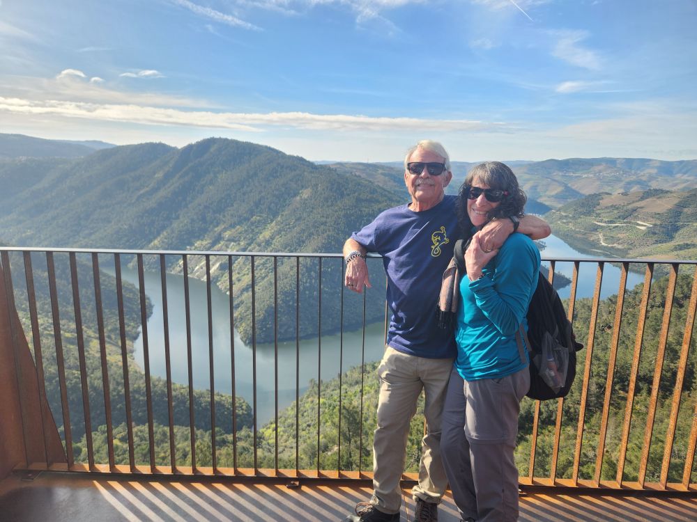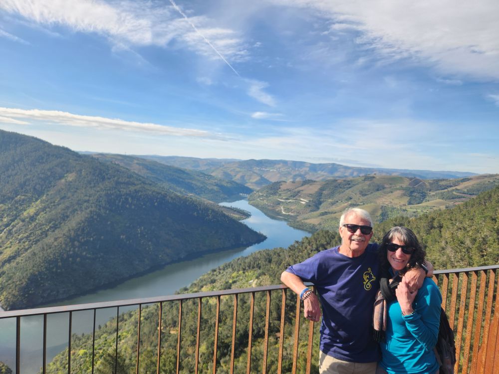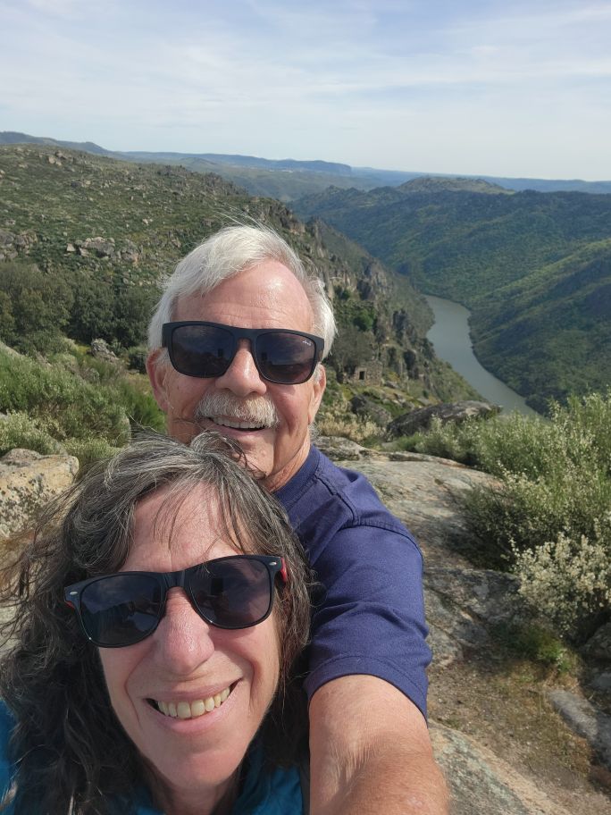 All packed and loaded, we set off for our 3-hour drive to Aldeadavila in Spain. Our first stop is the Miradouro do Ujo, a beautiful overlook high above one of the sharp turns of the Douro river. A spectacular place to drink in the scenery on a beautiful sunshining day. Made even better by the fact that we met the sweetest couple up there – from Germany most likely – who are trying to take pictures of the wife and her baby bump. She is maybe 3 or 4 months pregnant, just showing, and they want a picture here to send to her father who they have not told yet! Oh my gosh. Too sweet. So, of course we must play photographer. I have the best time taking pictures of them together, and posing them to get the best baby bump exposure, along with the scenery. Made our day! Our only regret is that we didn’t get a picture of them – or the 4 of us – but that seemed a bit, well, creepy, in a way! So – we’ll just have the memory with pictures of the Miradouro and of us, courtesy of baby bump and her hubby.