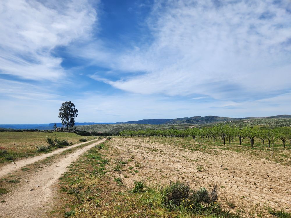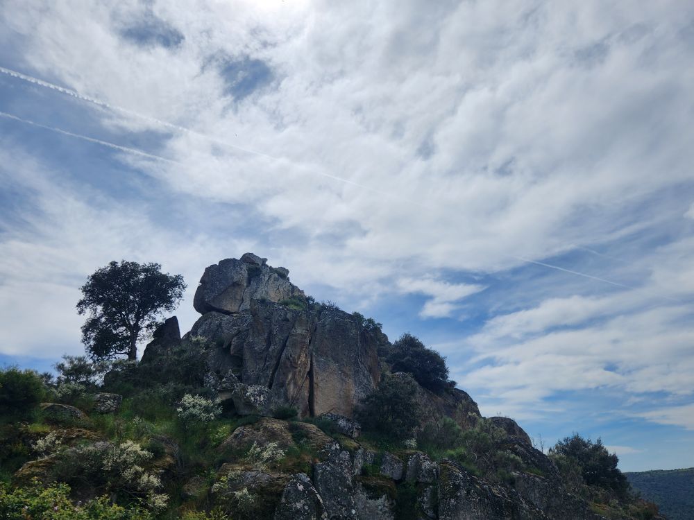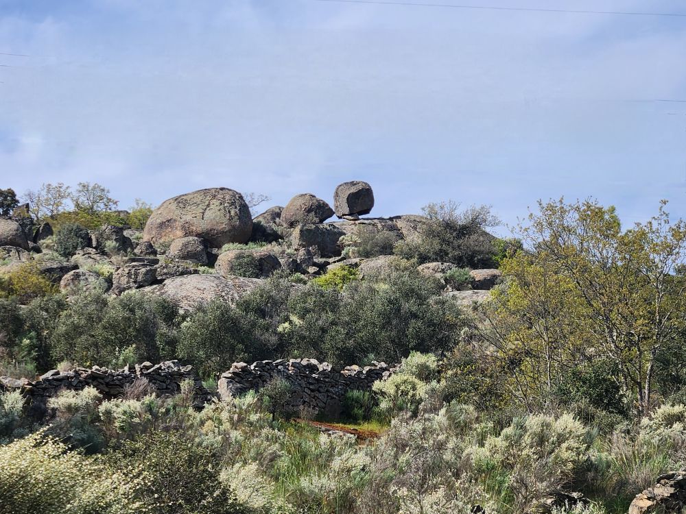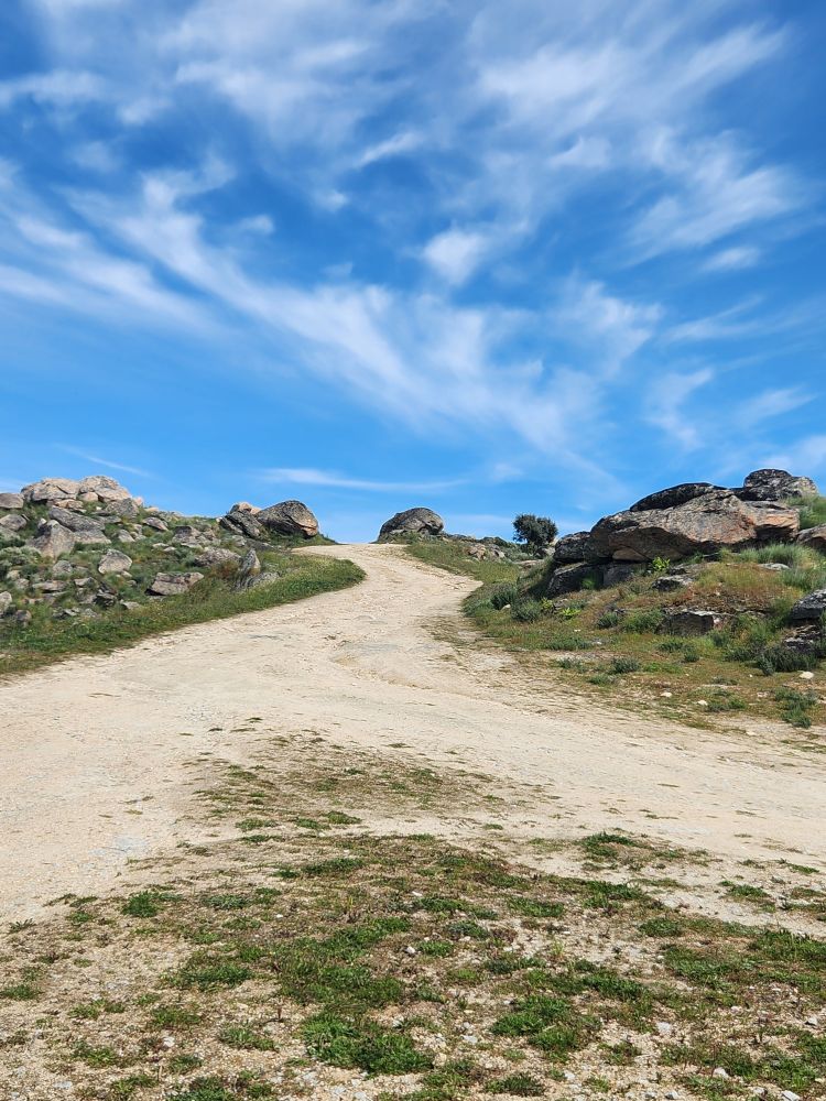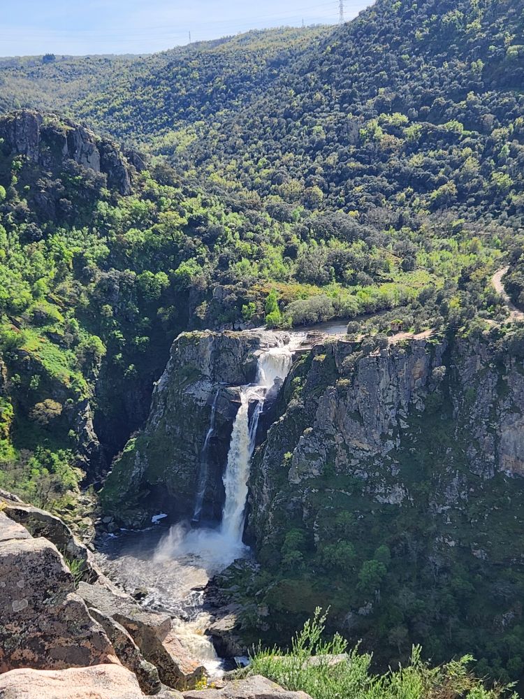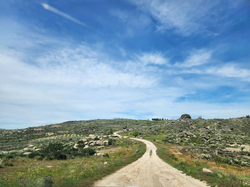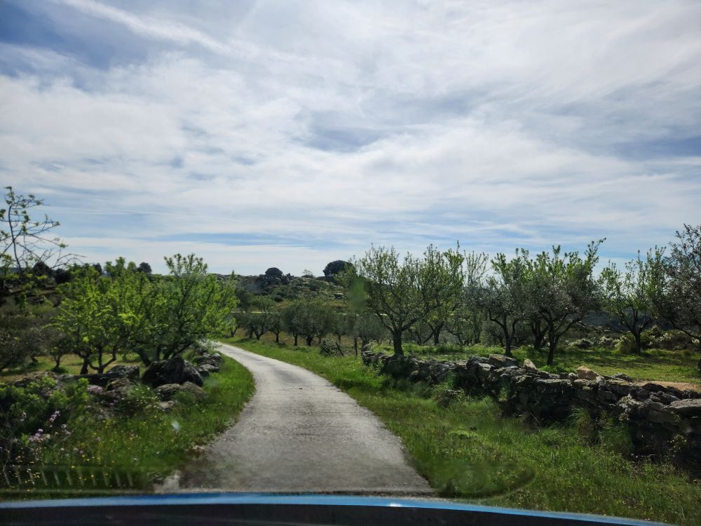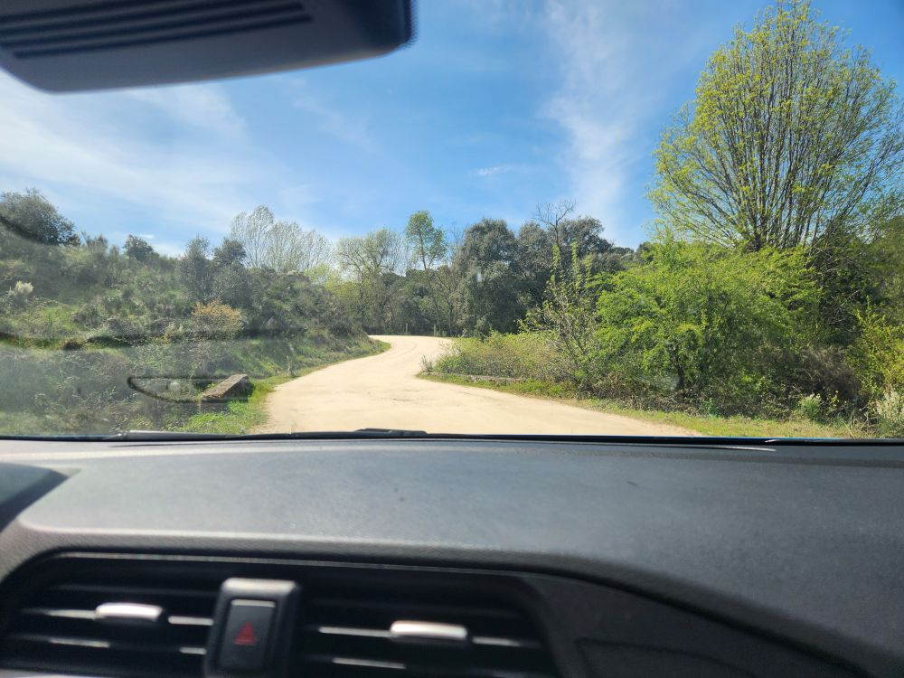 Bags dropped, we head out into the wilds of the region looking for the Pozo de los Humos waterfalls. We had already marked them on the map from AllTrails, and our sweet desk clerk had shown us where to go – so following a ballpoint pen line on the map, we head off through Masueco and Santa Cruz (little teeny towns) and out into farmland. Of course the GPS is trying to send us down these small, narrow dirt roads, but we are following hotel lady’s drawn in map coz that seems the most prudent. Even though it does send us through Pereña de la Ribera, which is another teeny little town with narrow cobblestone lanes and treacherous corners – but at least we are on paved roads for a longer time. Until……we aren’t!