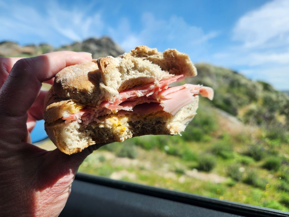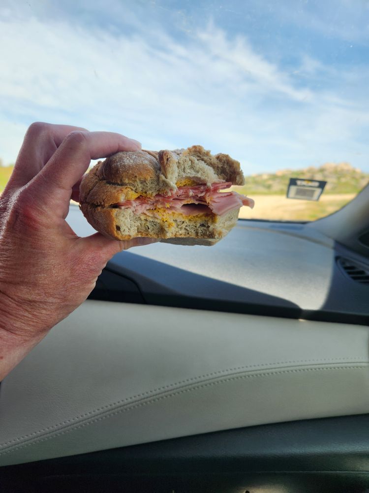 Unfortunately, while bright and sunny, it is windy as heck up here. So our plans for our picnic lunch are scuttled. We try to find something that is leeward, but can’t find anywhere we can get out of the wind. So, car picnic it is! Leftover ham and cheese sandwiches on those great rolls we got – complete with mustard of course.