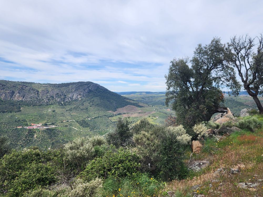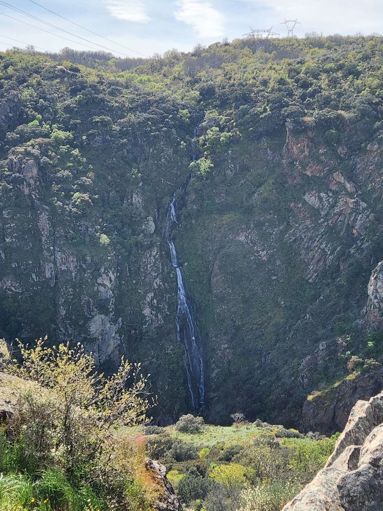 Our efforts are rewarded once we arrive at the viewpoint. The views are spectacular. Pozos de los Humos (literally translated as Smoke wells) is a waterfall that drops 50 meters down a rock wall to the Uces River with a second waterfall beside it, called Pozo de las Vacas (yep – cows – of course there would be cows!). Up above the waterfall on the slopes of the mountain are olive groves – obviously a hugely important crop in this area as we have seen driving in. There are tons of birds here too – soaring around and finding shelter in the granite rocks and outcroppings.