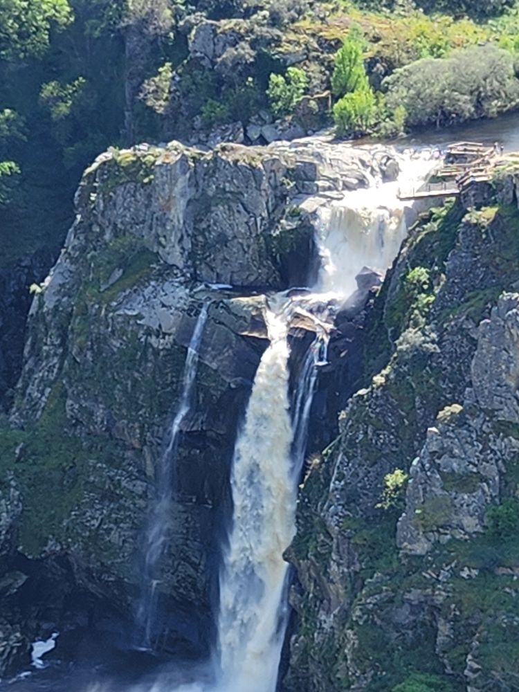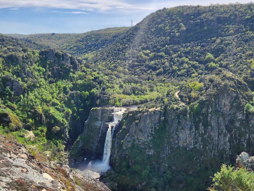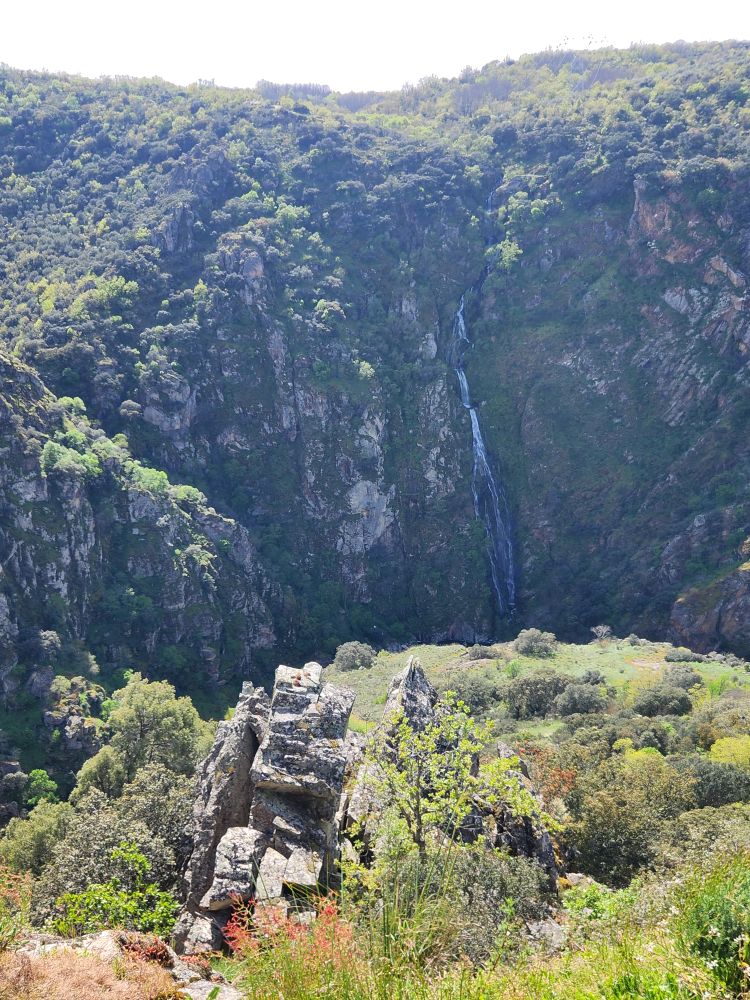 Oh well – you know, people, what can you do? We aren’t going to let their ugliness ruin this gorgeous view and place so we just take our photos and move on to the other end of the viewing area to look at the other smaller waterfall, the Cascada del Cribera or waterfall of the Cribera stream. It descends 100 meters before meeting the Uces river and while much narrower than Humos, still gorgeous to view across the river canyon.