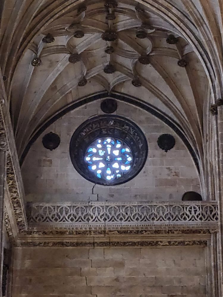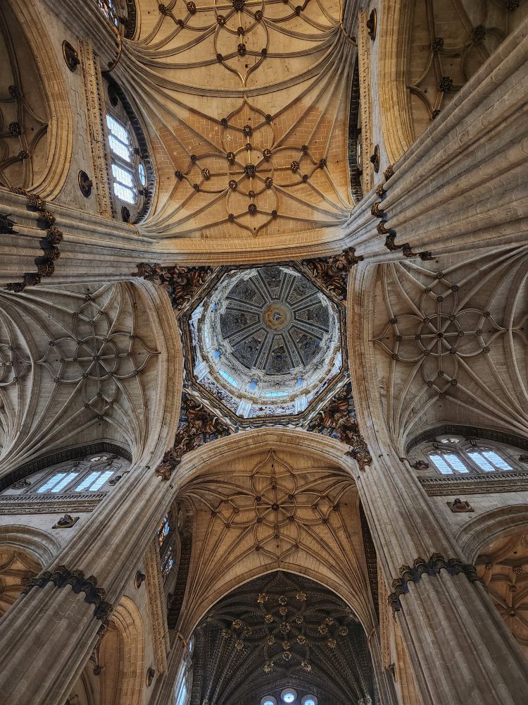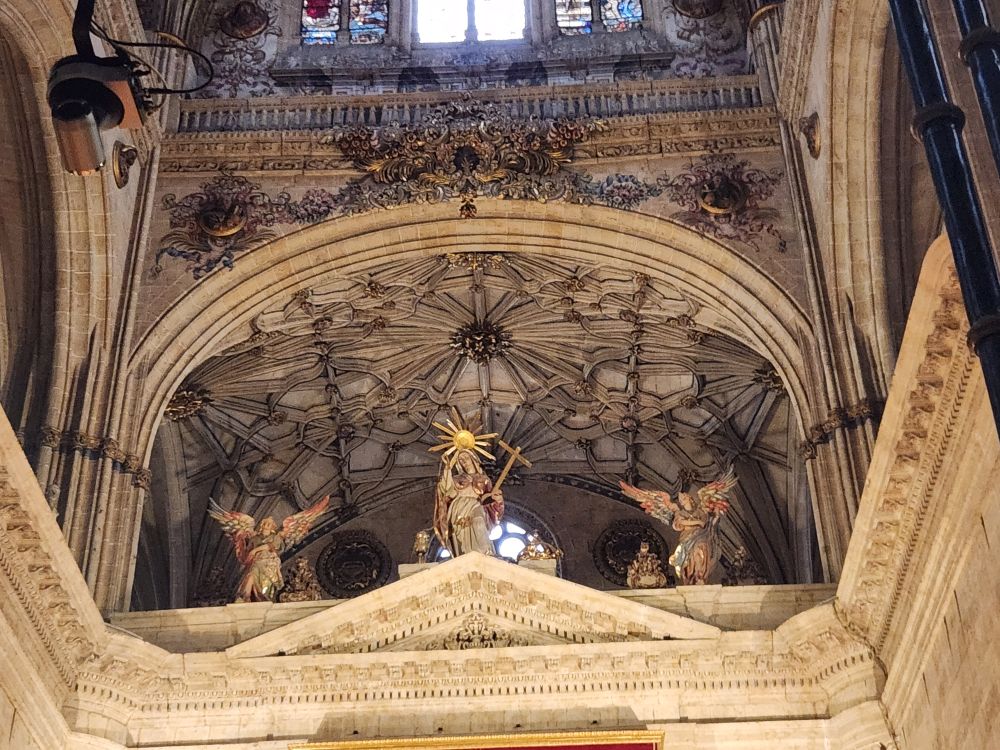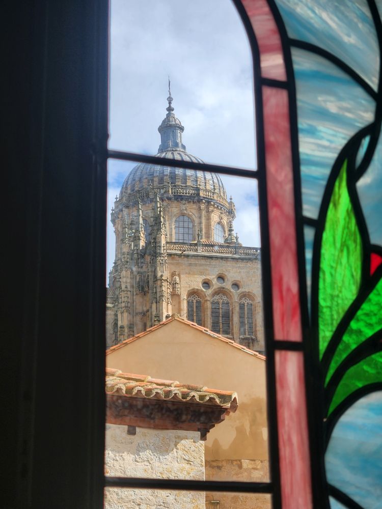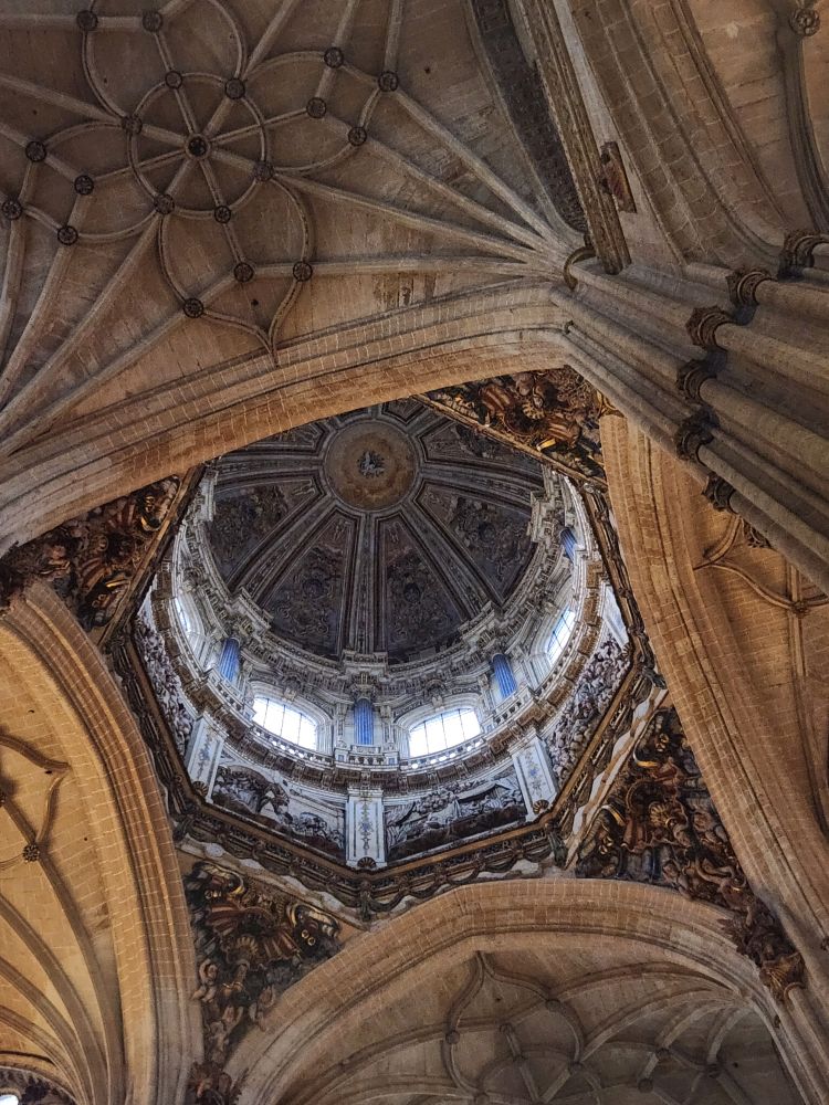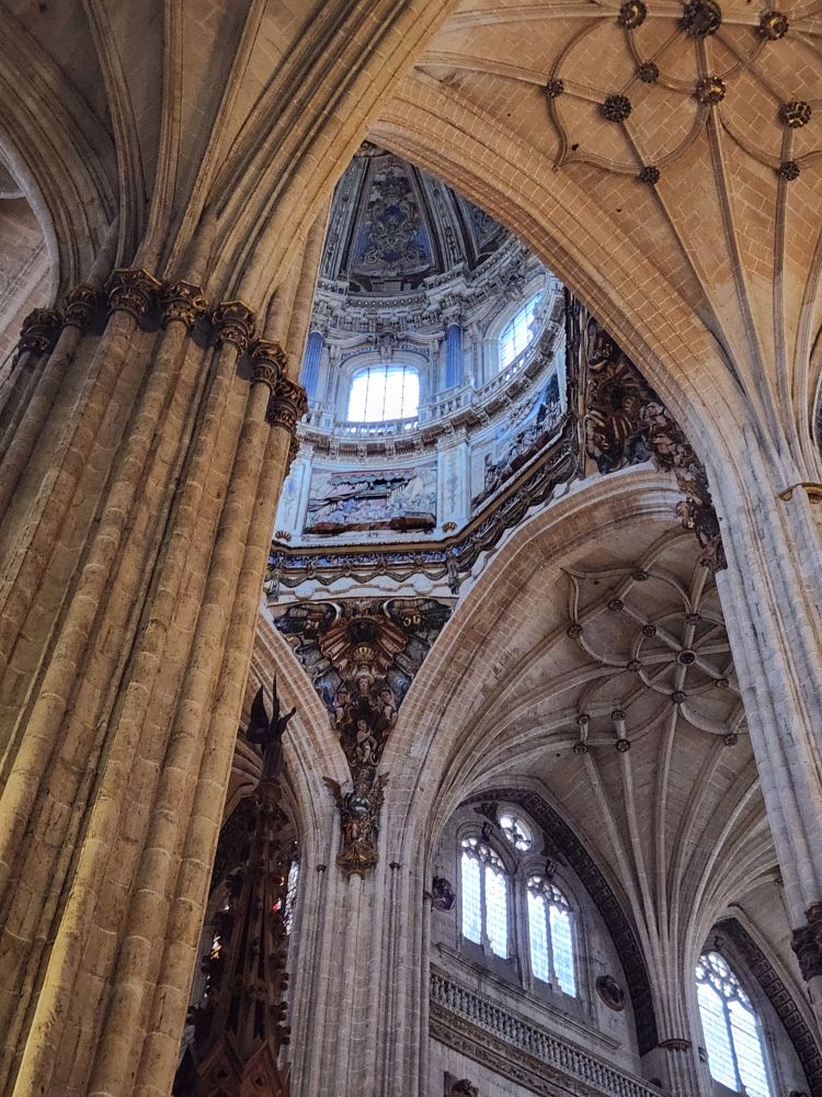 Leaving the apartment, we find our Luxor contact (whose name we still don’t know – and obviously will never know) at his desk in the lobby, and we finally check in. He is absolutely adorable, and we stop to chat for a bit. Then off we go, out into the quiet, empty Sunday morning Salamanca streets. Past La Clerecia and the Casa de las Conchas we visited yesterday, and onto Catedral Nueva for our pre-booked tickets and self-guided tour.