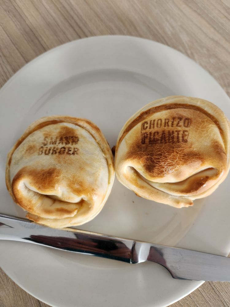 Back at the apartment, we organize ourselves for our final days in Portugual, and then decide since we are not that hungry, and don’t want to wait until 8pm to try to find food, we will have Argentinian Empanadas from the place a couple of blocks away. We have walked by this place multiple times in the last 2 days and they have tons of different types of empanadas – so we figure, why not? We’ve got wine, we’ve got beer, why go anywhere? And the empanadas are adorable! Each has the type basically branded on the top of the dough so you don’t get confused on which is which. Brilliant! Ed gets a Chorizo picante and a Smash burger (tastes like the real thing! It is great!) and I get a Croqueta Jamon and an Oh My Goat! (filled with goat cheese and caramelized onion – Yum).