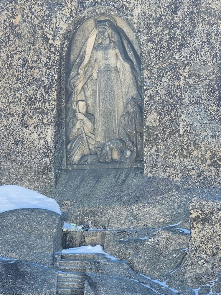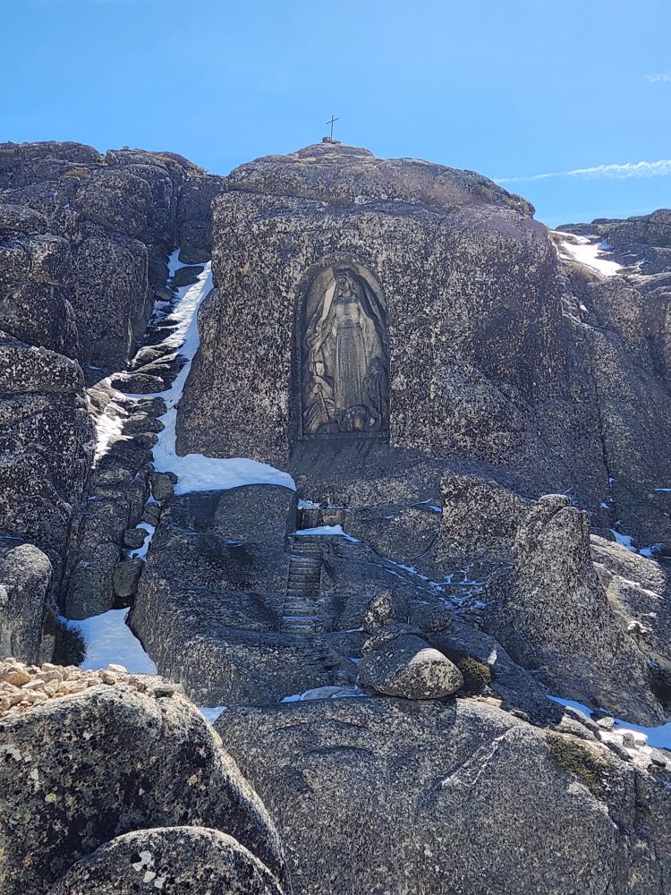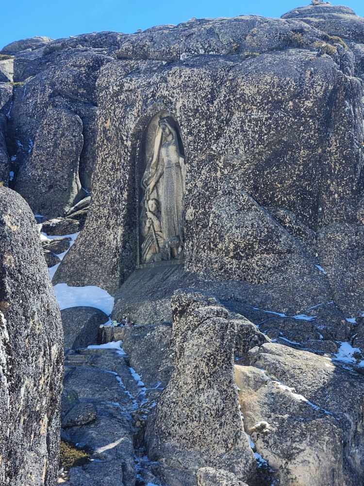 We make our turnaround point at the Covao do Boi – even though there are probably a lot more scenic views as you continue up the mountain, we do have a plane to catch and 3 more hours of driving – which is just as incredible as yesterday, even more so in the sunshine. And, we noticed something we didn’t yesterday – the carvings of the Virginia Mary that we totally missed in the snow yesterday. The carving was done to honor the protection granted to the shepherds who work in this region. So cool.