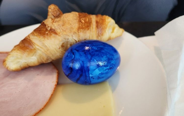 Gym complete, showers done, suitcases packed, we head off on our mile long walk back to the terminal, check in our bags then go off in search of the LuxxLounge for which our Priority pass allows entry. We’ve not been here before since it is airside and outside security. We’ve only flown connections out of Frankfurt and haven’t wanted to change going outside security and passport control for a lounge. Probably a good decision in the past because this lounge is the pits. In a word. Crowded. Hot. Little to no food (seriously, picked over pastries and charcuterie – and that’s about it), no one cleans up – at least not for about 45 minutes, then a woman comes by to pick up plates. The passengers are jerks, one guy is sleeping on a bench booth seat taking up 4 table places. It is so not worth it at all, but we are here, and it is our breakfast. The only cool things are the hard boiled eggs which are all painted/stained like easter eggs.