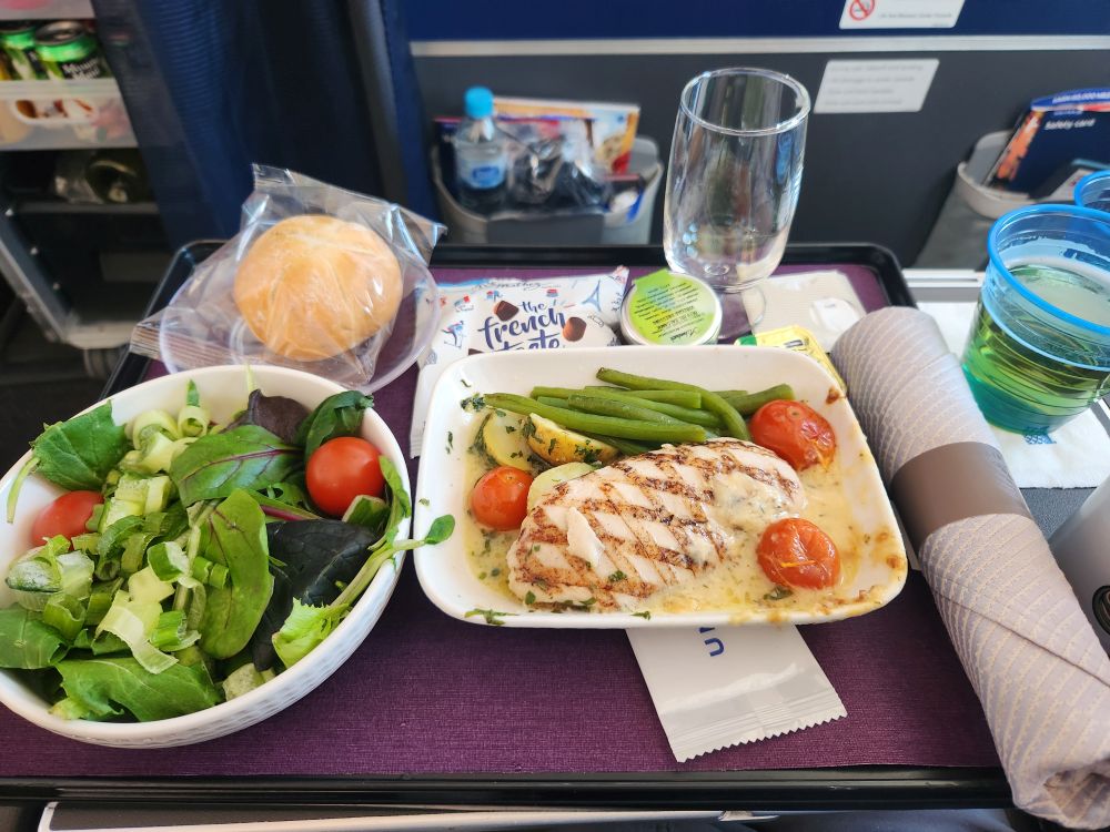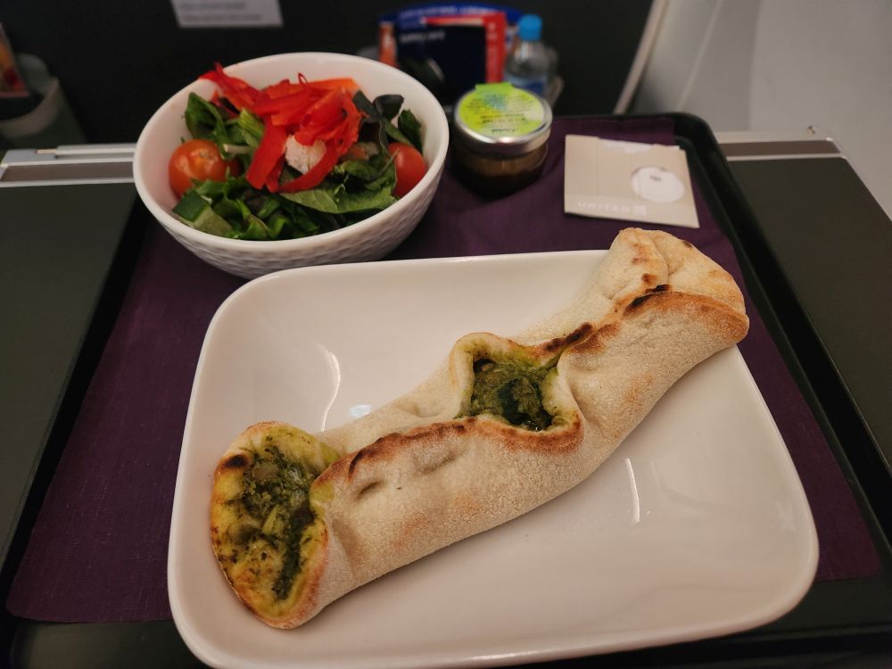 Beautiful scenery as we take off. Incredibly good lunch of grilled chicken with a lovely mustard cream sauce, and then movies for Ed, Blog for Cathy. Mid-flight snacks with wine and beer, then another “snack” of pesto chicken pizza – I couldn’t find any chicken, but the crust (which was rolled in a very creative way) was actually really good if you scraped most of the pesto off. Salad was frozen – seriously frozen – but it made it really easy to pick off the pepper strips and the cucumbers. LOL.
