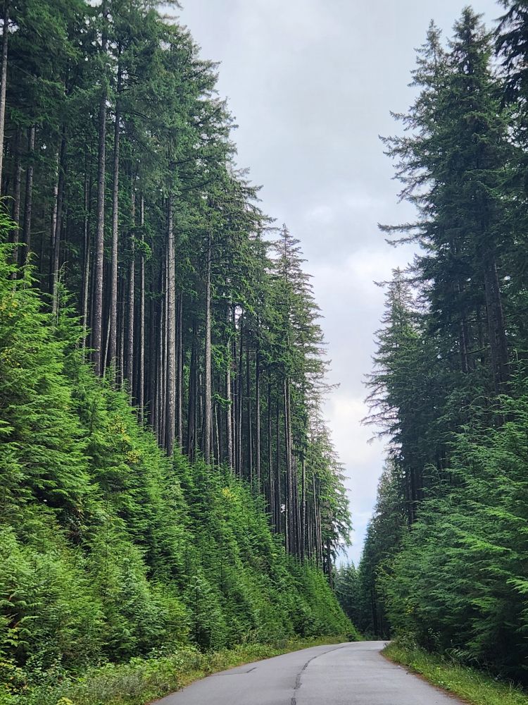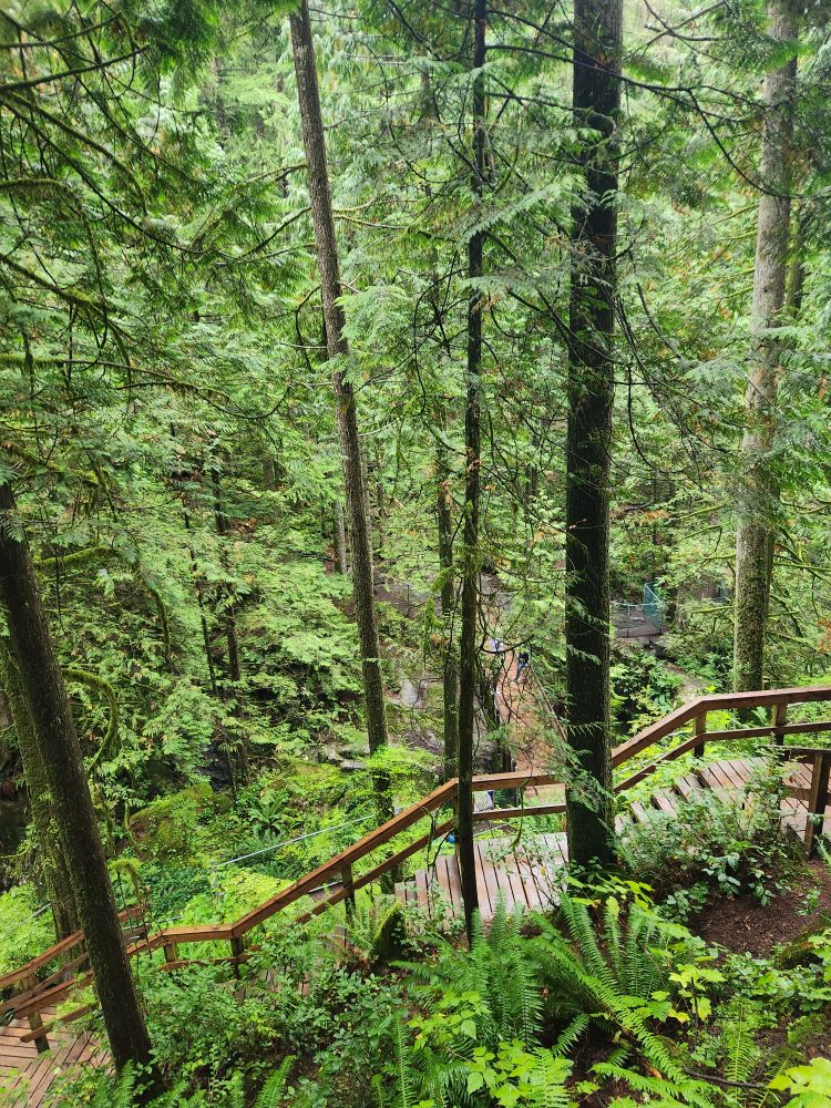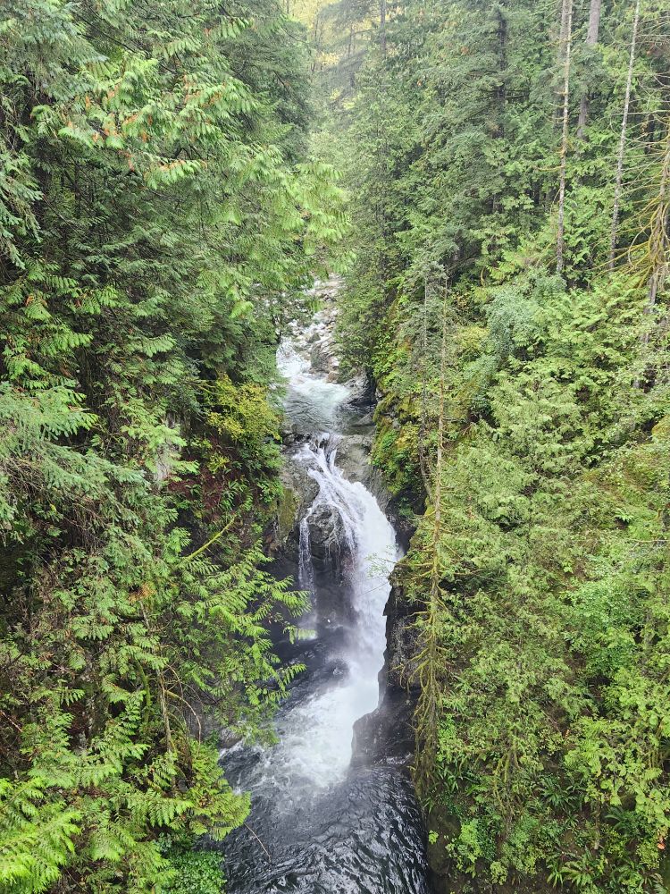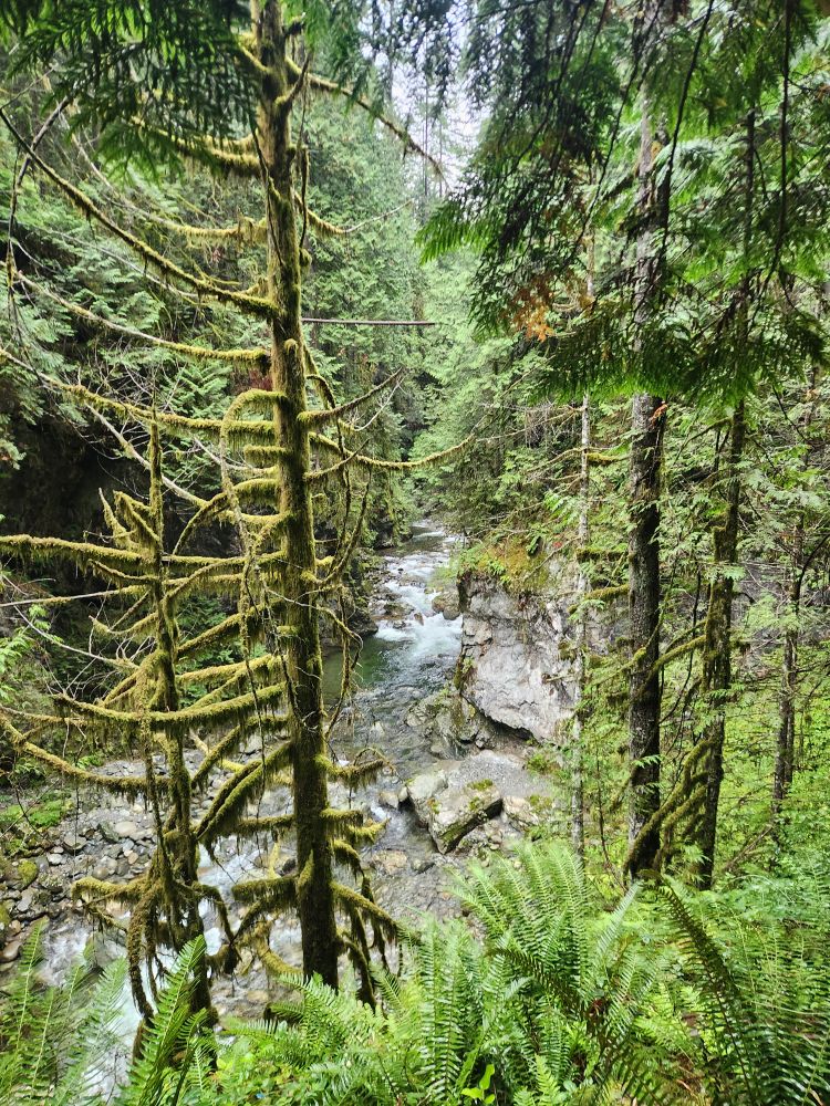 As we head out into the forest again, this time circling around and down (oh down so many stairs) to the Twin Falls area of the park. It is all so gorgeous and green with the young hemlocks, red alders, black cottonwoods and Sitka spruce all around us. We are loving this wilderness and this area. Arriving at the Twin Falls , we take what pictures we can – while it is so very pretty, there really isn’t a good viewpoint to get the total effect of the falls, but we do what we can from above on the bridge, still enjoying the whole atmosphere!