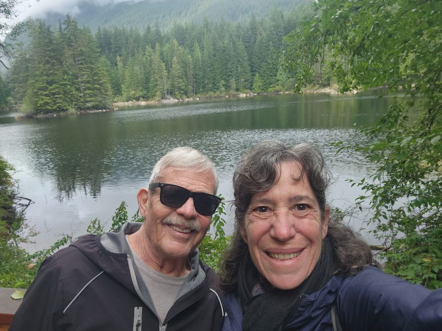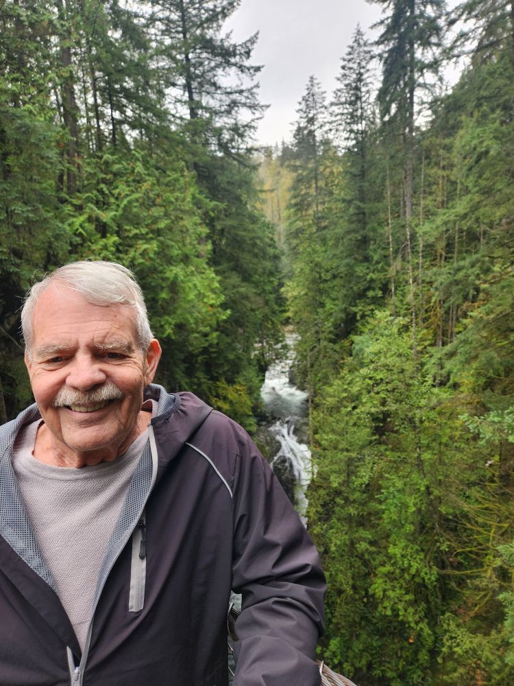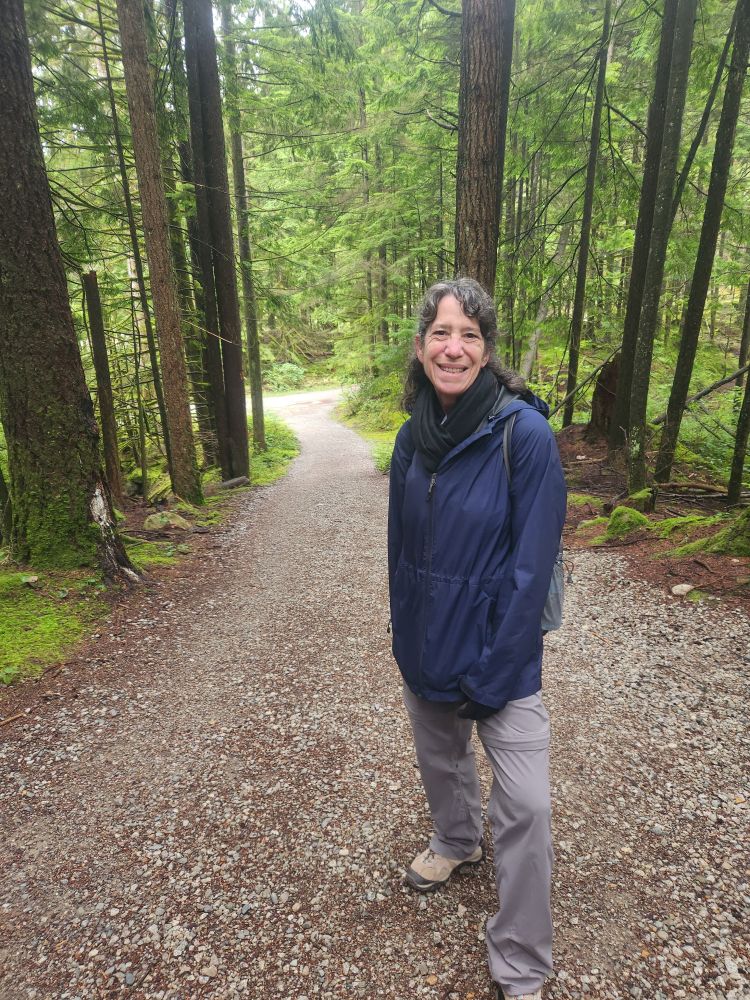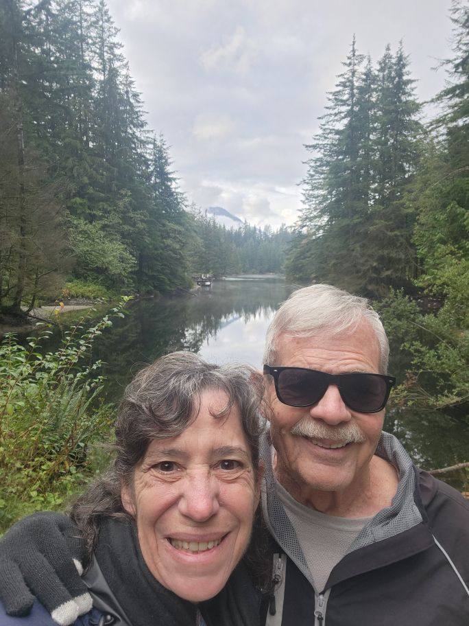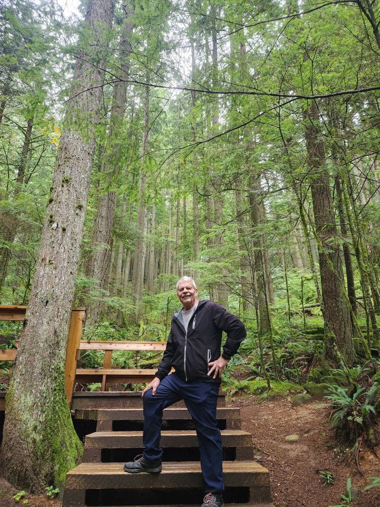 As we head out into the forest again, this time circling around and down (oh down so many stairs) to the Twin Falls area of the park. It is all so gorgeous and green with the young hemlocks, red alders, black cottonwoods and Sitka spruce all around us. We are loving this wilderness and this area. Arriving at the Twin Falls , we take what pictures we can – while it is so very pretty, there really isn’t a good viewpoint to get the total effect of the falls, but we do what we can from above on the bridge, still enjoying the whole atmosphere!