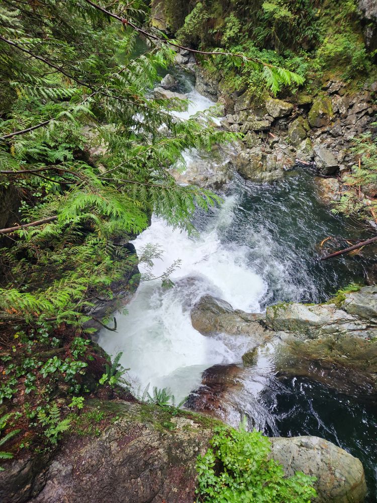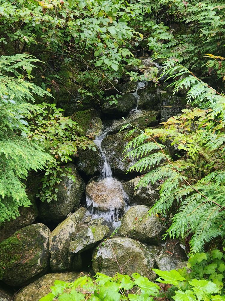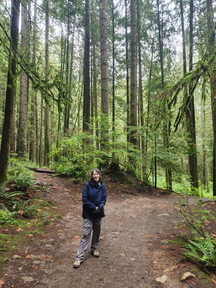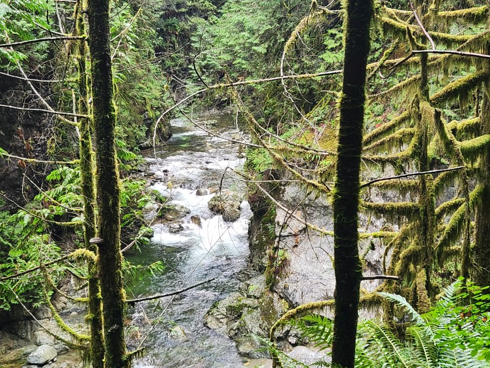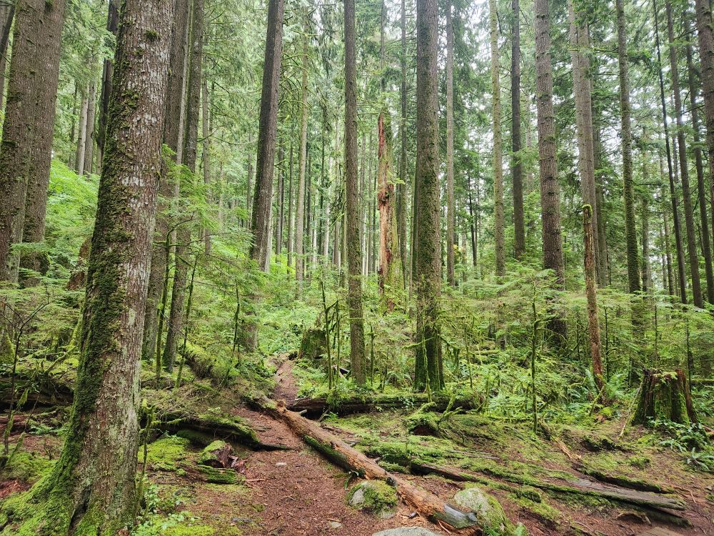 At the top of the loop, we veer off on the connector trail that leads us to the Seymour Trailway and begin a long trek up through towering firs, passing little waterfalls alongside, and marveling at the rocks, the moss, the scenery.