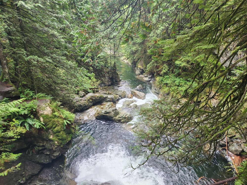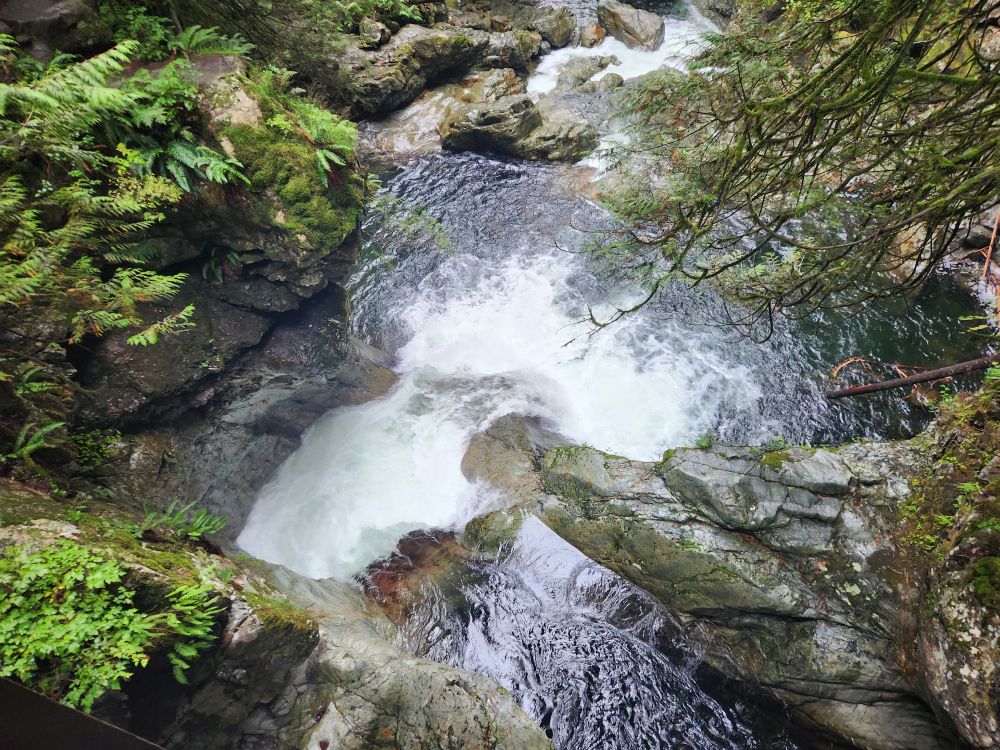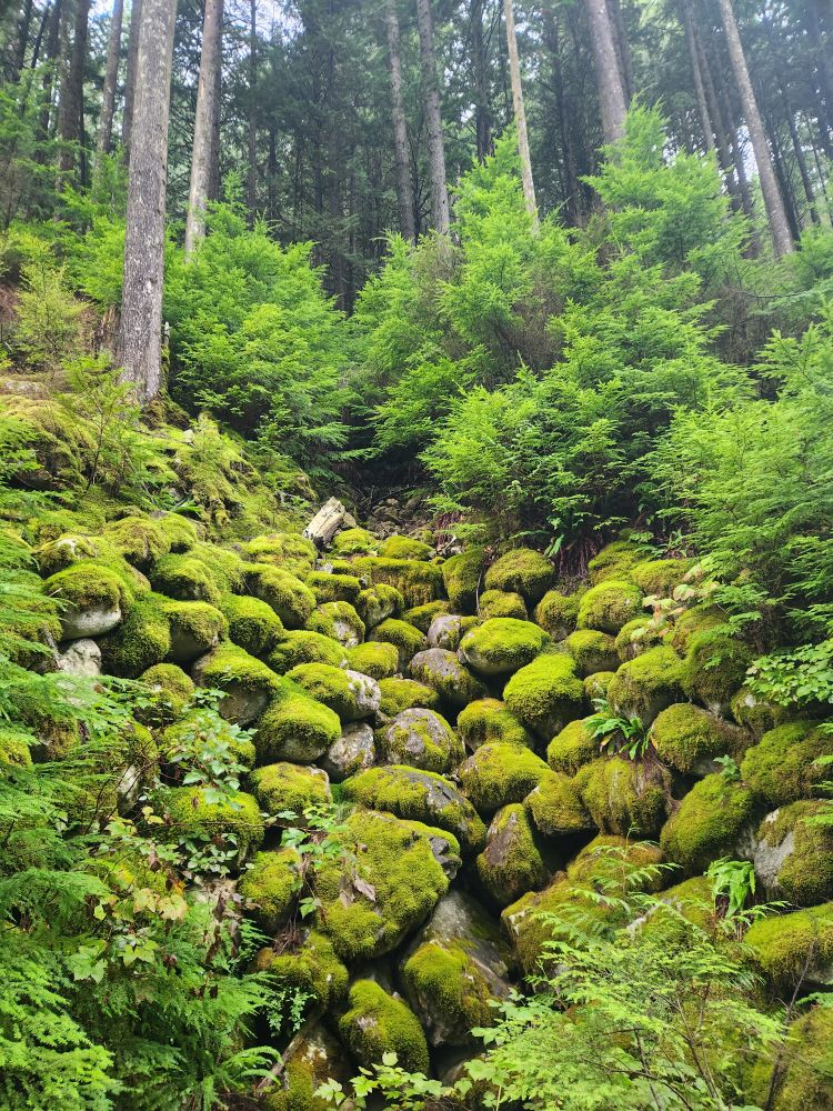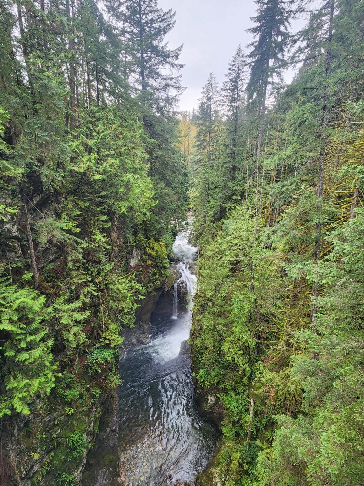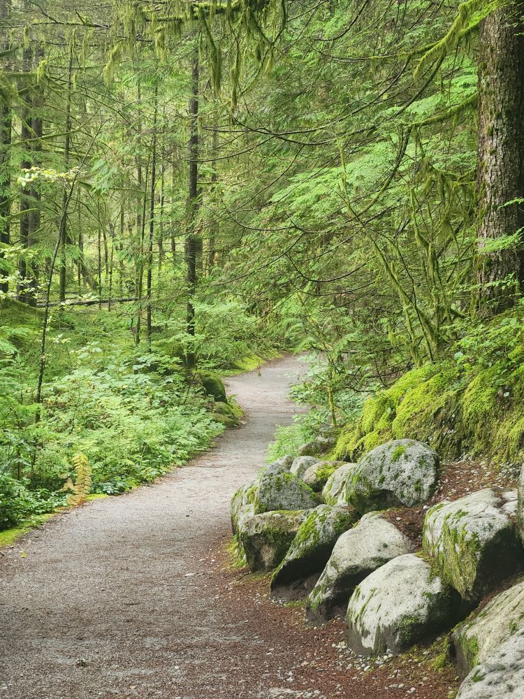 At the top of the loop, we veer off on the connector trail that leads us to the Seymour Trailway and begin a long trek up through towering firs, passing little waterfalls alongside, and marveling at the rocks, the moss, the scenery.