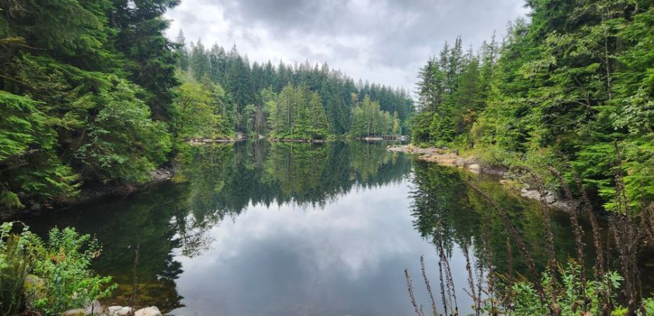 We quickly drink our coffee and get geared up to go out exploring some of the trails we’d identified in our research. Today we decide to try the Rice Lake Loop and Seymour Valley trailway on the other side of Lynn Canyon. Mostly because the trailway is a paved road that has been turned into a hiking/biking area and we know it has been pretty wet and muddy here lately. The drive over takes us about 40 minutes, through North Vancouver and then up through the Capilano University area and out into the forest. Arriving at the parking area, we are literally the only car there – another bonus – and we strike out through the park to the rice lake loop.