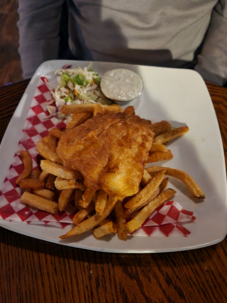 Entering the pub, we are a little unsure whether we seat ourselves or wait, and after an uncomfortable few minutes at the door, a waitress does come up and ask if she can help us, then seats us upstairs after a brief conversation. Apparently we are supposed to just seat ourselves….for future reference, which we more than likely will not need as we plan to cook at home for our next 2 nights! But anyway….we settle in to a great little pub with some good food choices. I order the Crispy Chicken Burger and Ed the fish and chips then sit back and watch some of the football games on the huge screens hung all over the place. Our food comes – but the waiter who brings it gives me what he calls a Chicken Club. I tell him I ordered the Chicken Burger, and he says, oh, yeah, I misspoke. Ok. Except this is the chicken club! Oh well – it isn’t what I ordered, but it is the same price, and it is pretty good. Not worth the hassle of waiting for another order to come out, etc., etc. All in all, it was a good, fun meal and our car was still in the grocery store parking lot without any tickets or boots – so all is well!
