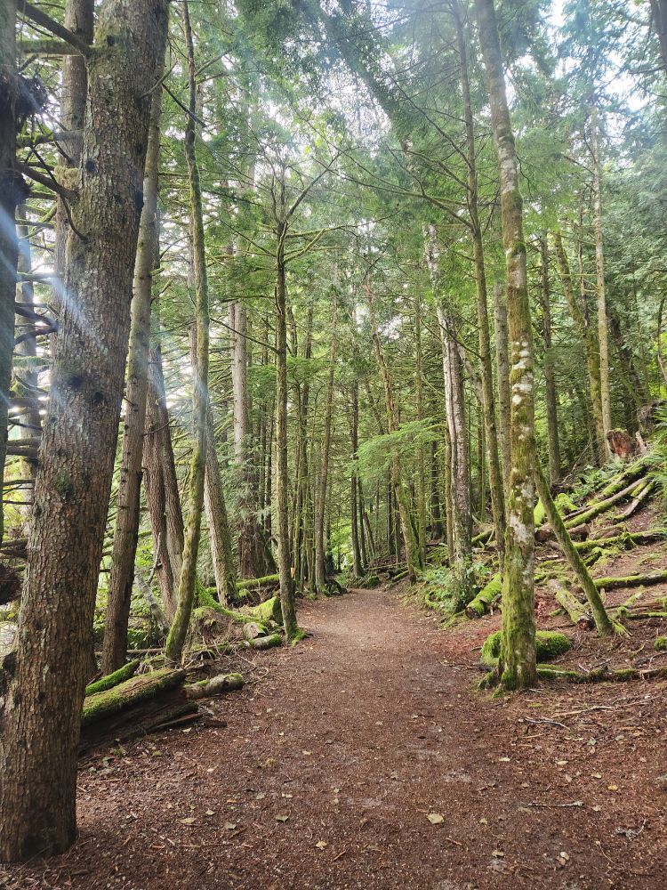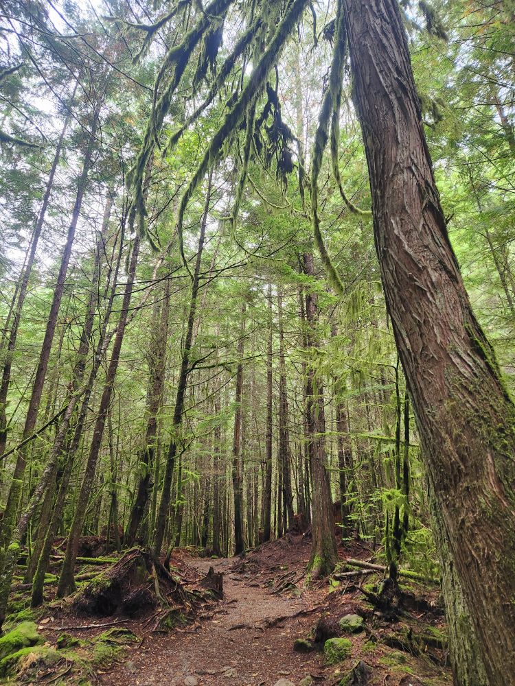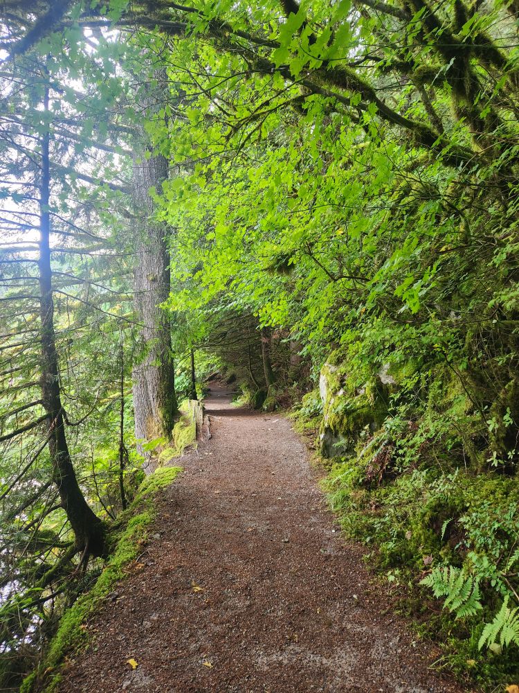 There are so many hikes up there to choose! We ended up doing a modified 4 lakes hike in Alice Lake park. Basically 1 1/2 lakes – circumnavigating all of Alice Lake and about 1/2 of Stump Lake. We luck out with a parking space – because of course, we are fairly early (but not even as early as normal for us!) and head out into the gorgeous moss covered forest that covers this part of the world. It is just magical. The trees, the greenery, the placid lake with the amazing reflections. An excellent, if not chilly hike through a small portion of this amazing park (that, btw, is a also a huge campground with very hardy souls in their tents and caravans cooking breakfast as we wander about!).