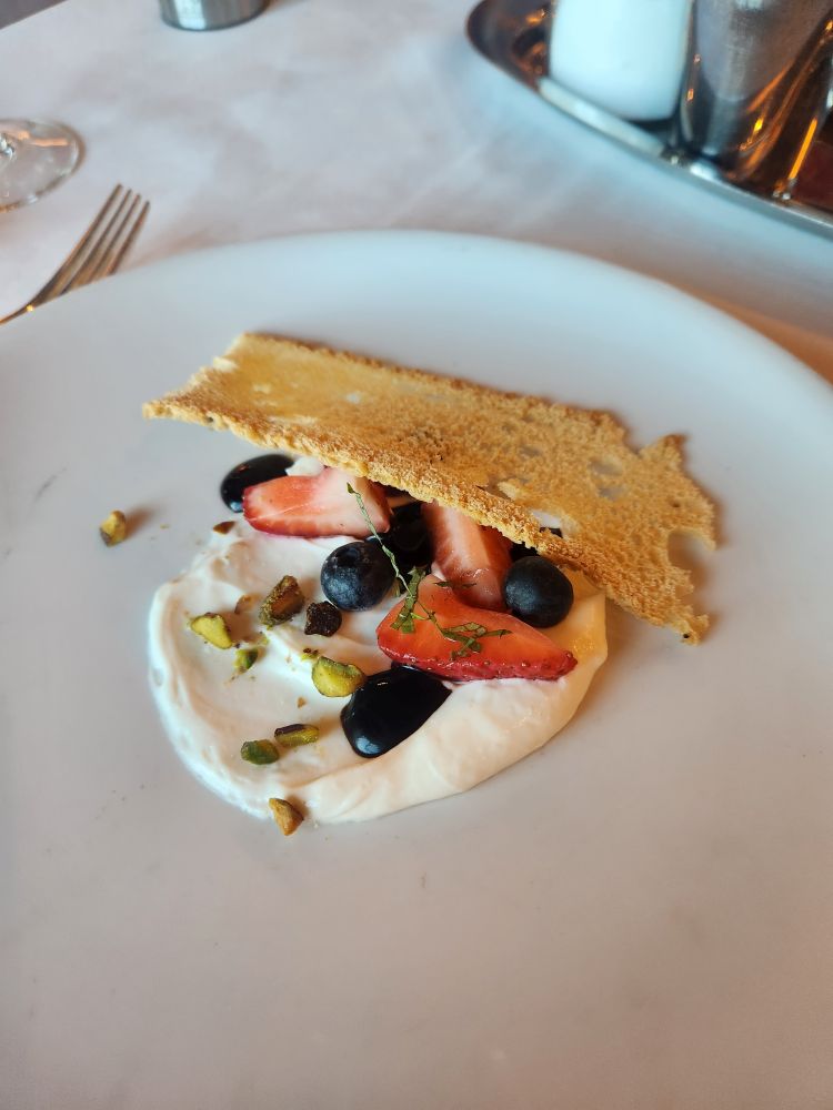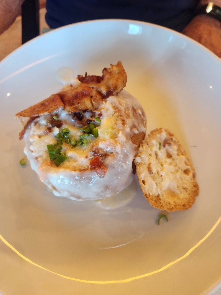 Afterward we hit the Alaskan “Brunch” in the dining room for the halibut sandwich – oh yeah! Very good – the bread bowl chowder and the goat cheese spread as starters. So artfully done I actually take a picture of the starters – not normal, unless we are at a Chef’s table on Azamara. But these 2 dishes were works of art! And combined with that halibut sandwich a very big lunch! Then we spend the next couple of hours watching the sail in from various places about the ship.