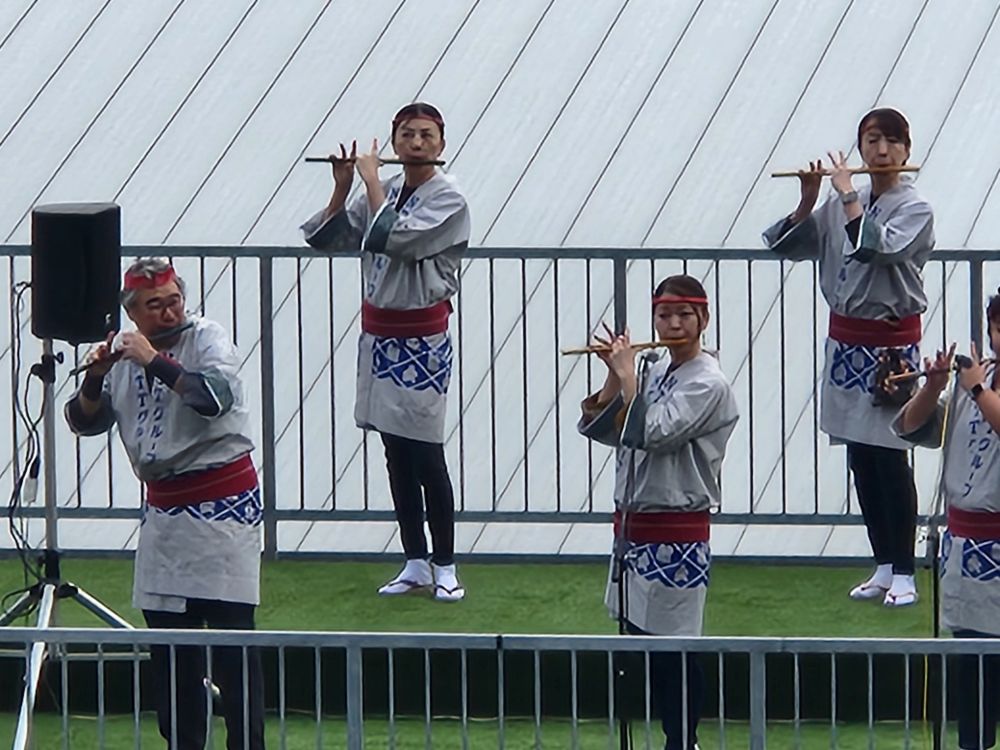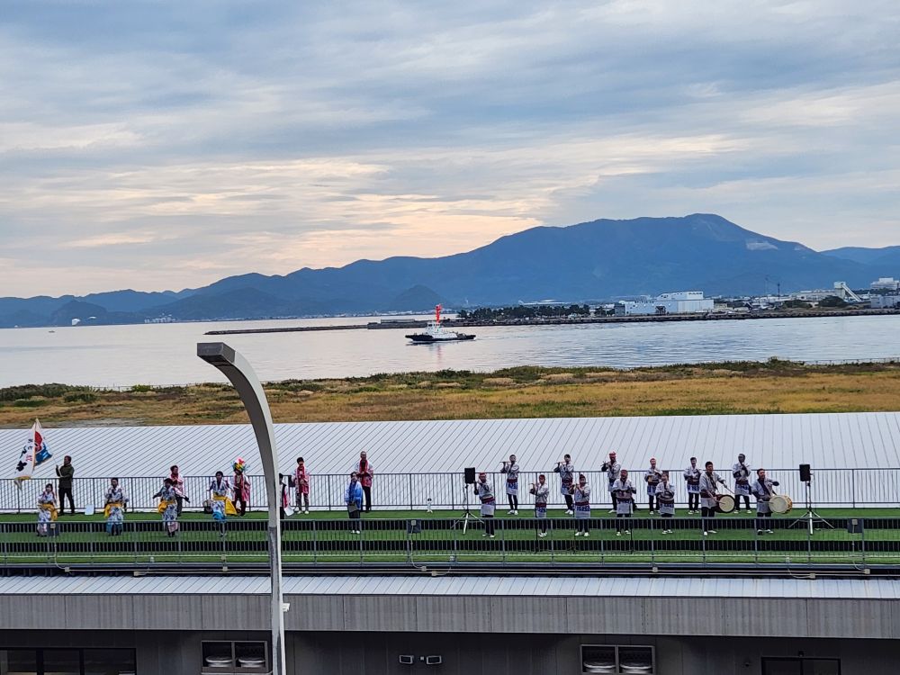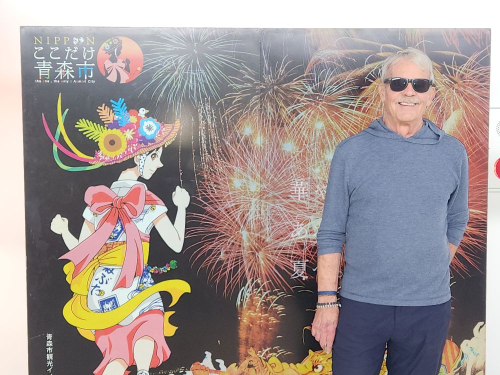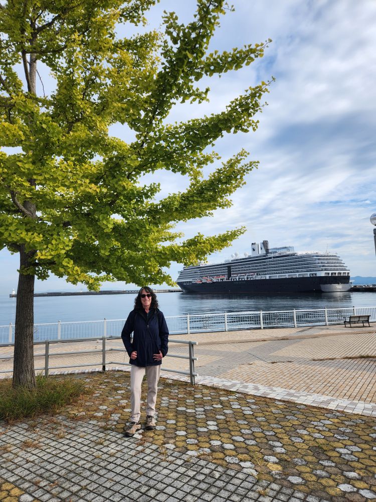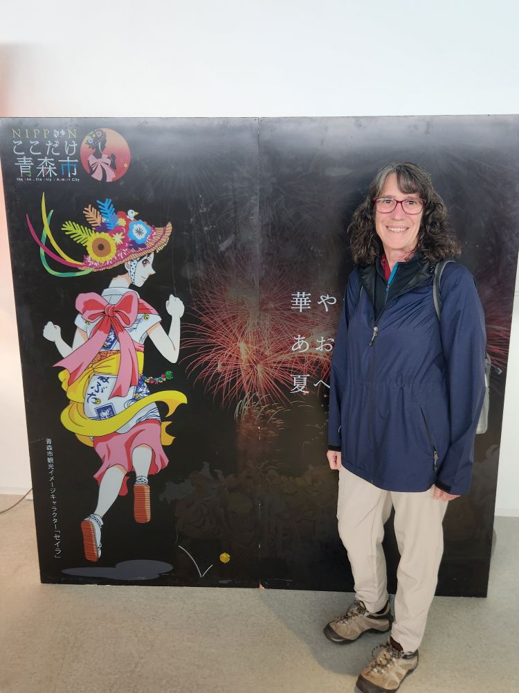 A cloudy but dry dawn greats us. We’ll take it. Sort of cool with a stiff breeze, will be good for us to walk all over this huge port town. We were met by our first welcome ceremony – the waving flags, a great band and some festival dancers. Everything here is focused on their huge Nebuta festival that occurs every August. The music and the dances are all what is performed during this festival. There are even murals of the festival characters on the dock itself.