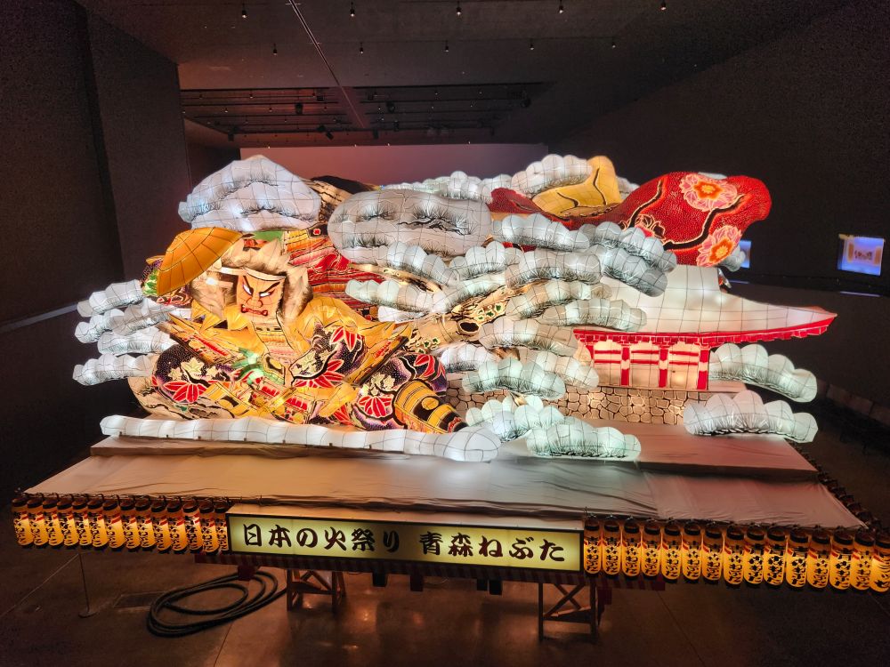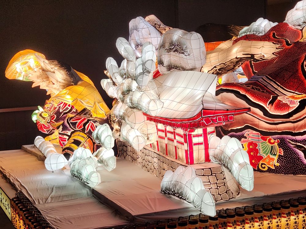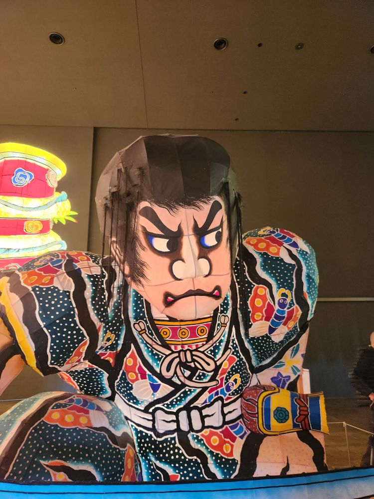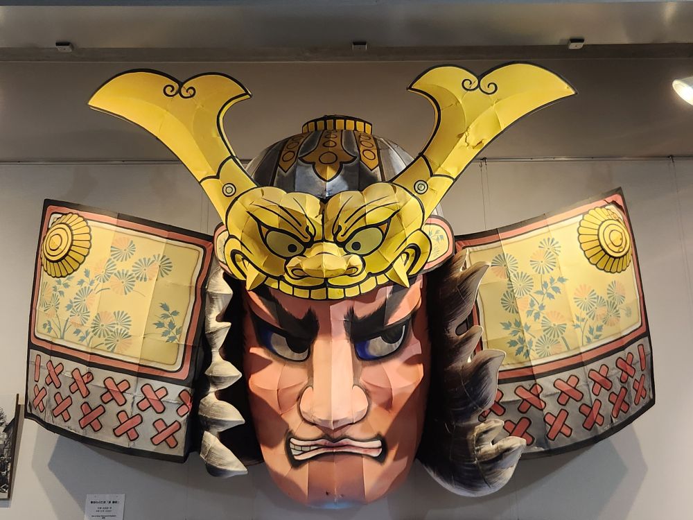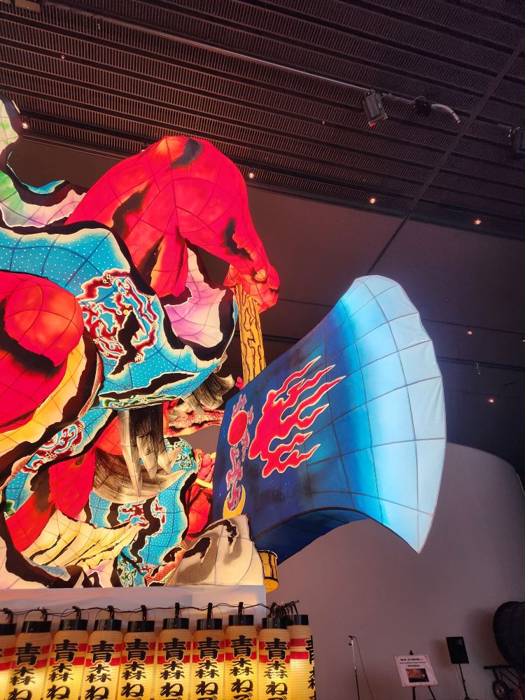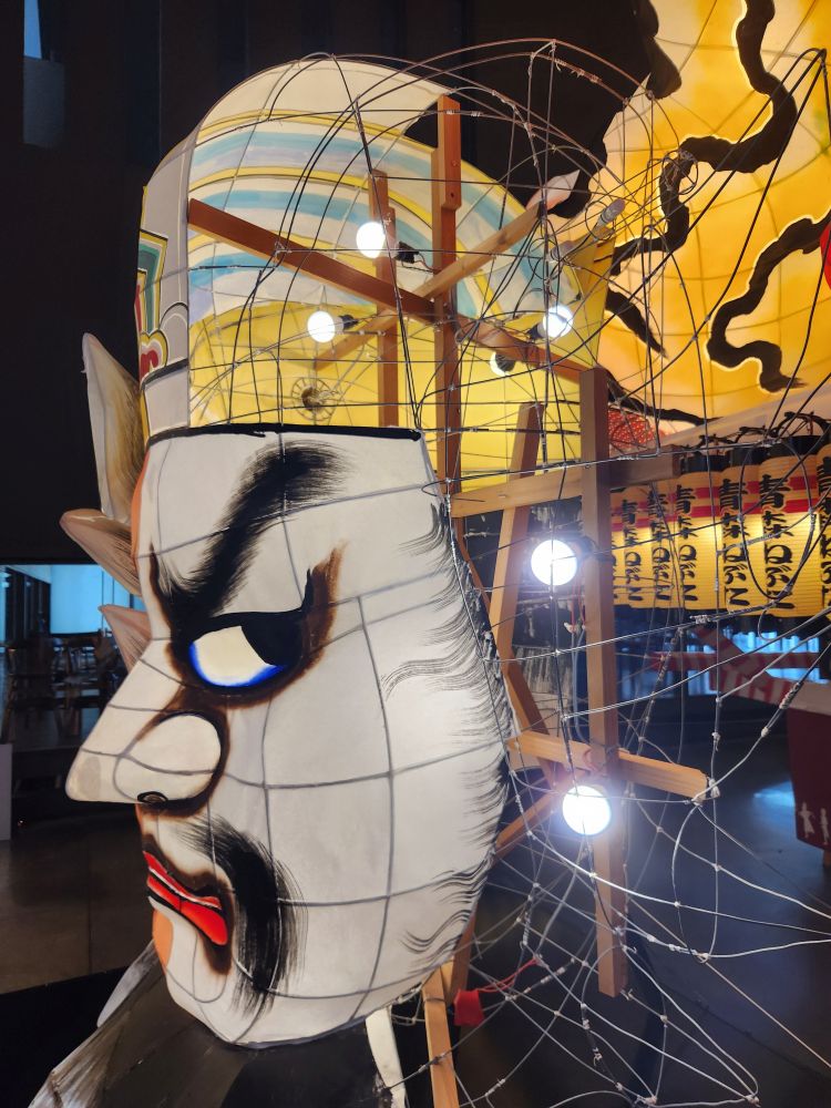 The hallway opens up onto a viewing platform that has a video about 3 Nebuta masters – Kitagawa, Sato and Shikanai – as well as a mask made by each artist. The masks themselves are about 100 years old and made with hemp for the eyebrows and beards. It is also from this platform where we can see our first real float from above. It is a great vantage point to see just how large and detailed these astonishing floats really are, measuring 30 feet wide by 23 feet deep by 16 feet high and weighing in at 4 tons including 800 lights and a power generator. Humongous!